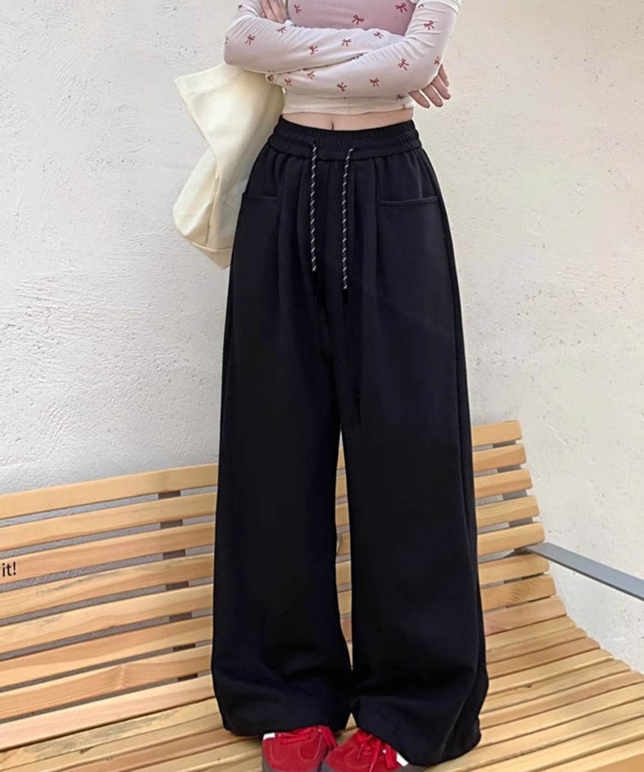 リラックス感のあるワイドシルエットと、ウエストのドローストリングデザインが特徴のカジュアルボトムス