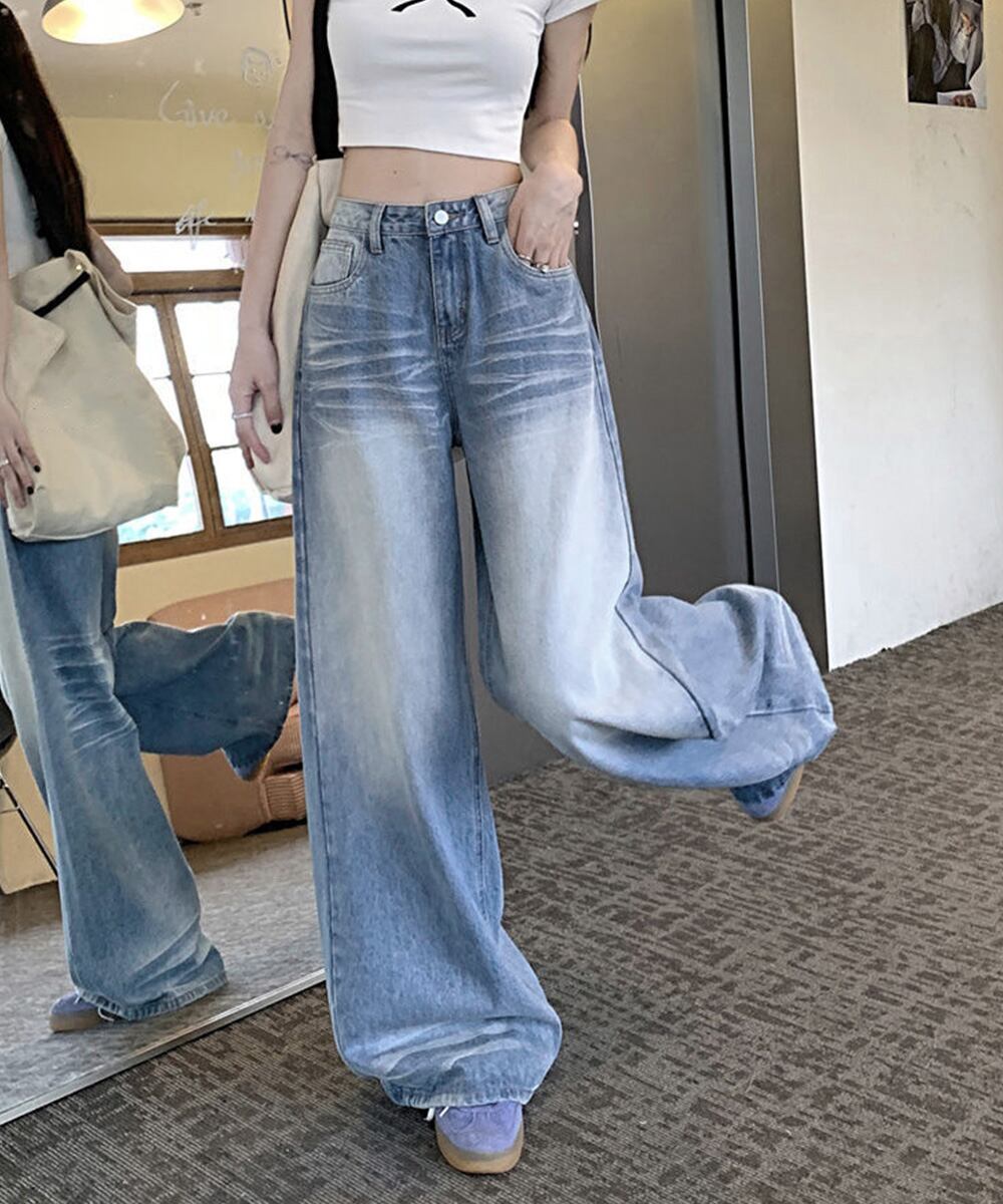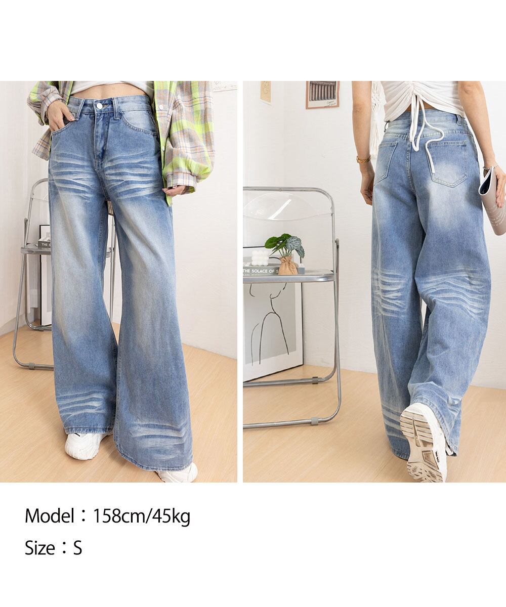 ジーンズ ゆったりシルエット ウォッシュデニム 美脚脚長ワイドパンツフルレングスジーパン 韓国ファッション着やせボトムス