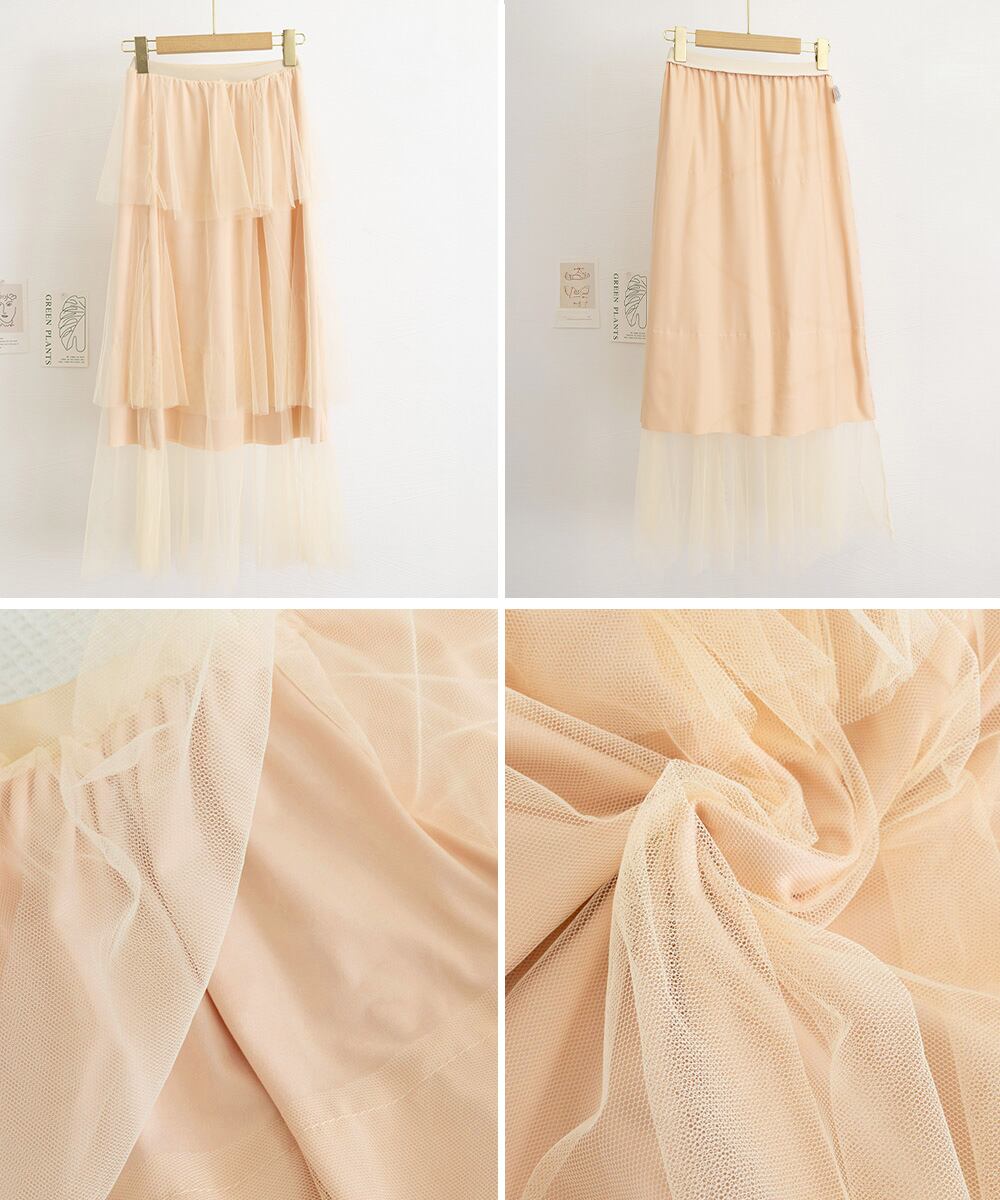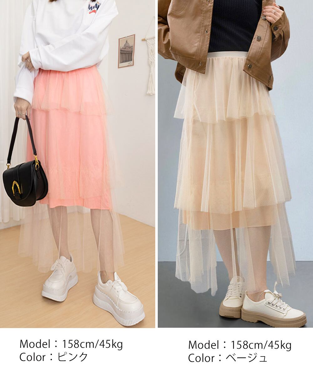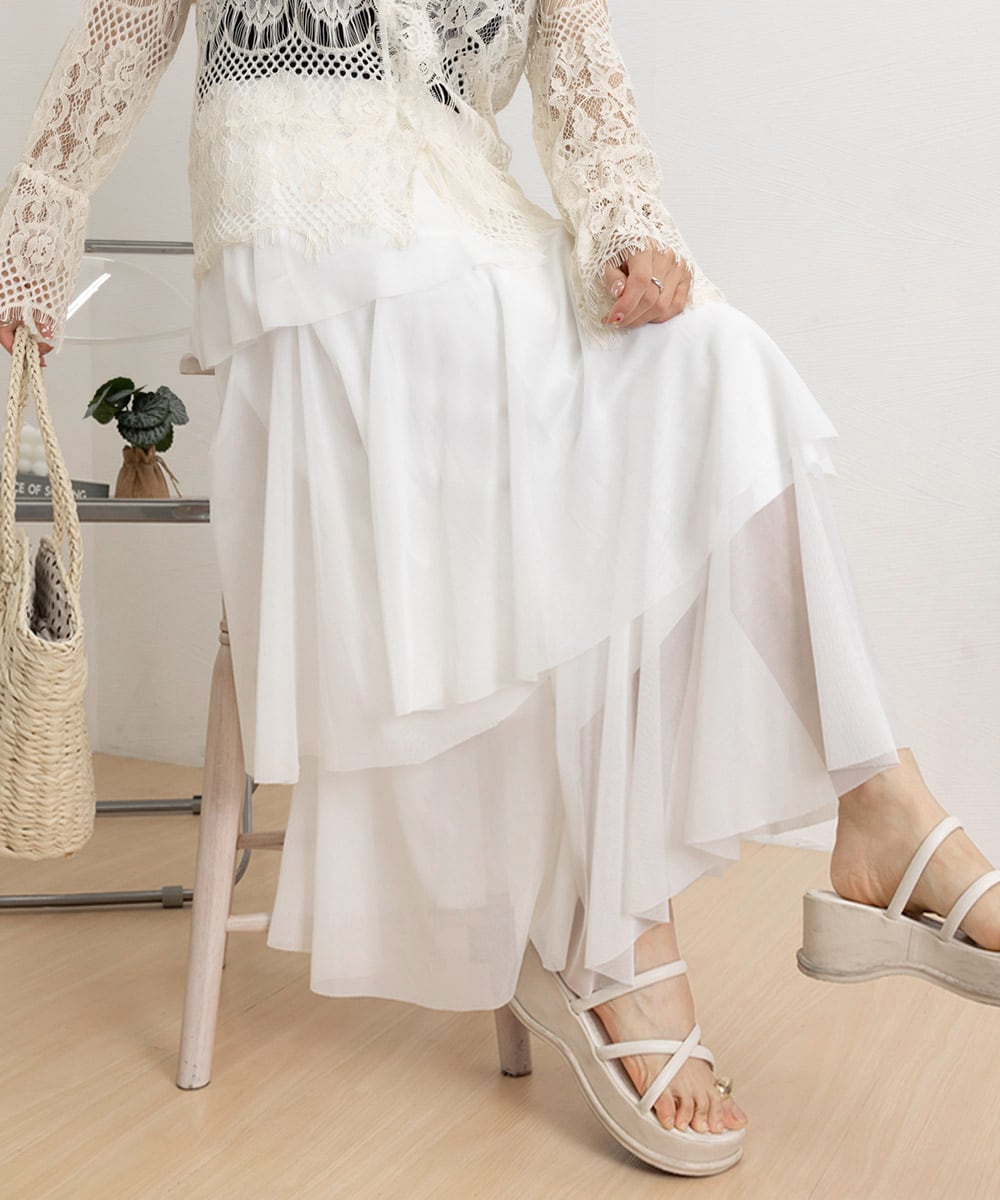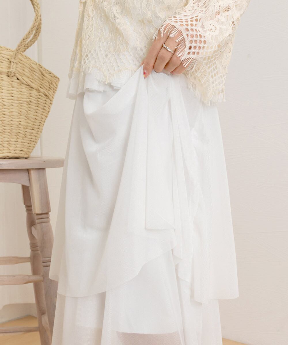 軽やかなチュール素材がエアリーなシルエットを演出するティアードスカート