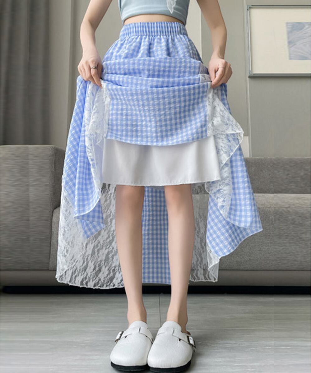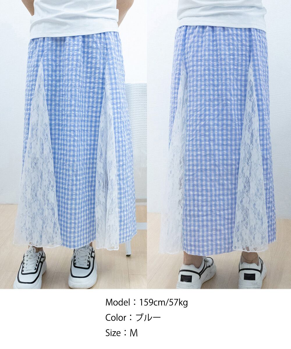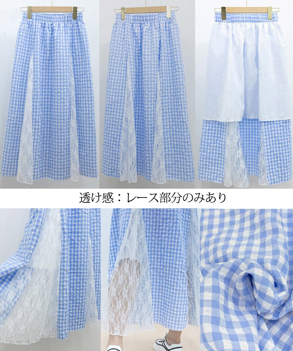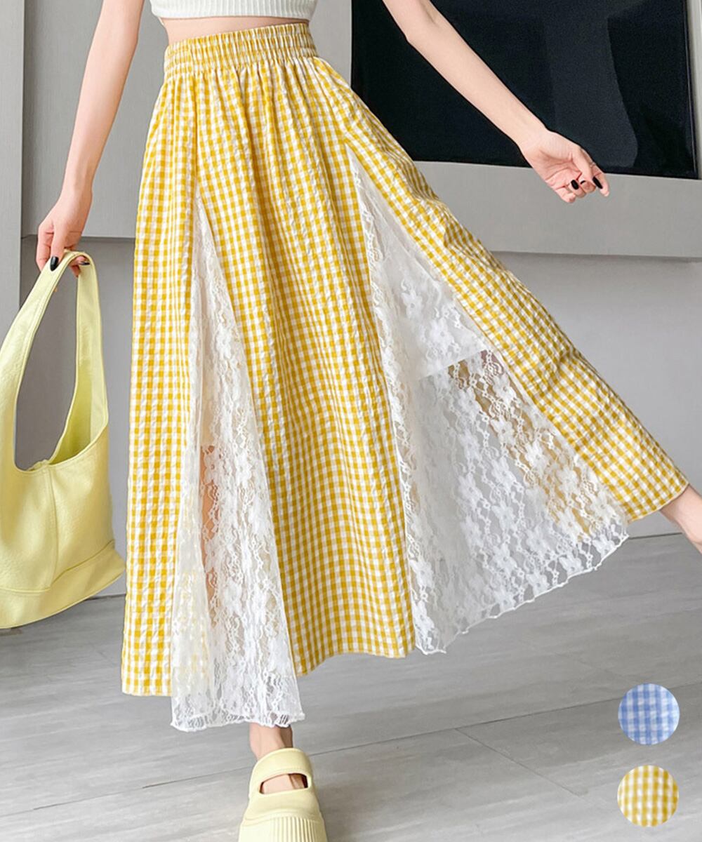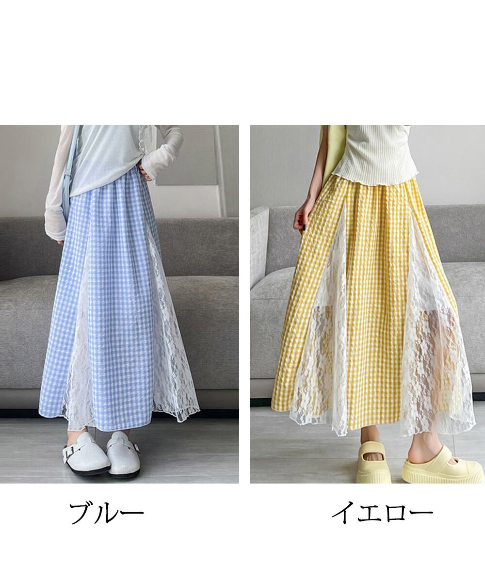 レディース 韓国風ロングスカート 大人可愛い 花柄レーススカート ギンガムチェックスカート ウエストゴム フレアスカート
