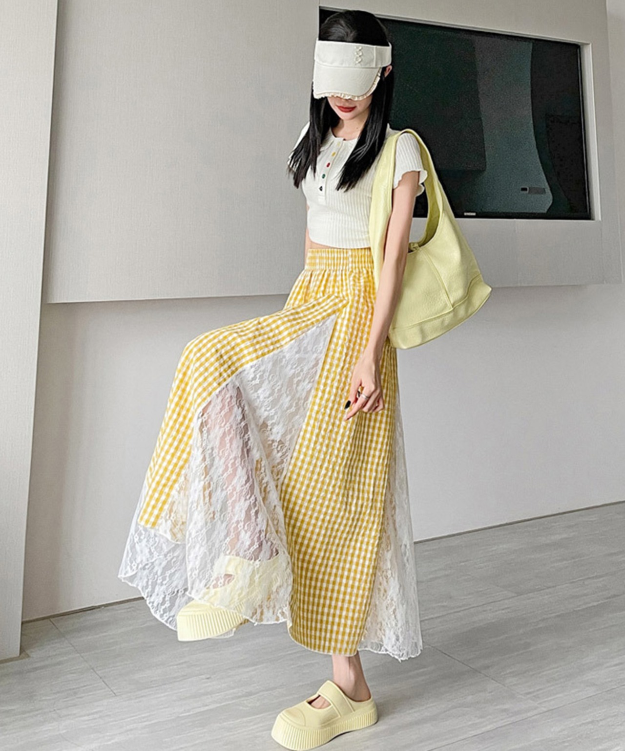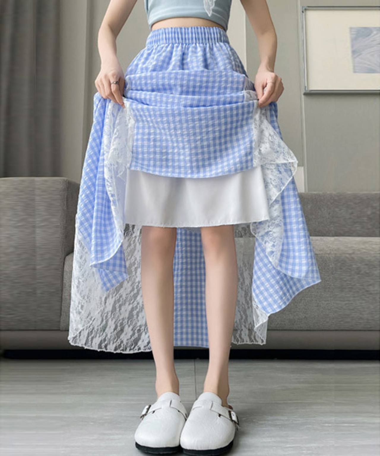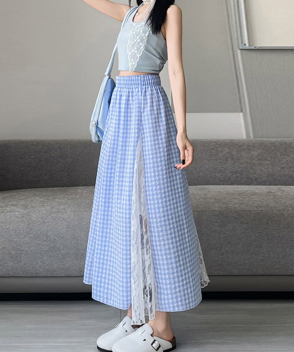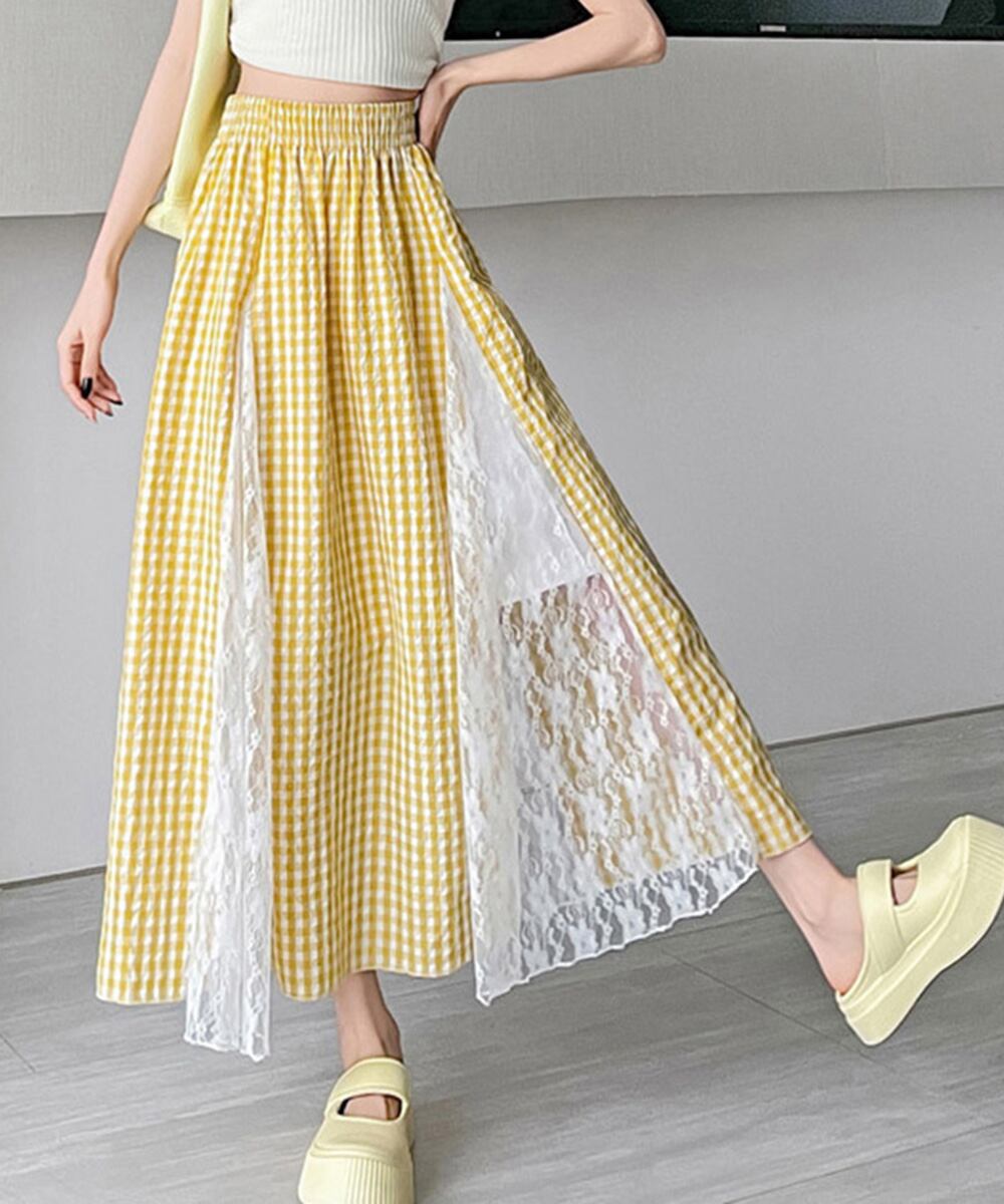 レース切り替え ロングチェック柄スカート