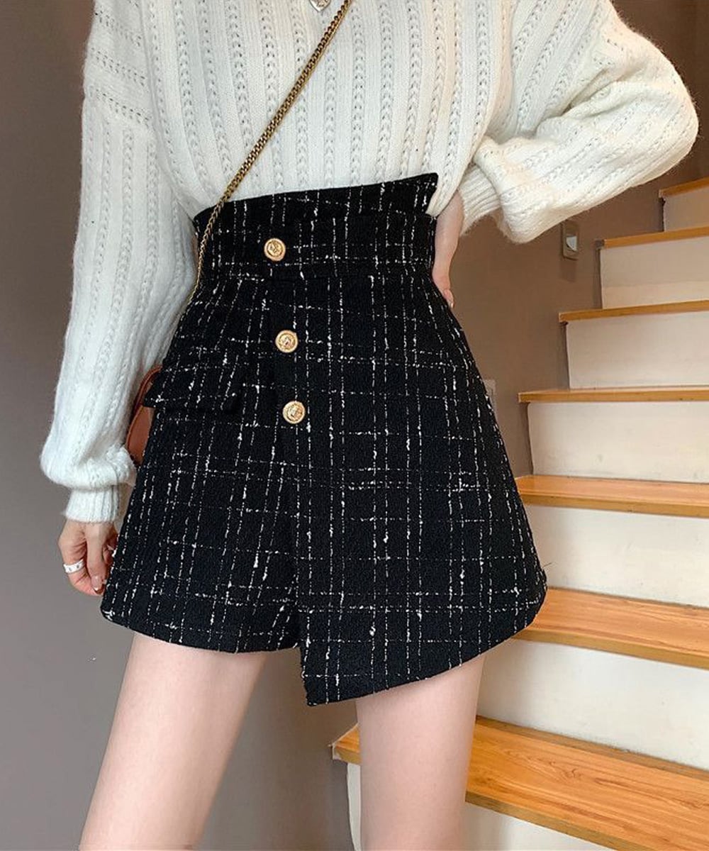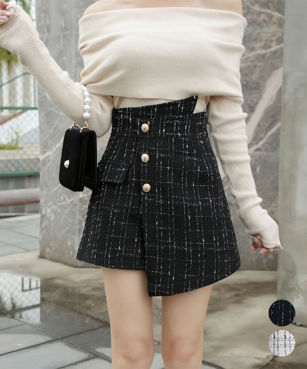 ツイード調のチェック柄が上品な印象を与えるハイウエストのラップ風ミニスカパン。