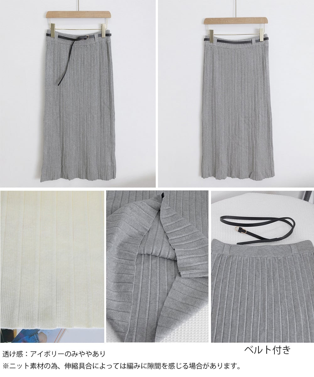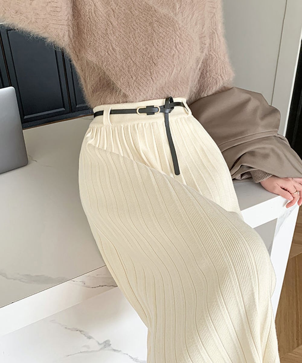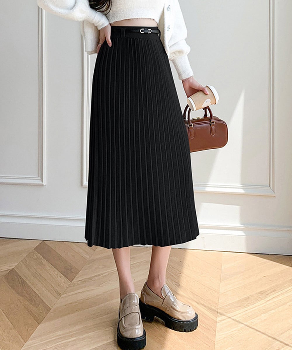 ワイドリブ プリーツスカート ベルト付きミモレ丈スカート 体型カバーオフィスカジュアル ロングスカート 美脚脚長 着やせ