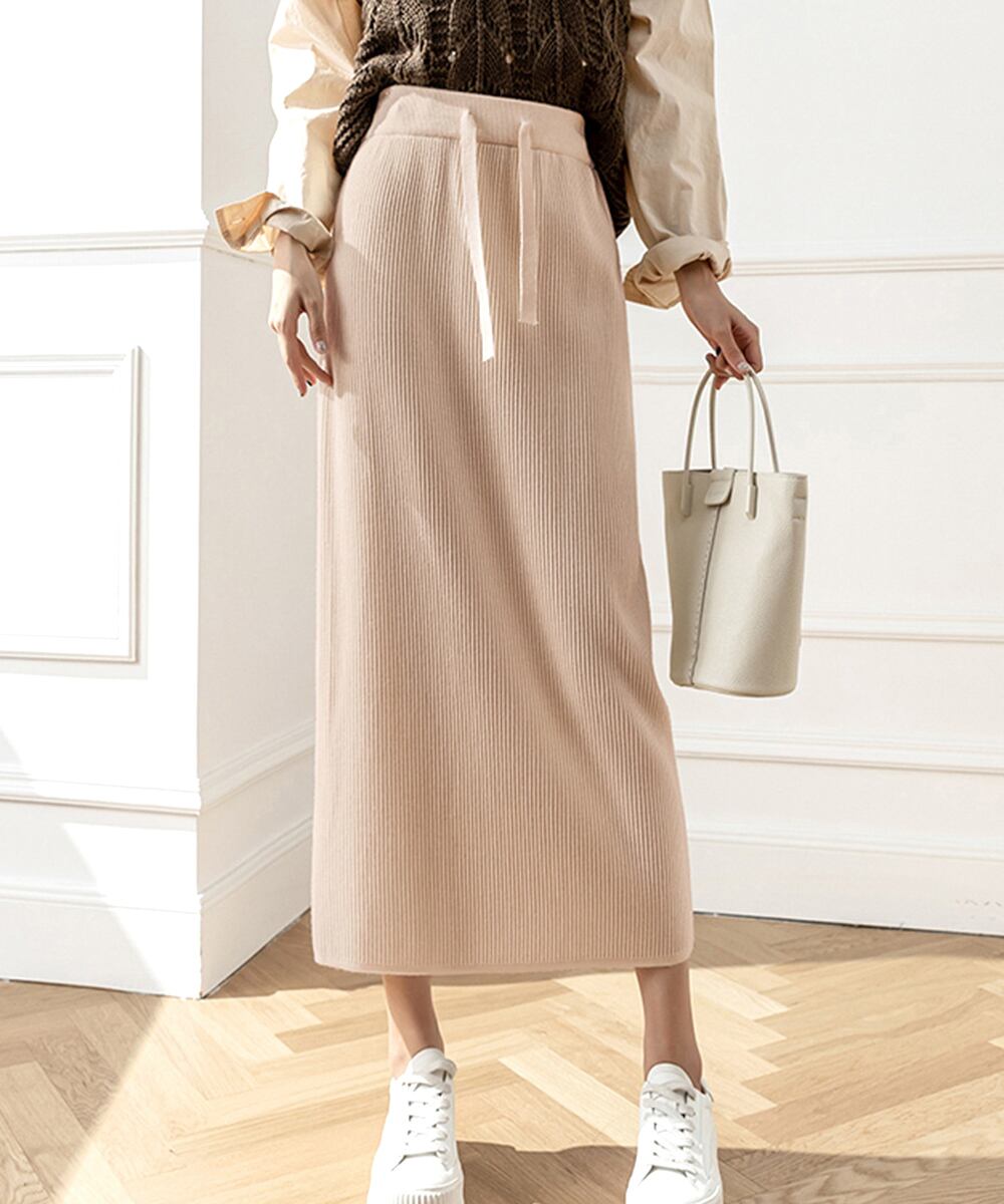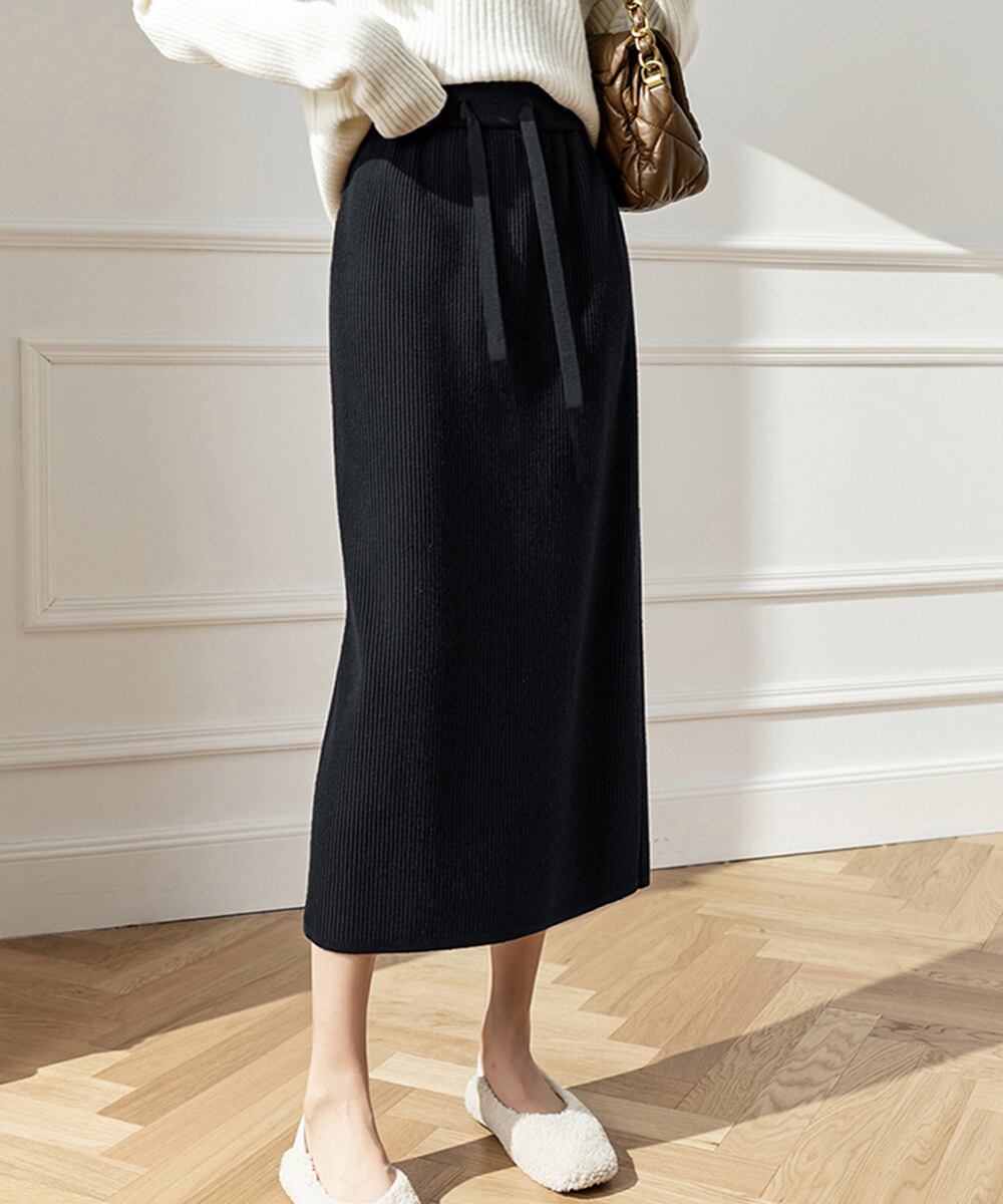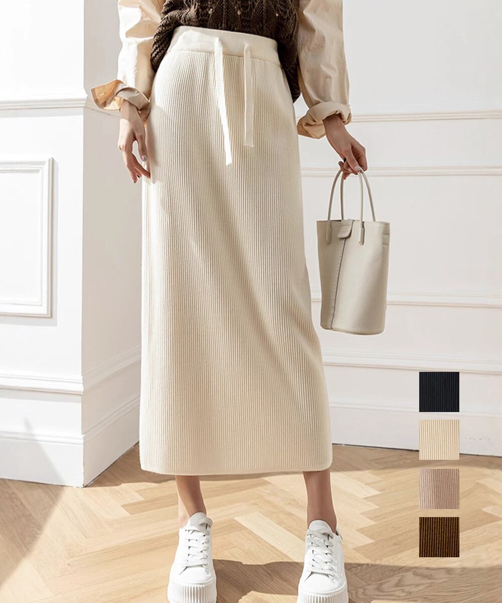 レディースニットスカート 無地 オフィスカジュアル リブニット 伸縮性 着やせ ウエストゴム タイトスカート ベーシック