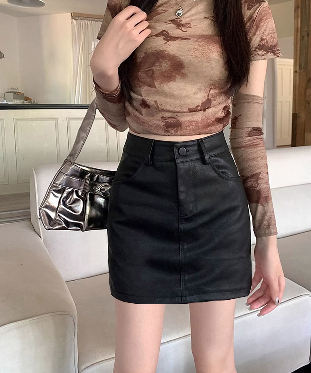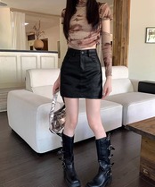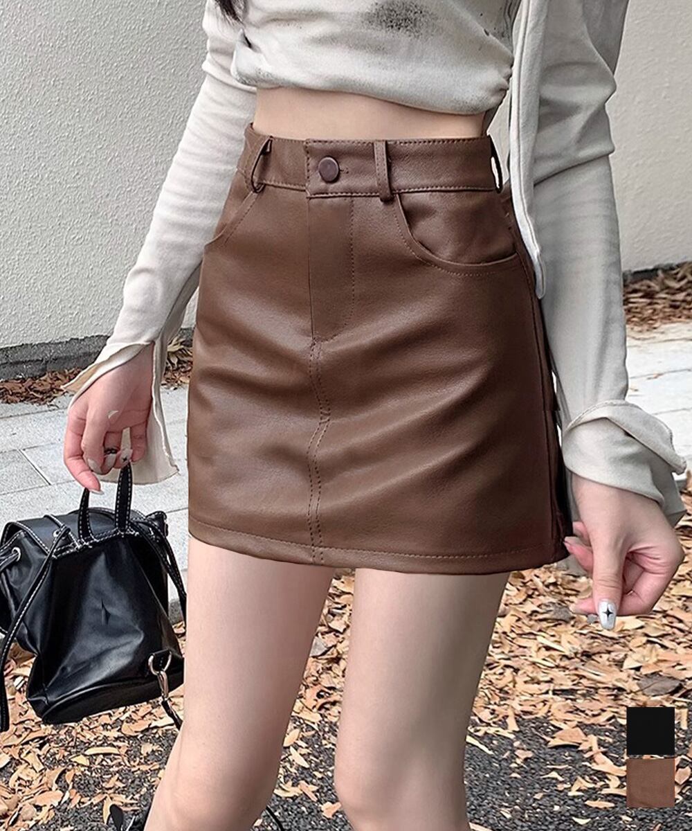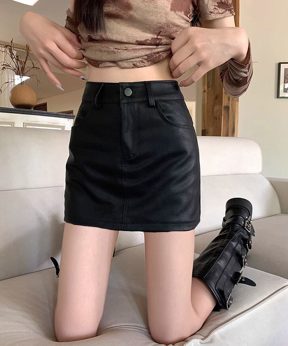 PUレザーミニスカートハイウエスト韓国風