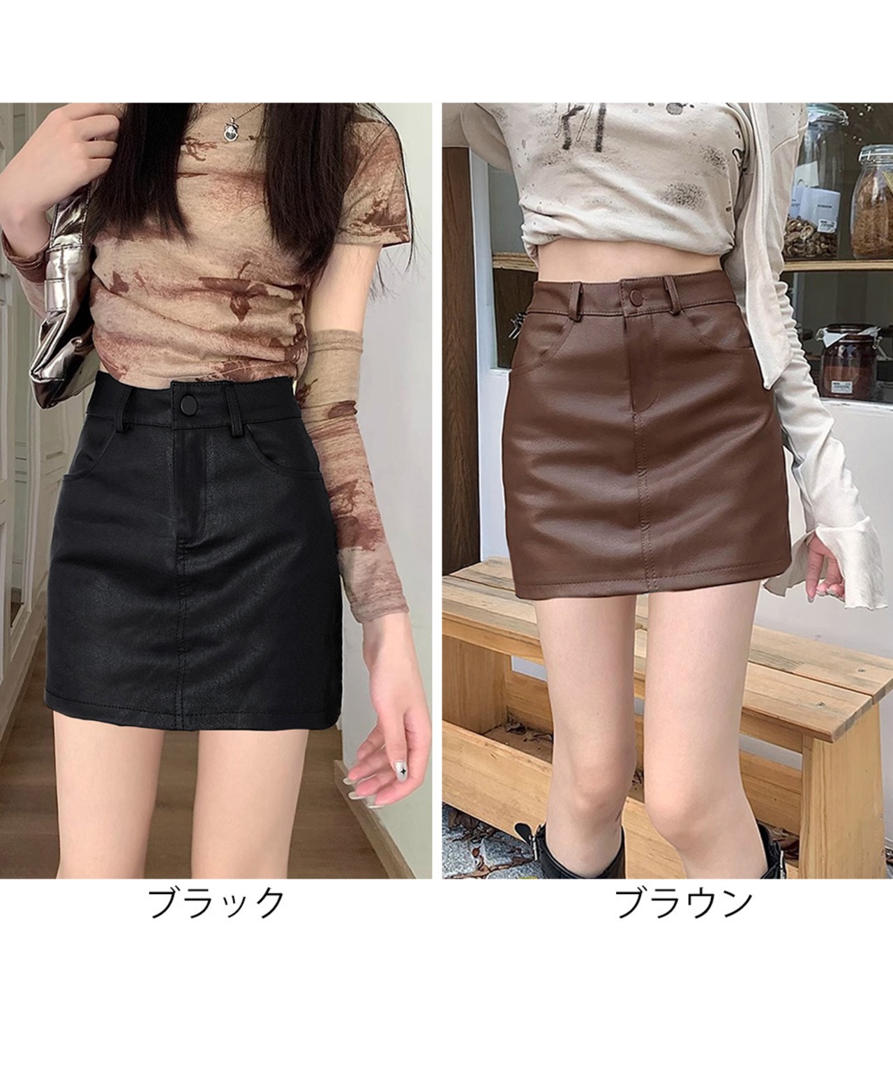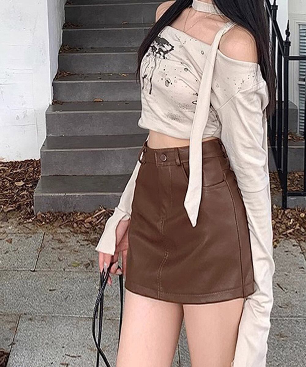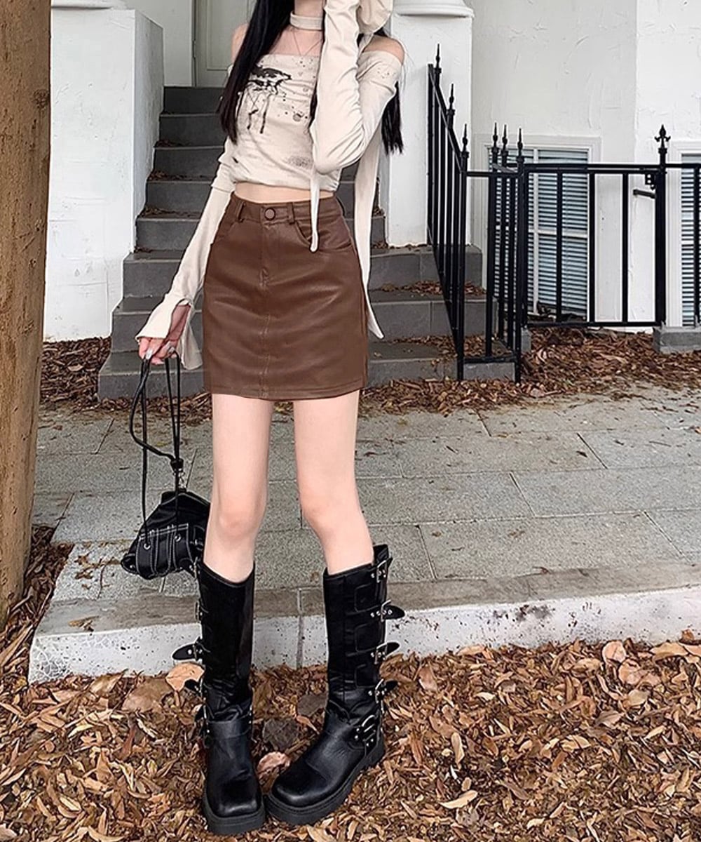 PUレザーミニスカートハイウエスト韓国風