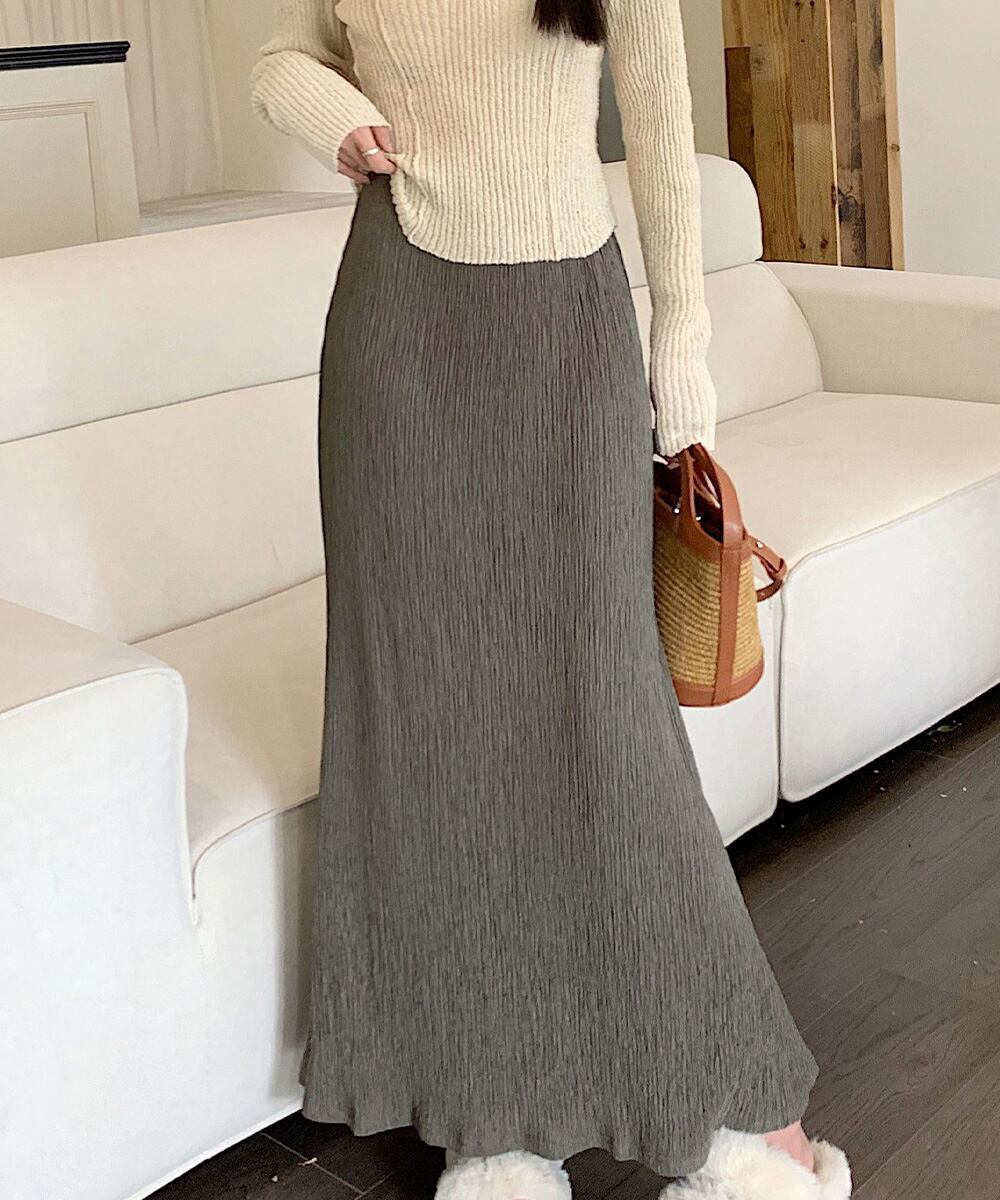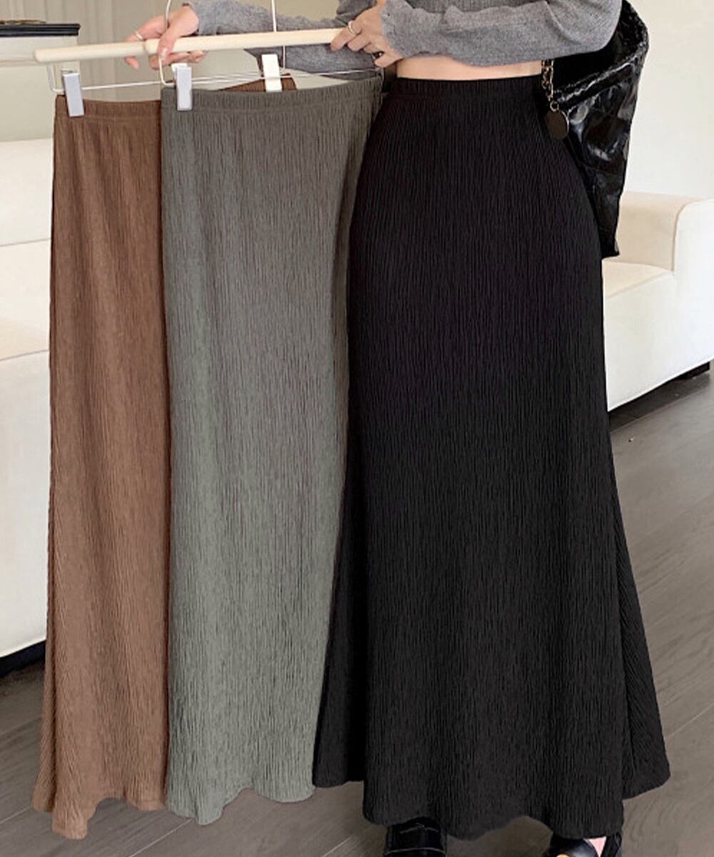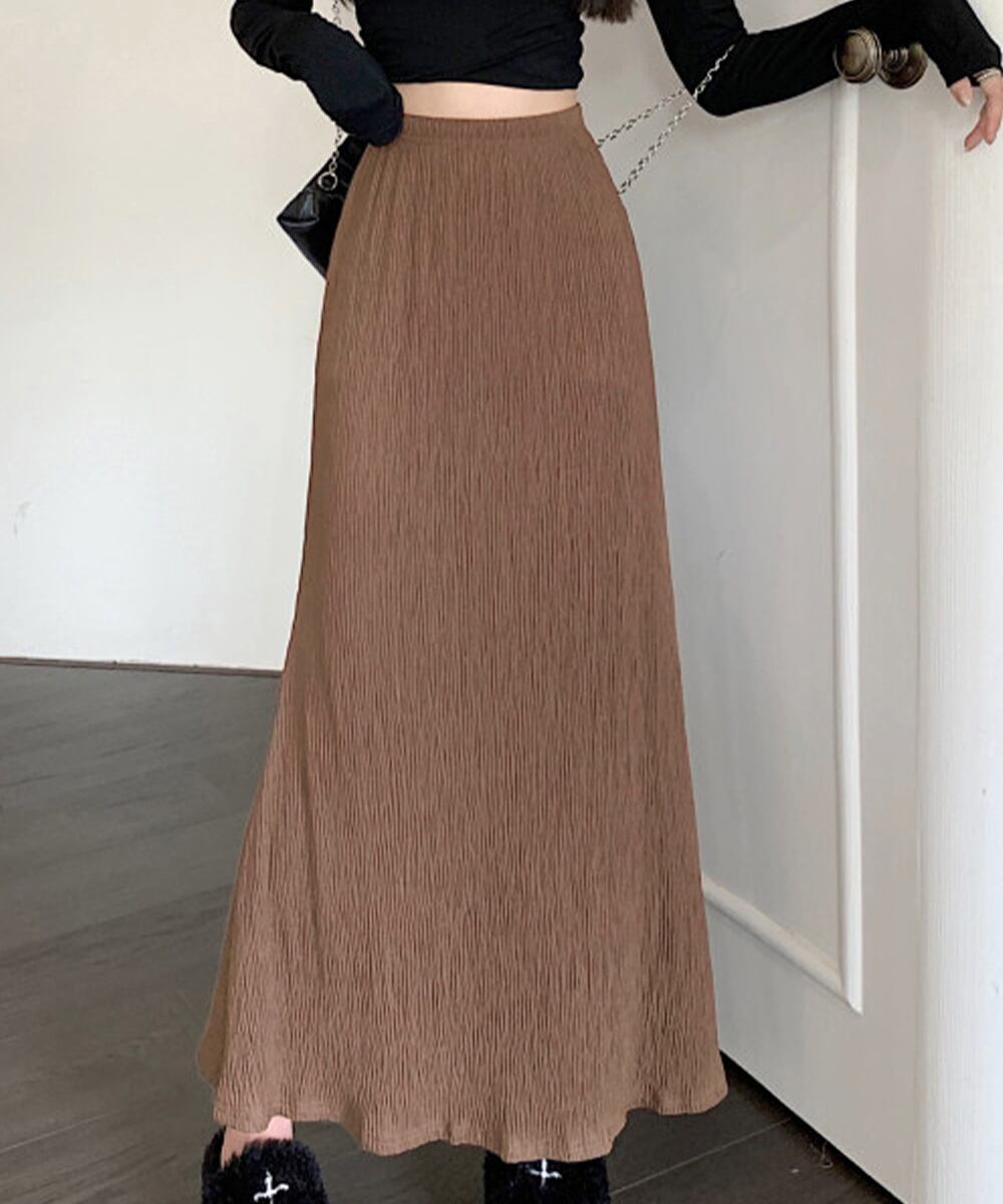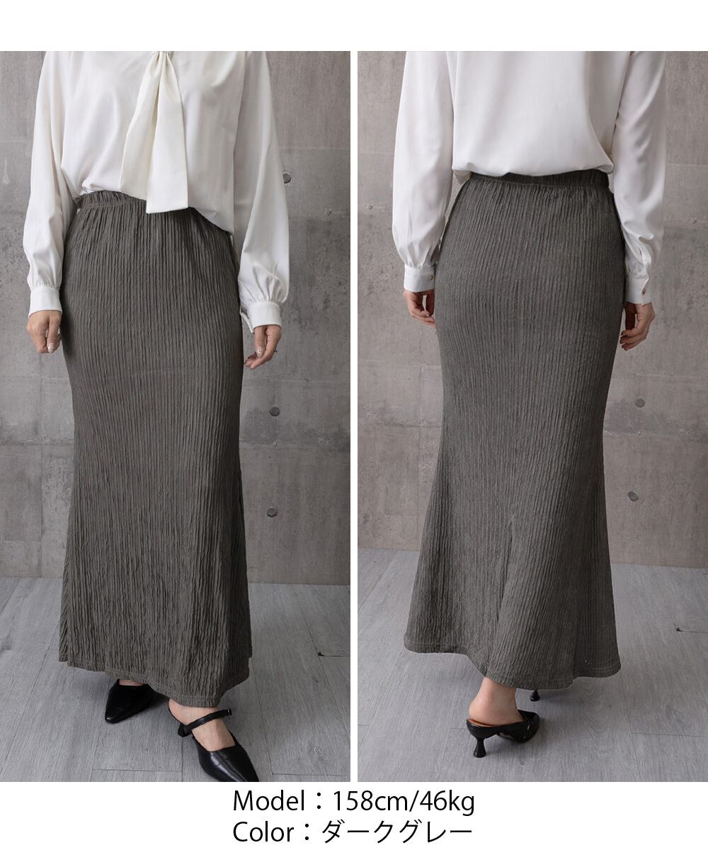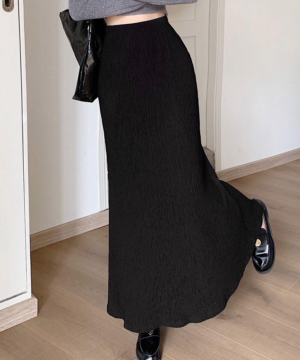 シワ加工を施した、軽やかな素材のロング丈スカート。