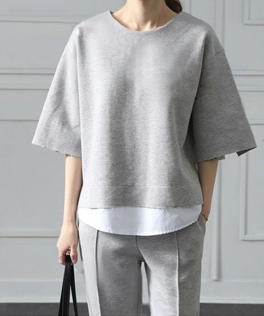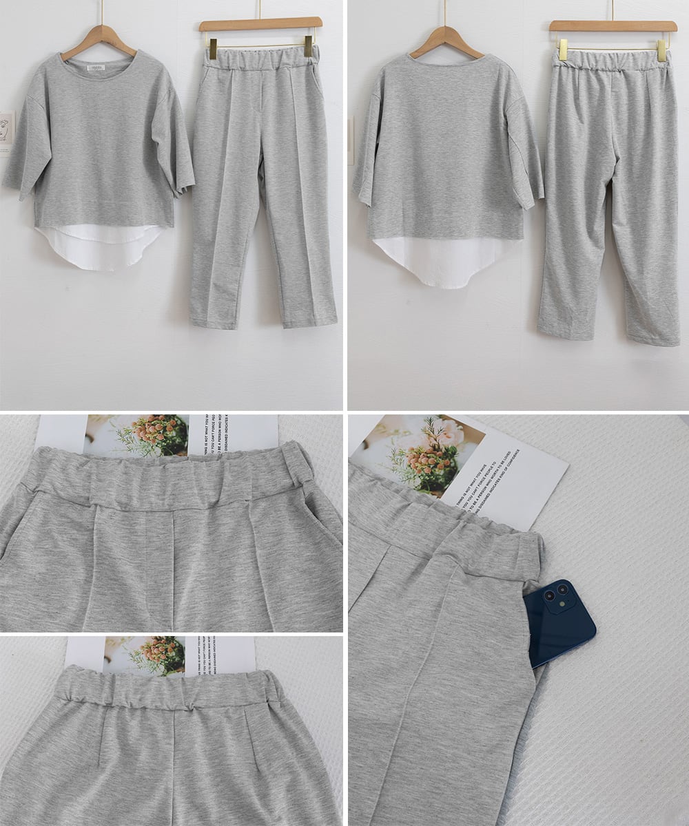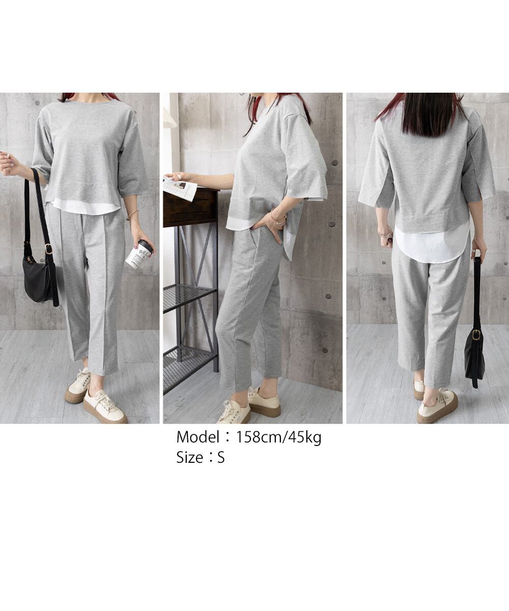 重ね着風トップス シンプル 7分袖スウェットトップス 七分丈センタープレスパンツ 大人カジュア2点セット ゆったり韓国風