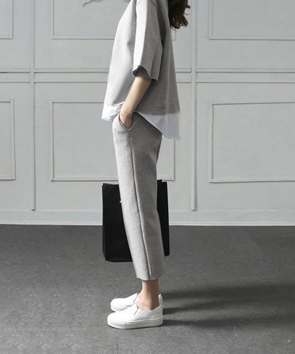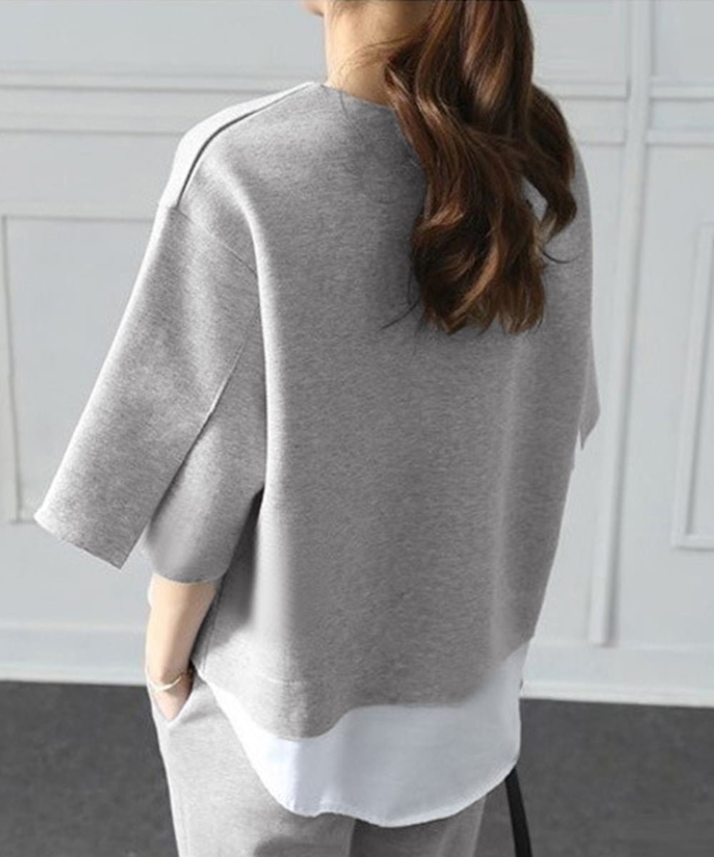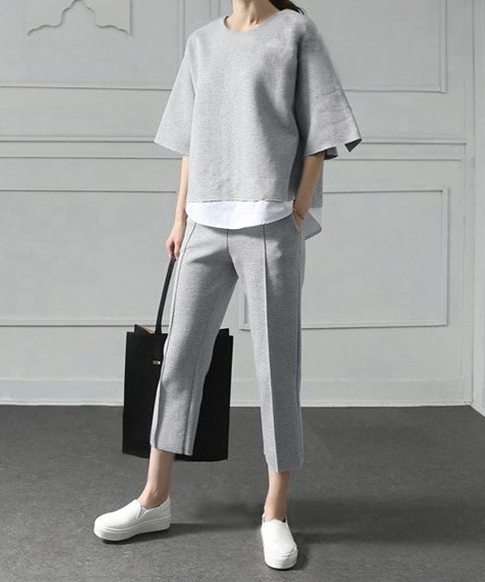 重ね着風トップス シンプル 7分袖スウェットトップス 七分丈センタープレスパンツ 大人カジュア2点セット ゆったり韓国風
