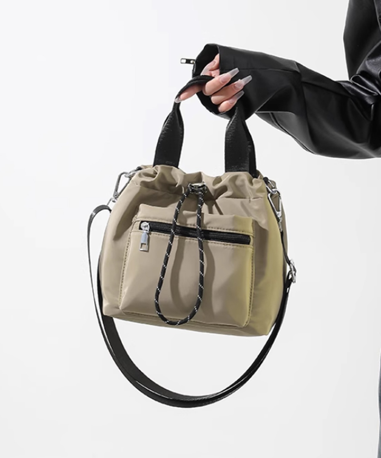光沢感のある素材と巾着風のデザインが、コーデにトレンド感をプラス
