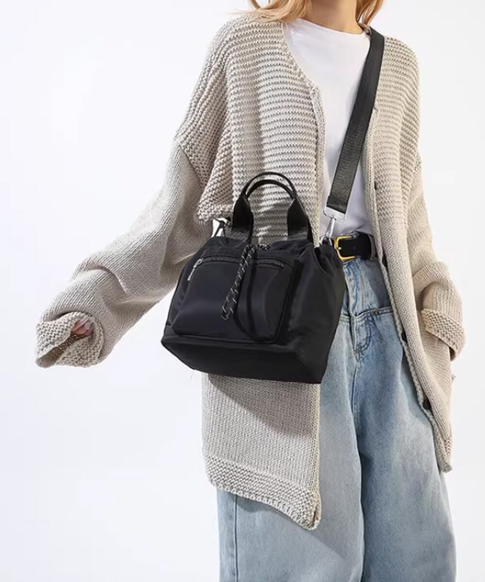 長さ調節可能なショルダーストラップ付きで、肩掛けも斜め掛けも自由自在