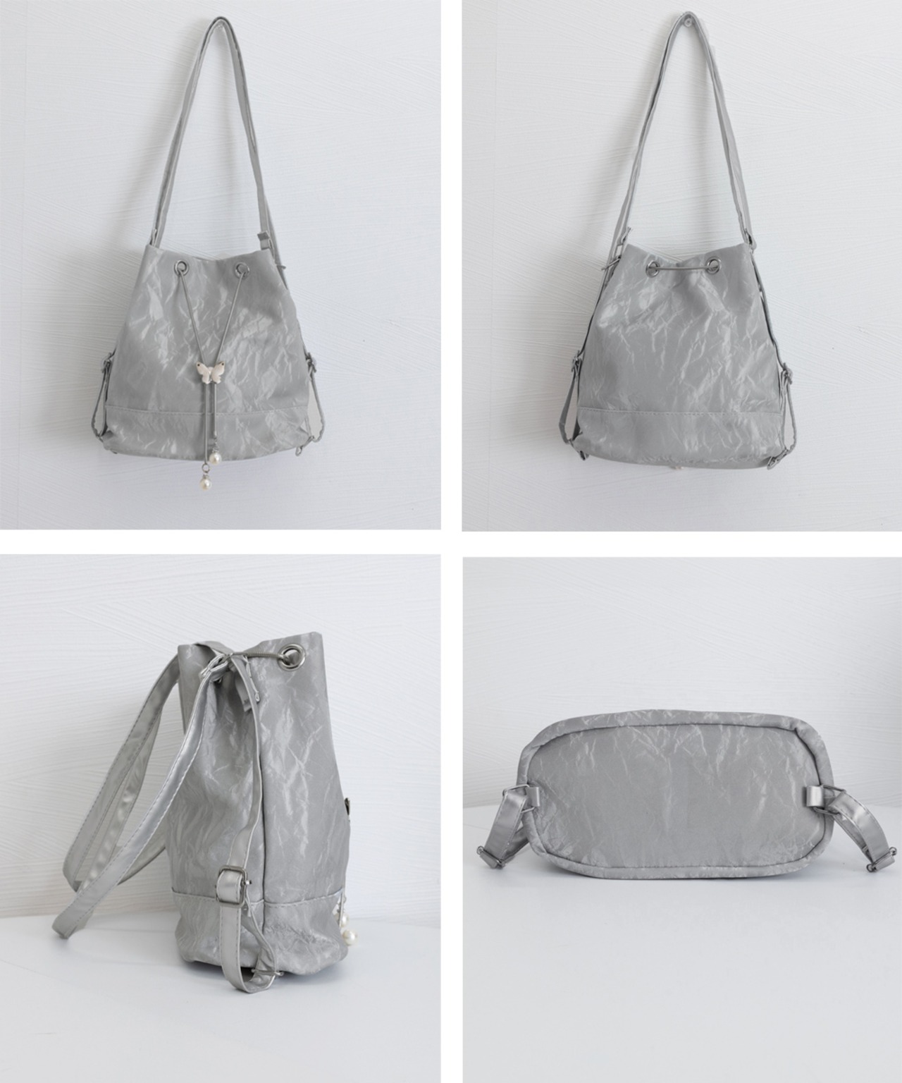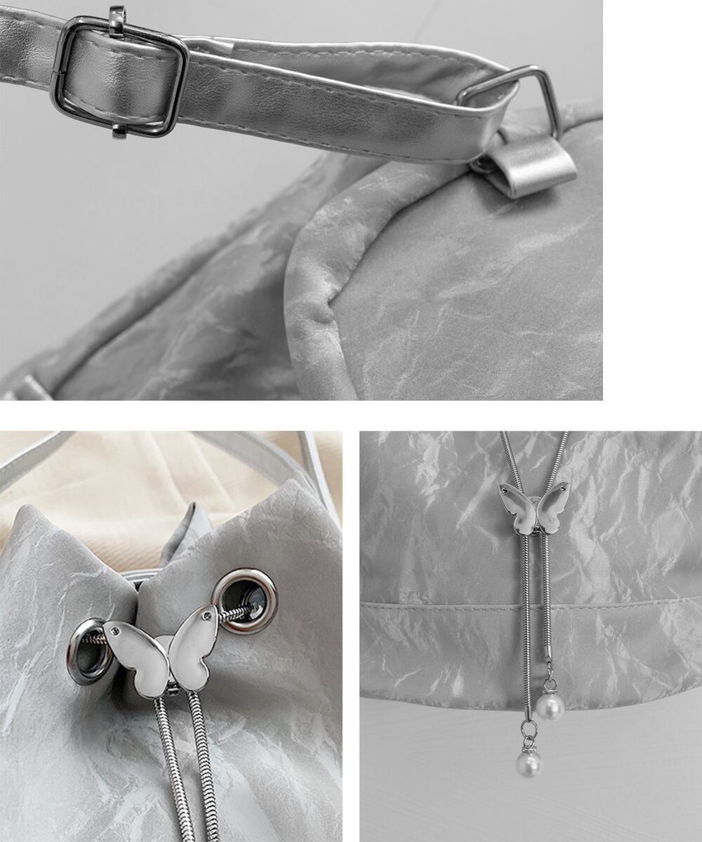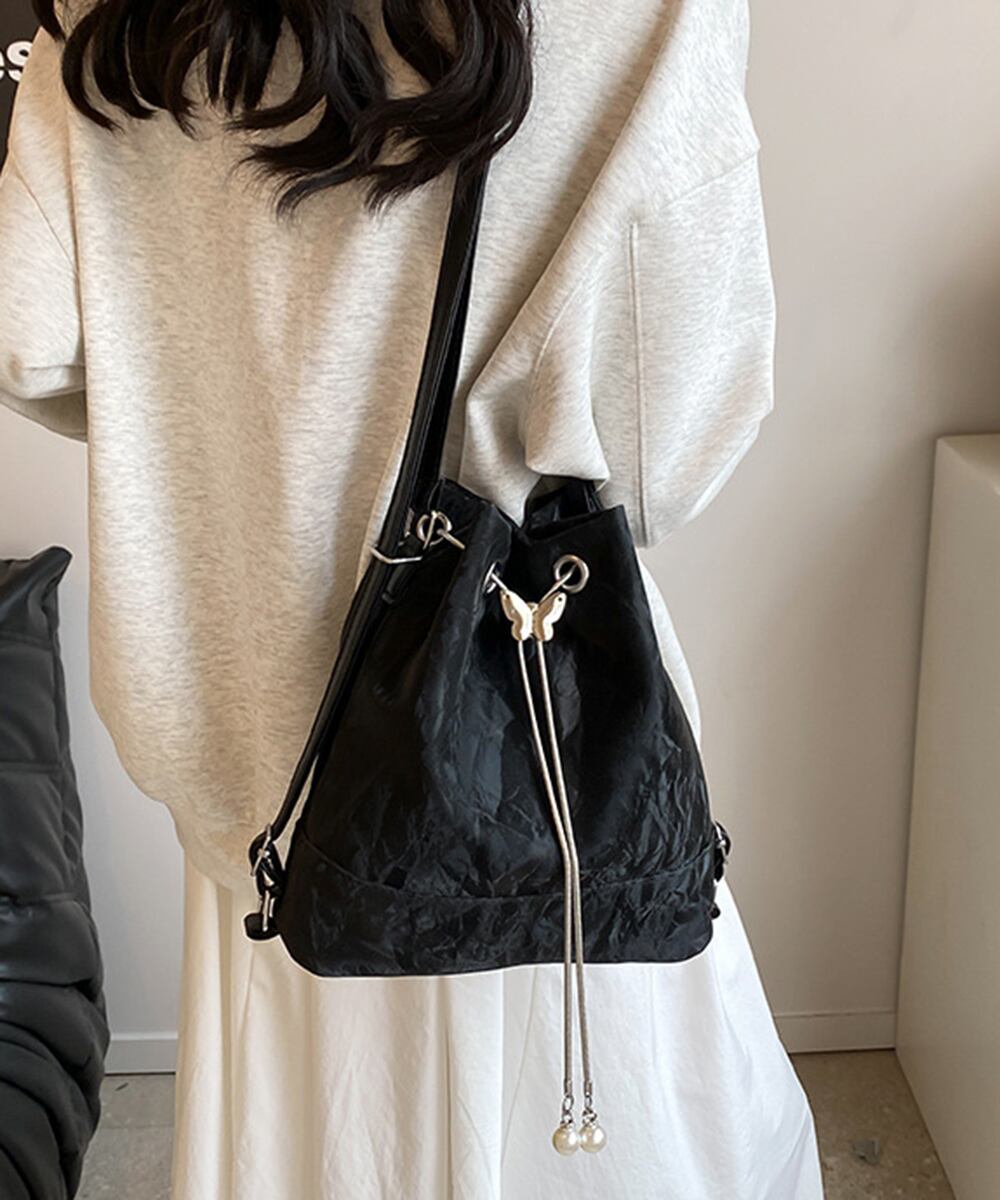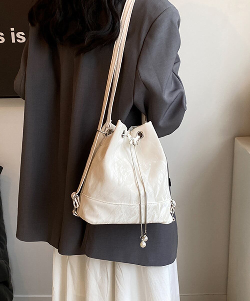 ドローストリングの先端にパールをあしらい、上品さと大人可愛い雰囲気をプラスしたショルダーバッグ。