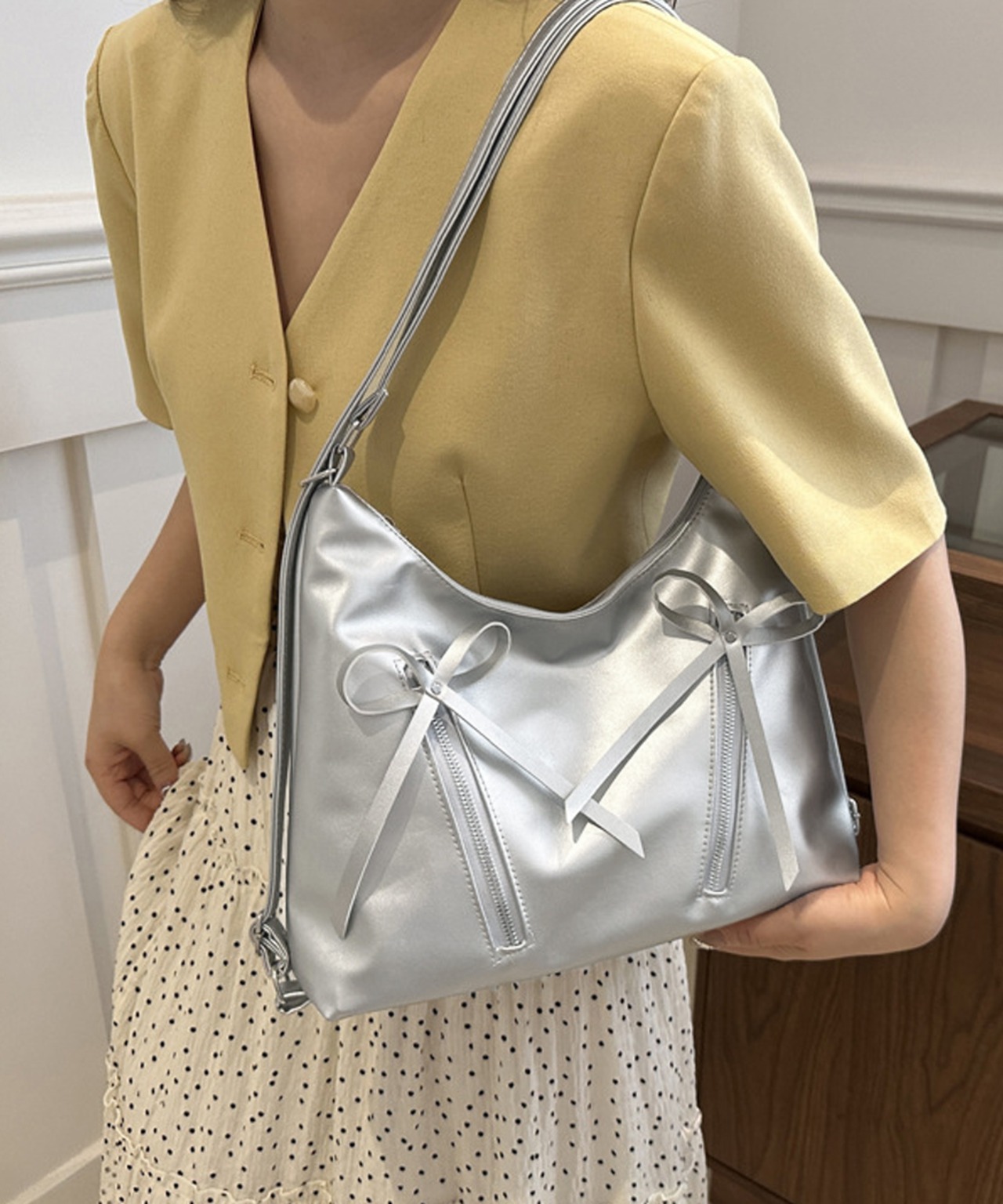 フロントには飾り用のリボン付きファスナーポケットがあり、フェミニンなアクセントをプラス。