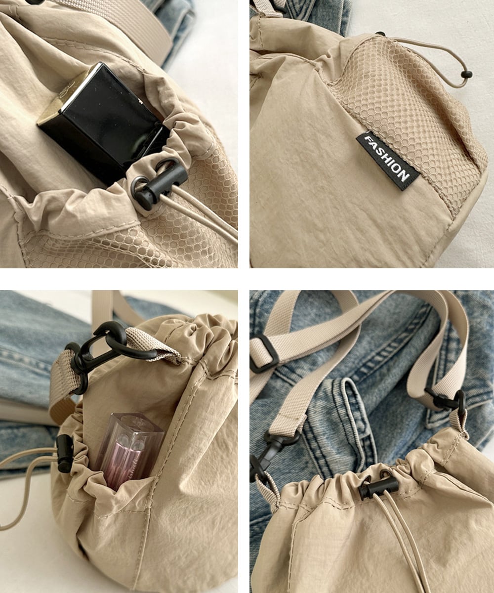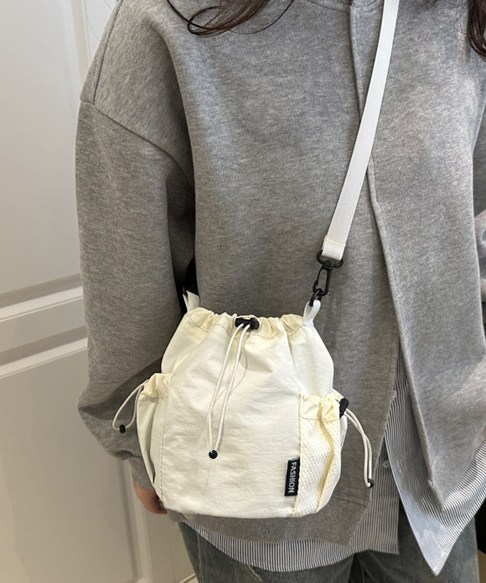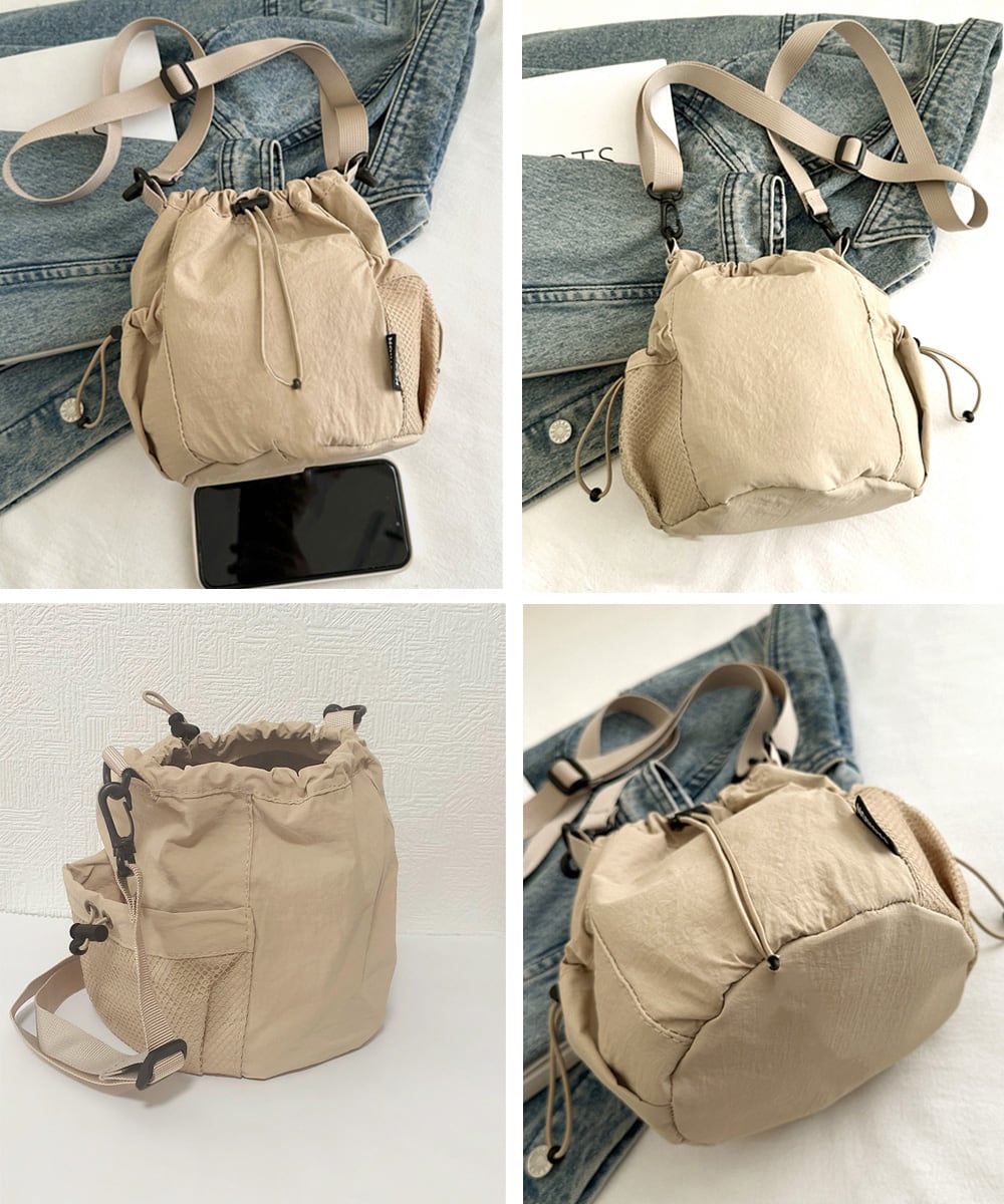 軽量でコンパクトなサイズ感が魅力の巾着ショルダーバッグ。