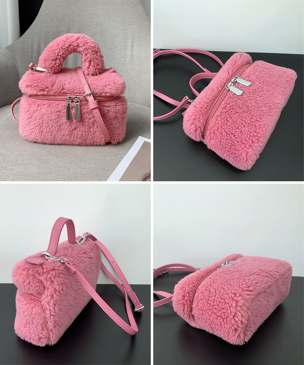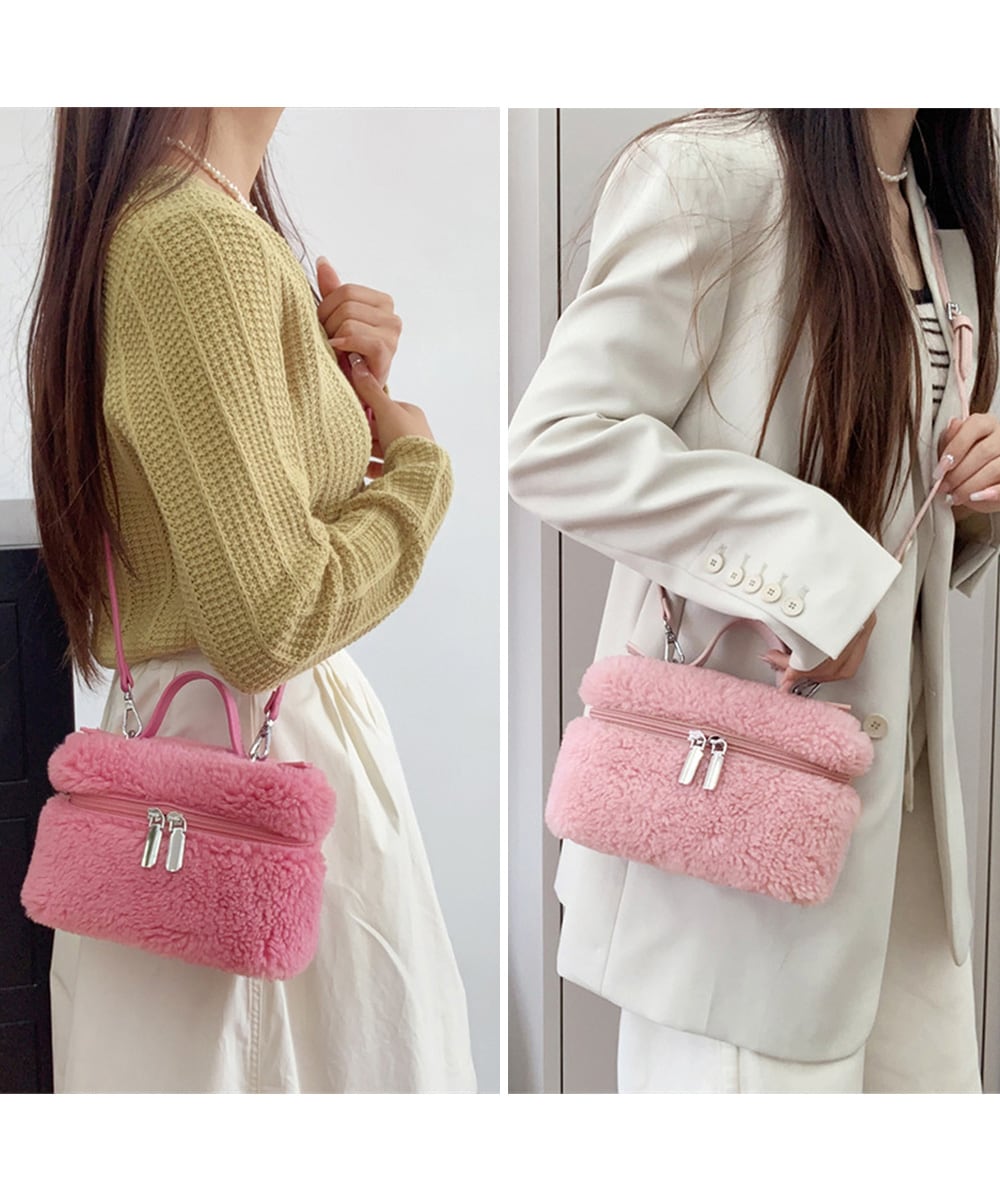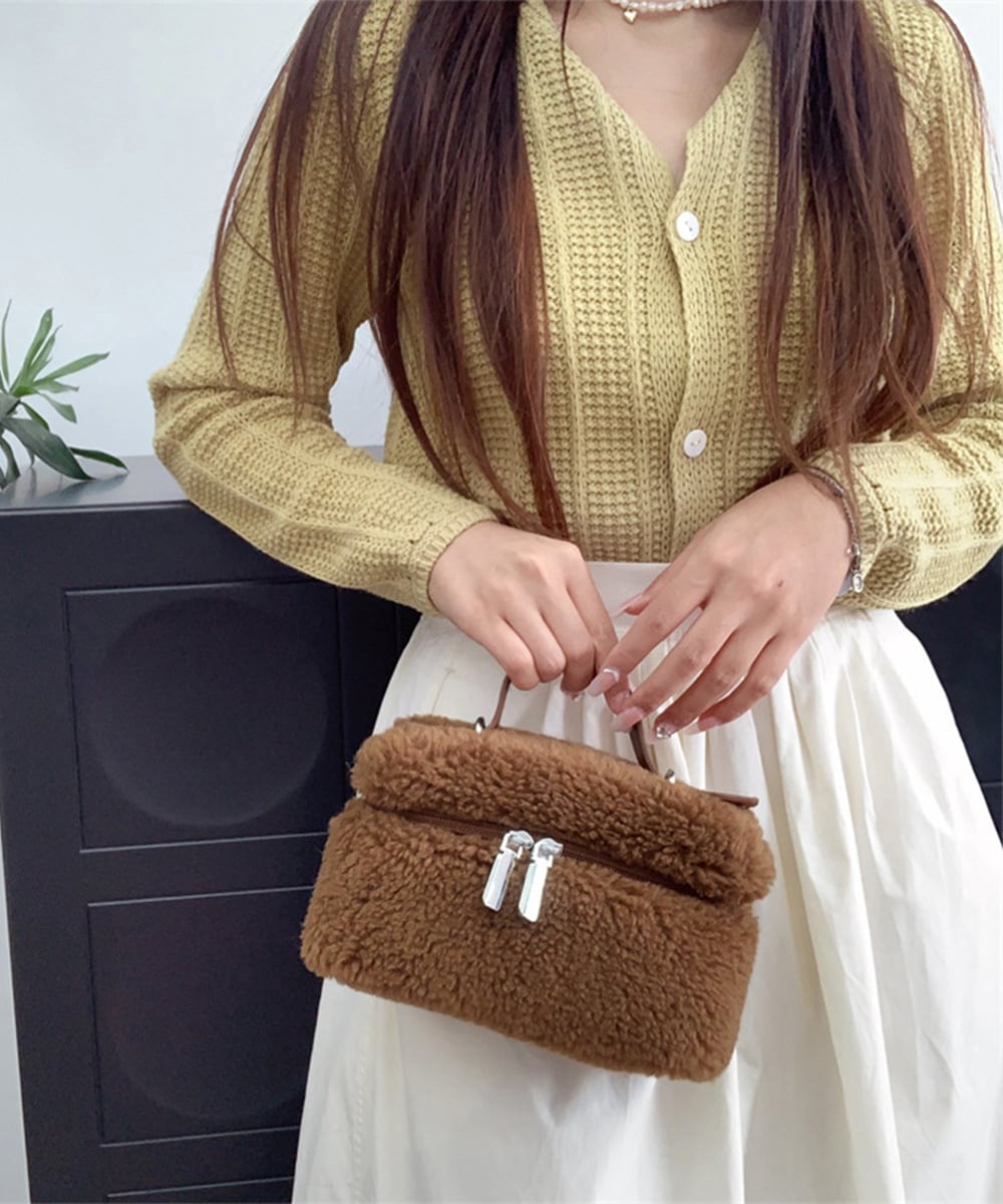 丸っこいフォルムが可愛い、ボア素材が季節感を添えるボックス型ショルダーバッグ。