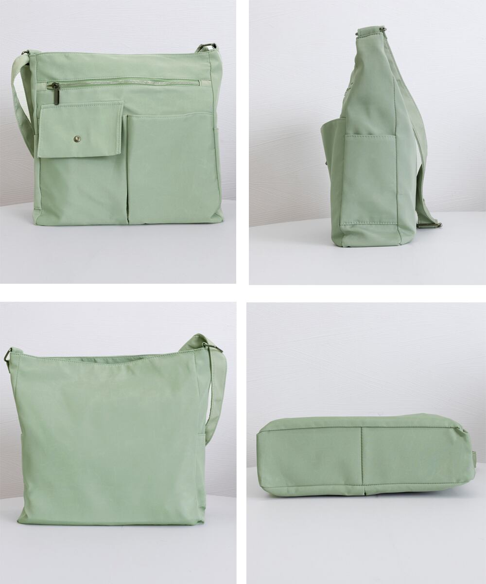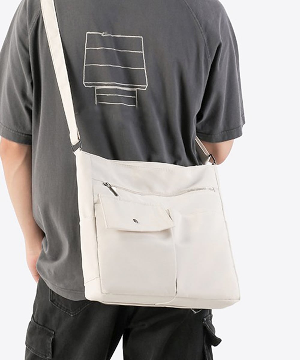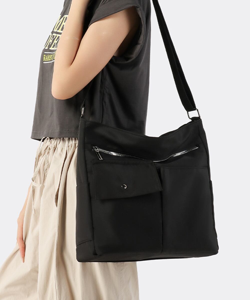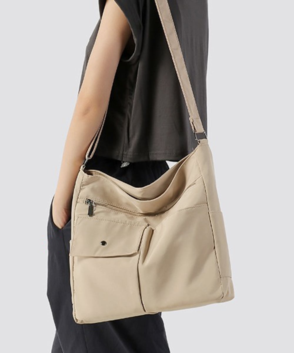 軽量で持ちやすいナイロン素材を使用した、男女兼用の大容量ショルダーバッグ。