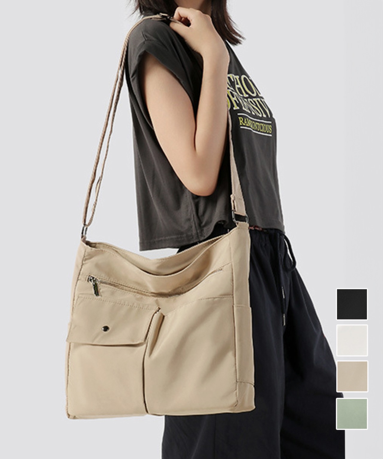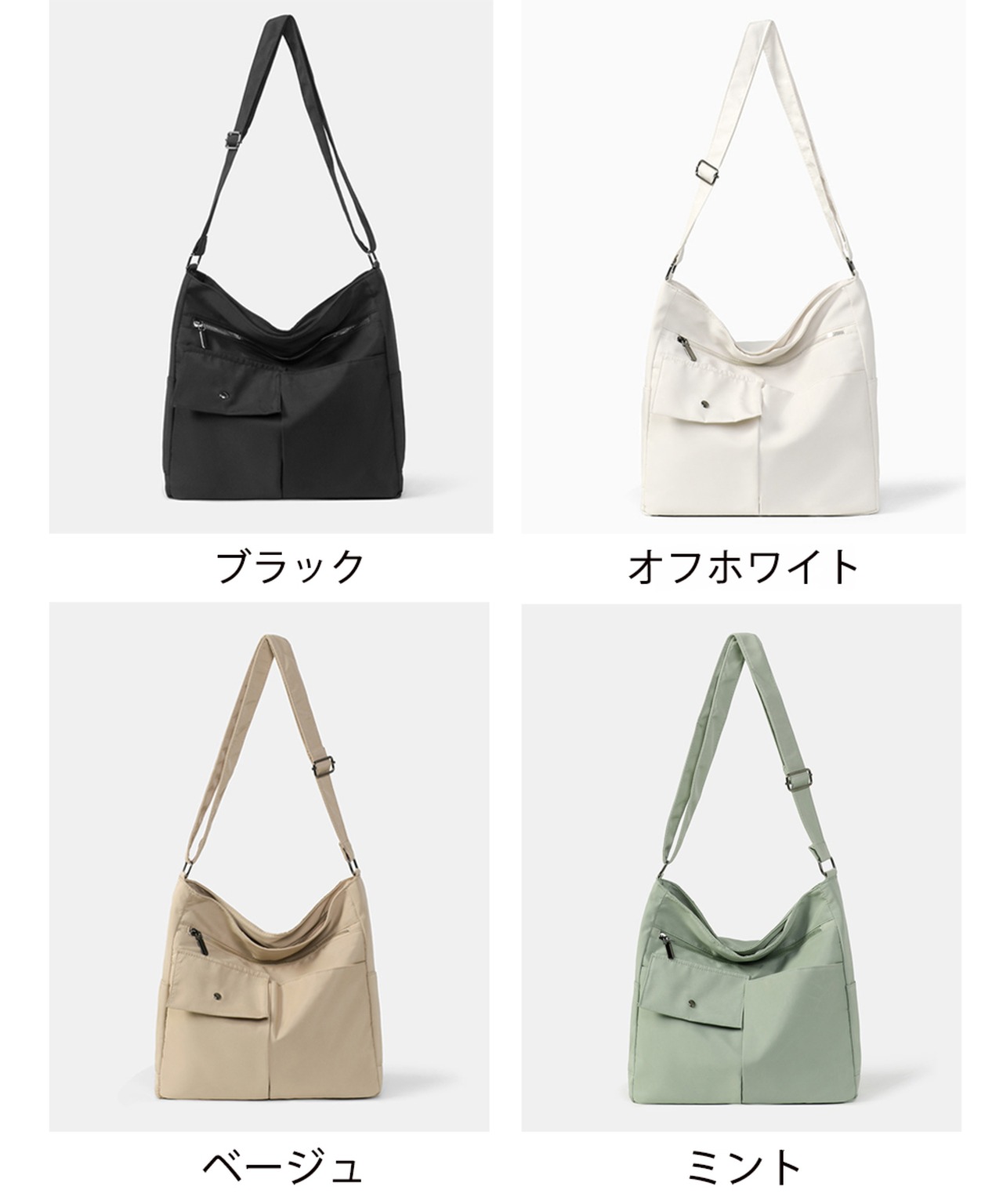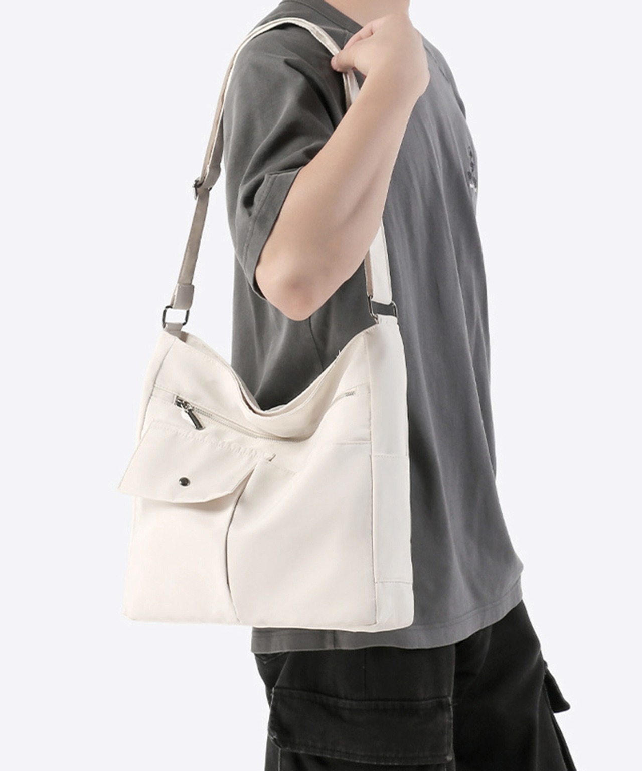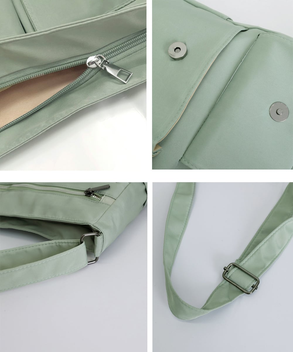 軽量で持ちやすいナイロン素材を使用した、男女兼用の大容量ショルダーバッグ。