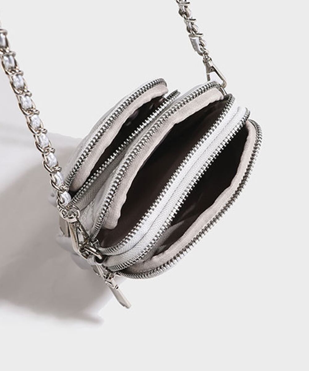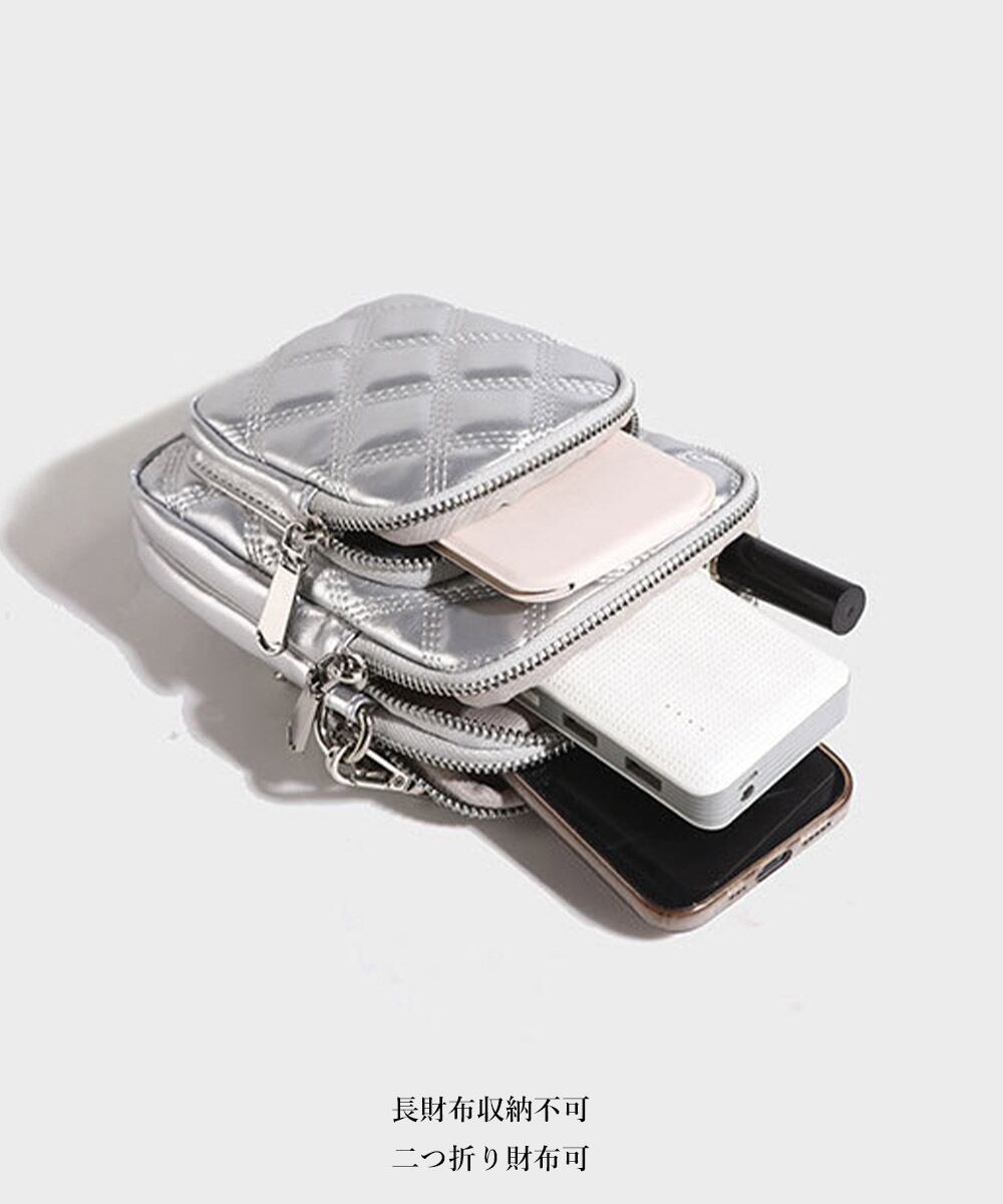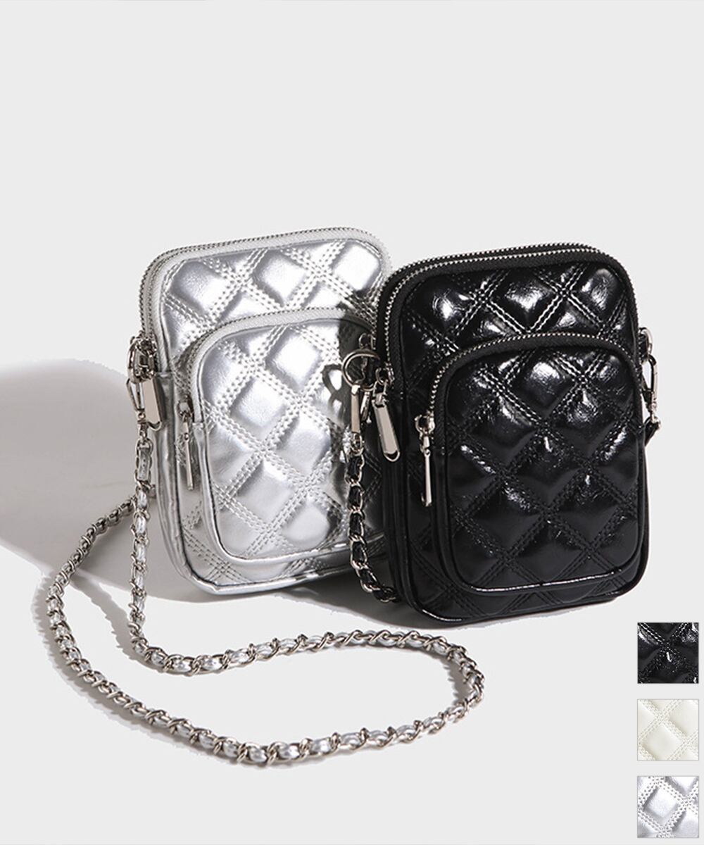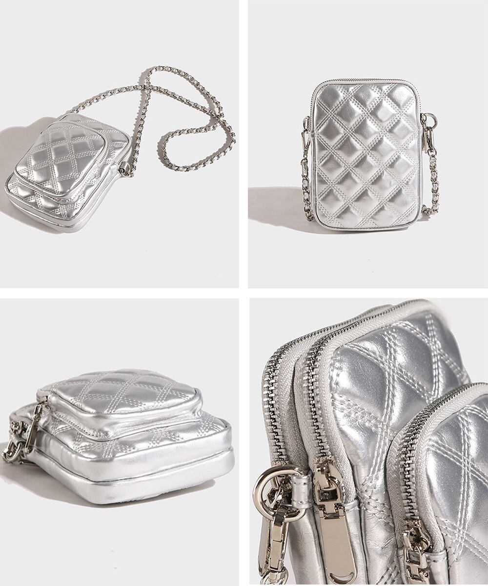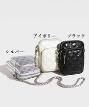 キルティングデザインのミニショルダーバッグで、スマホ収納に最適なコンパクトサイズ。
