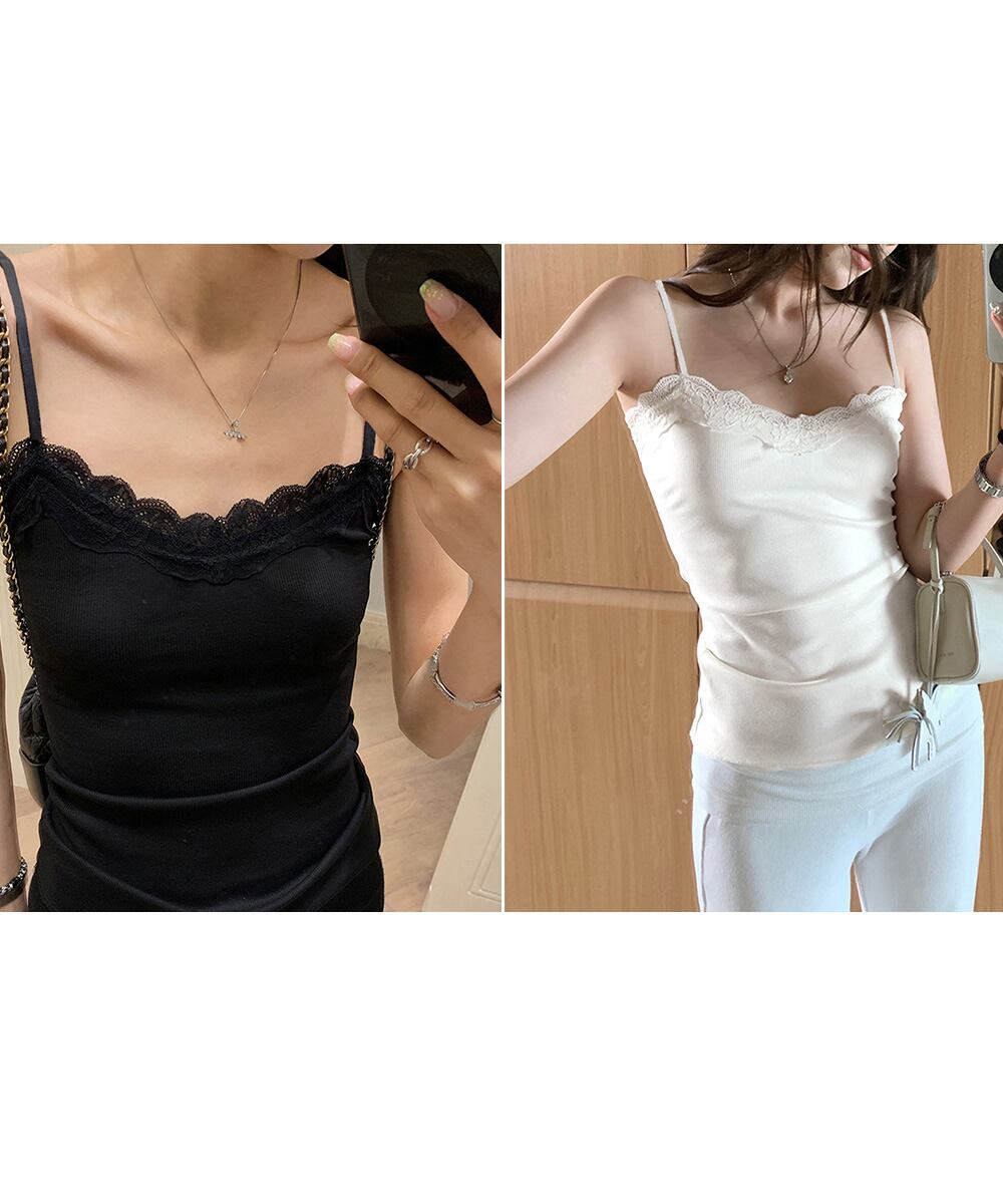 リブキャミソールは、胸元のレースがさりげないアクセントに。
