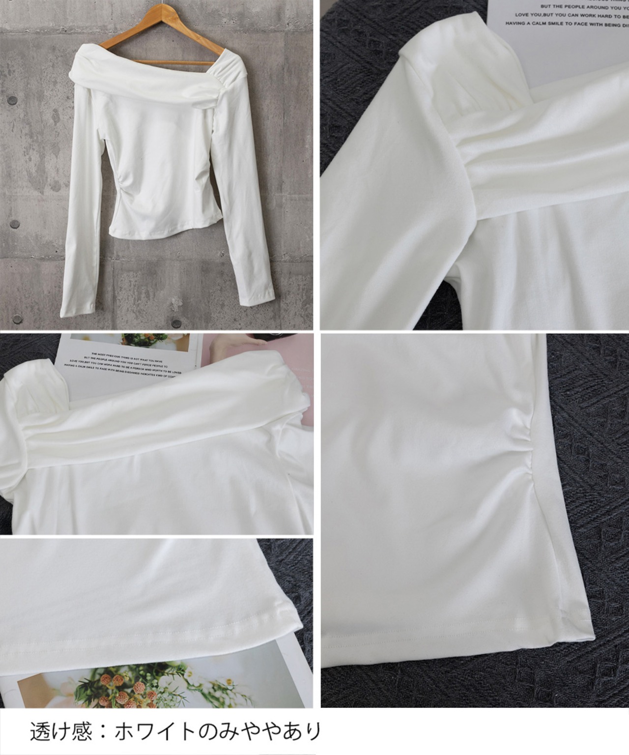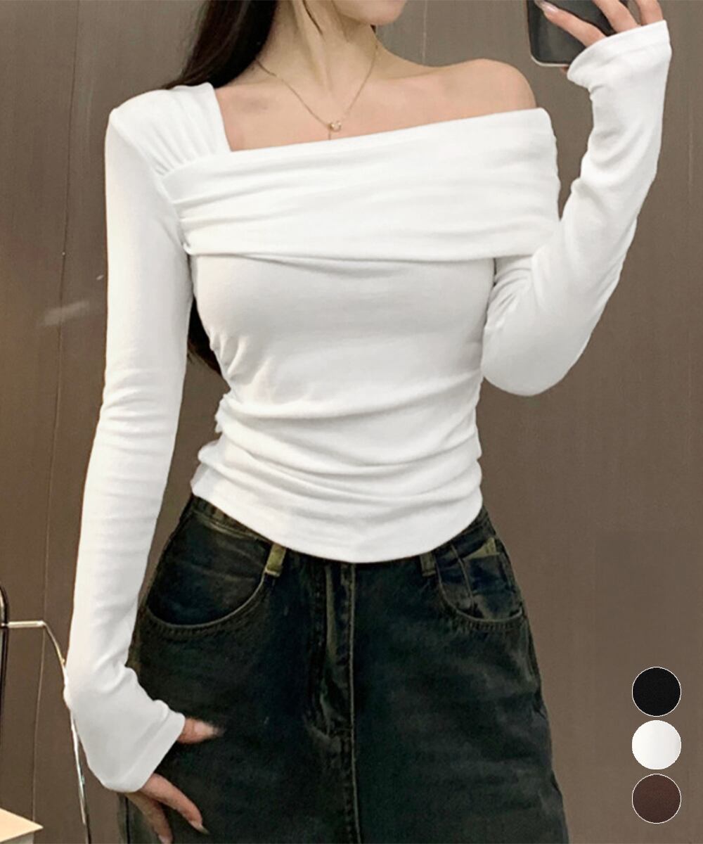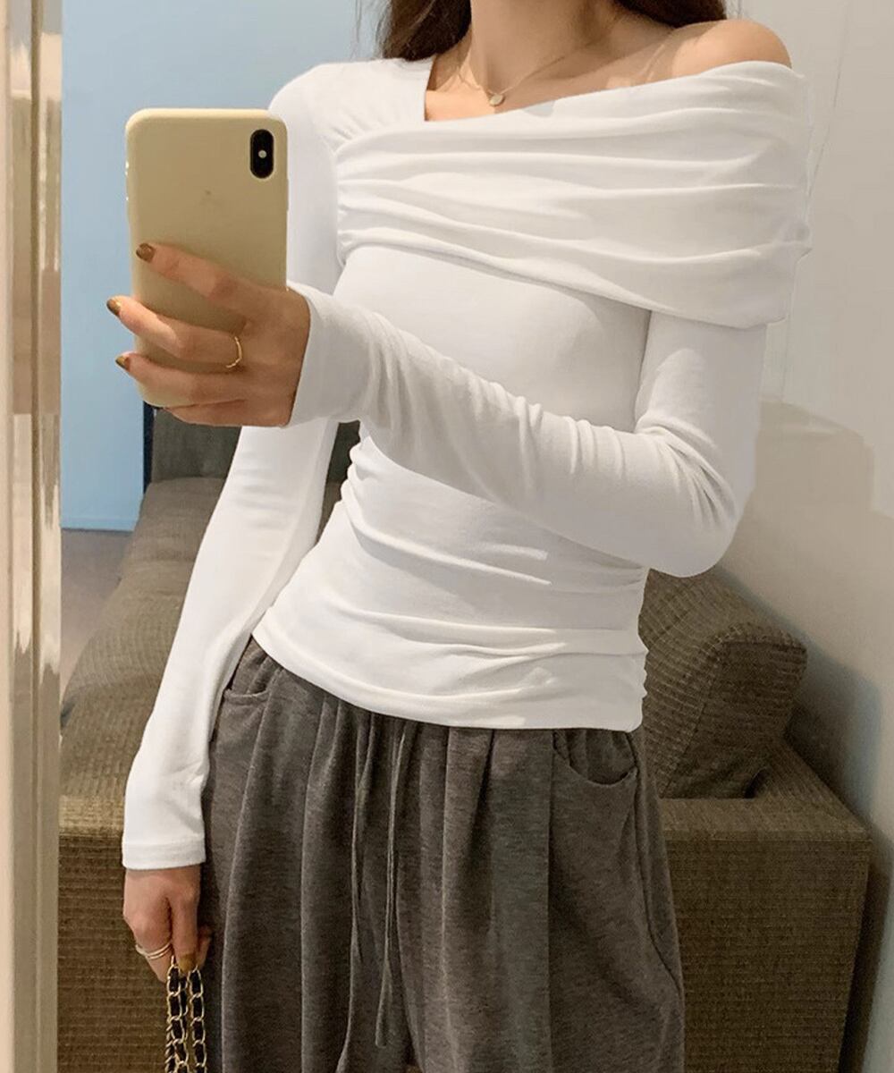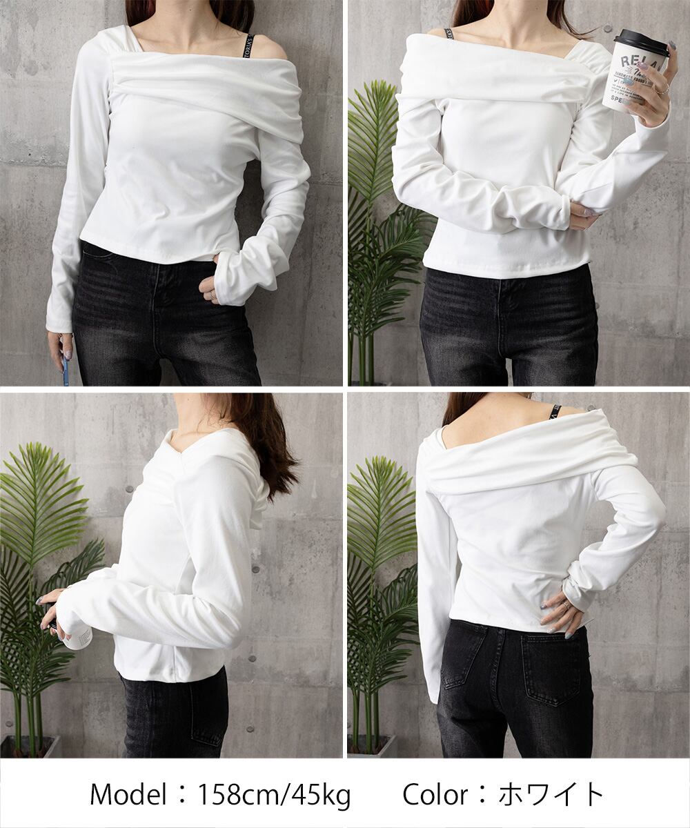 アシンメトリーデザインが目を引く、オフショルダーのフィットトップス。