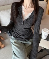 首元はVネックで、レースの切り替えがさりげないアクセントに。