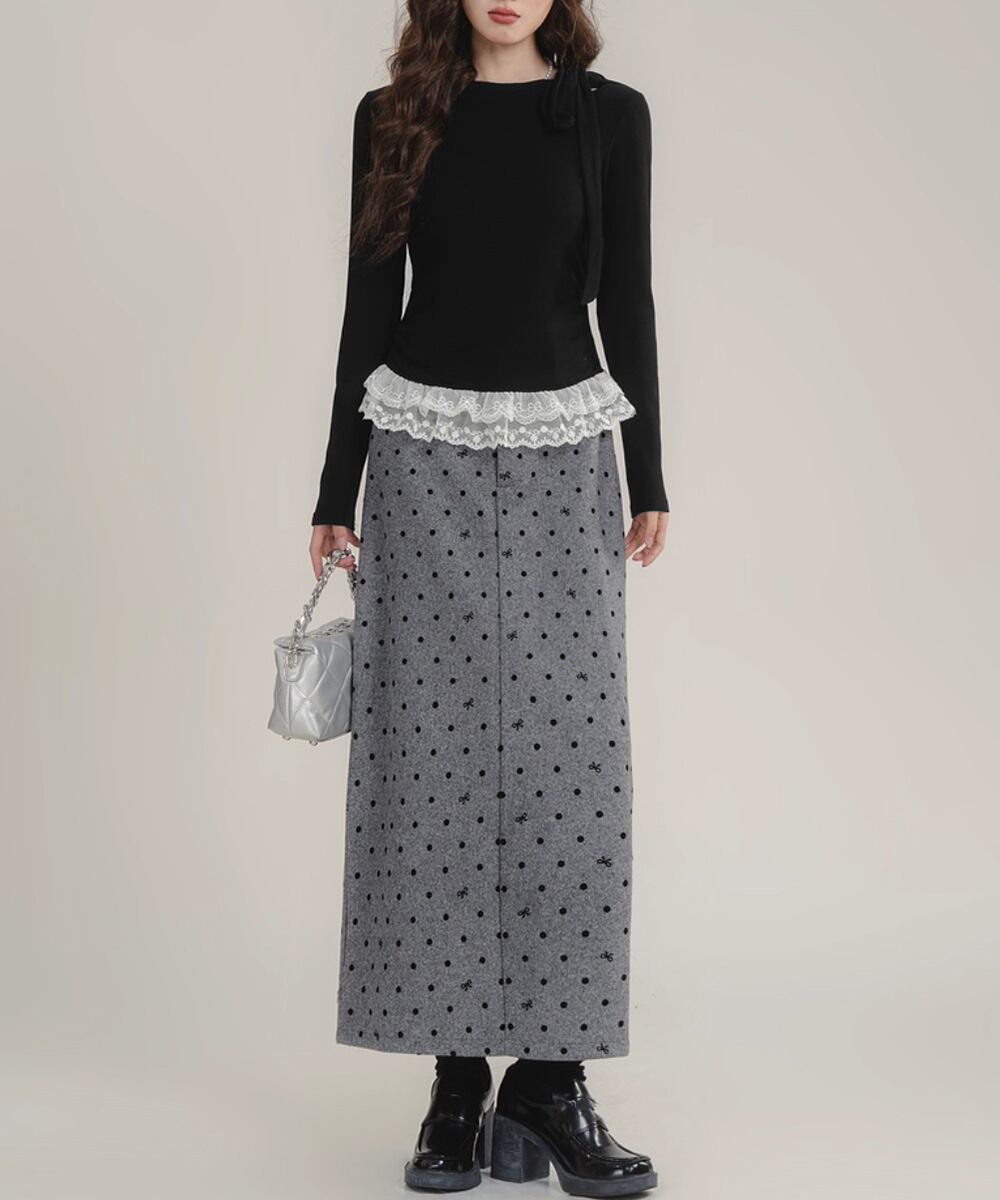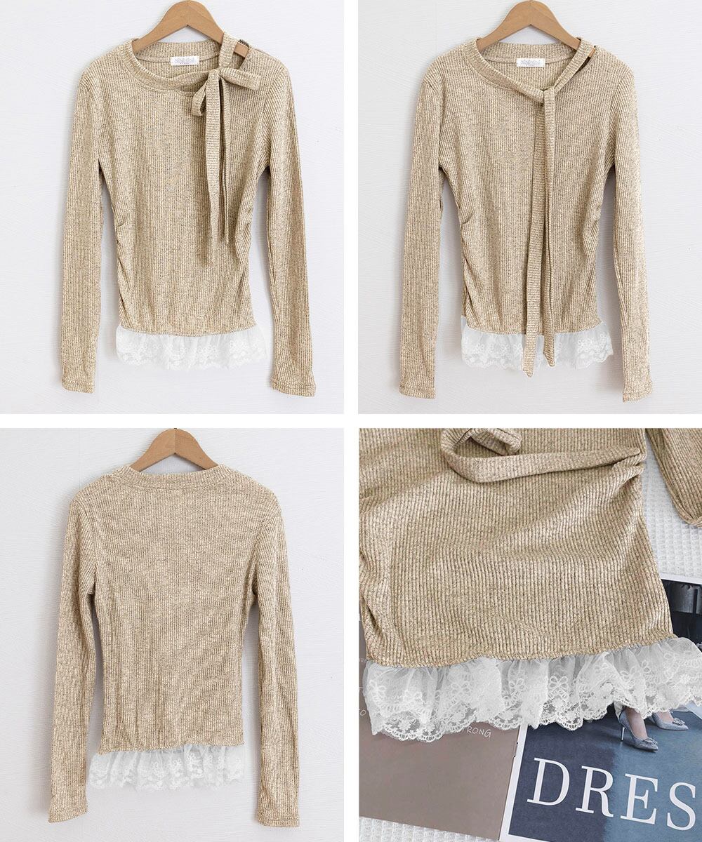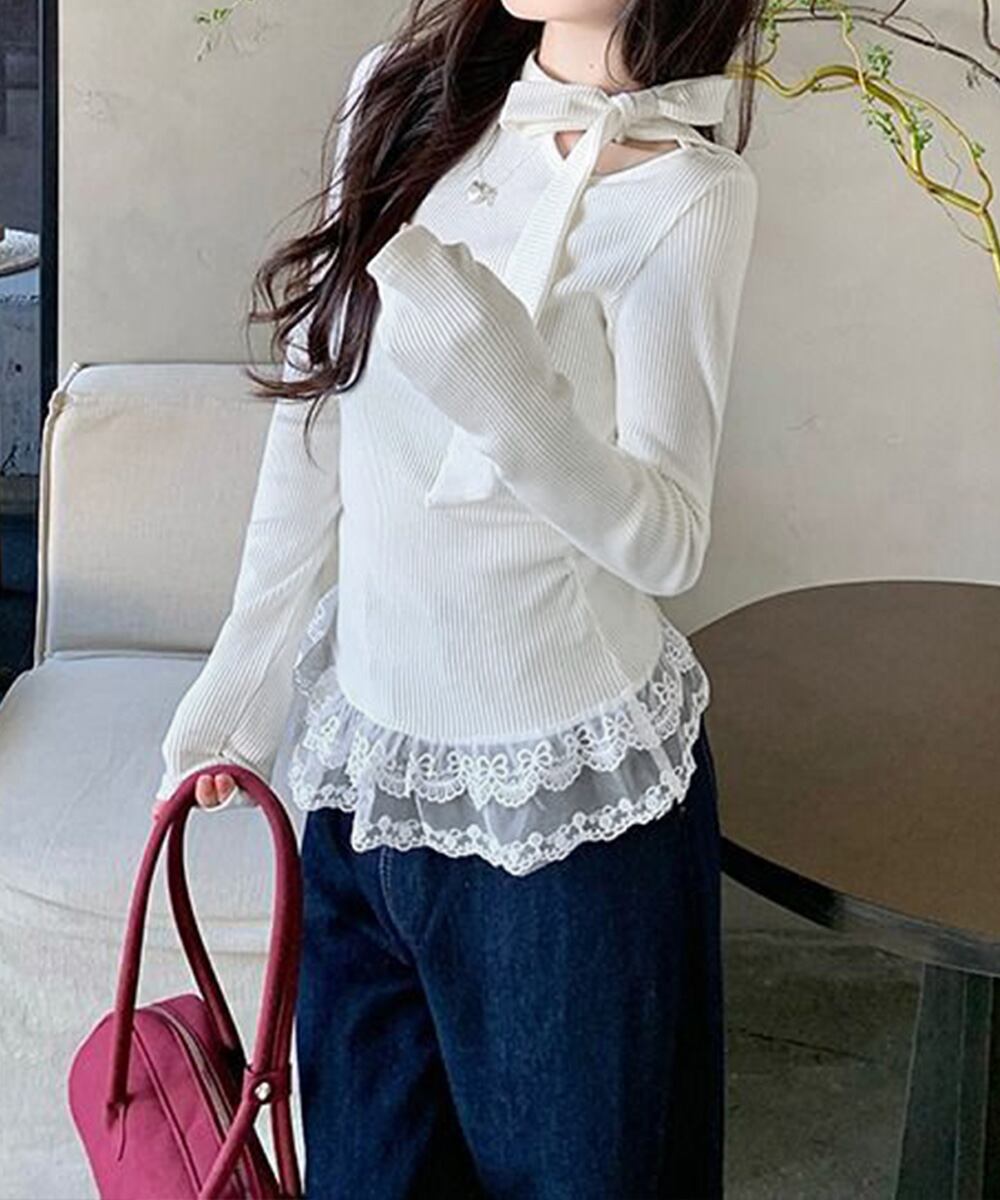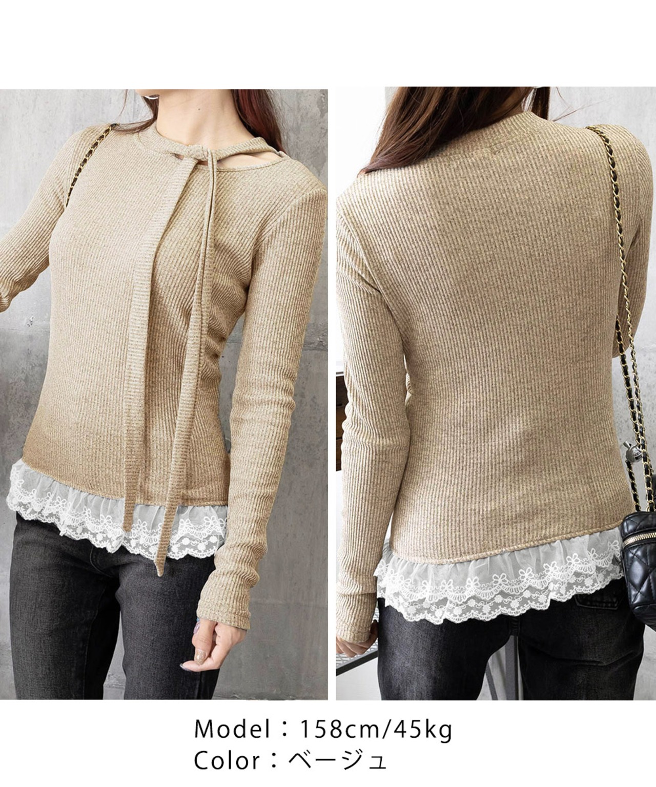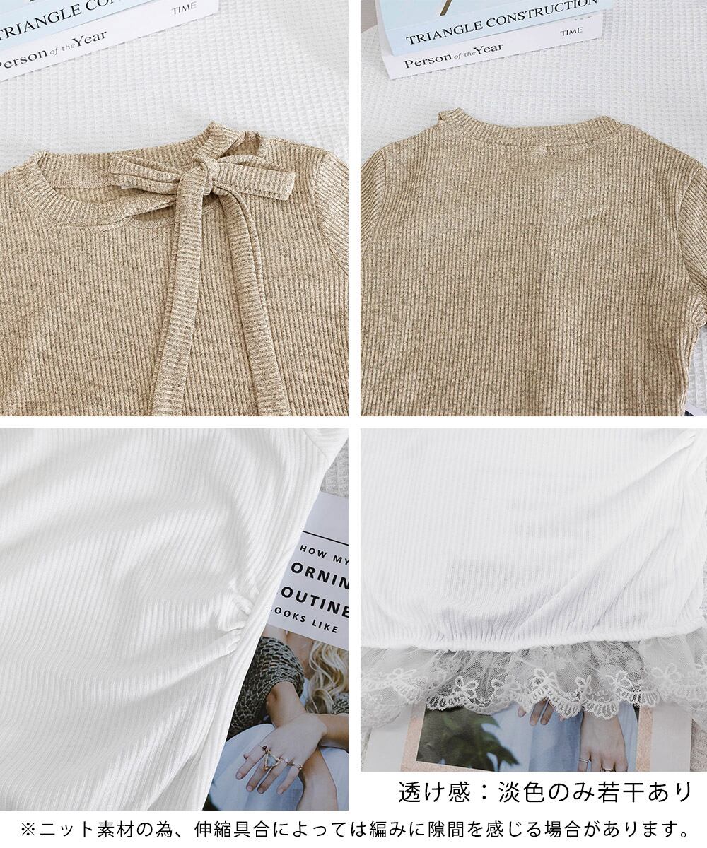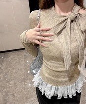 おしゃれ秋服レース フェミニントップス ボウタイ風ニット