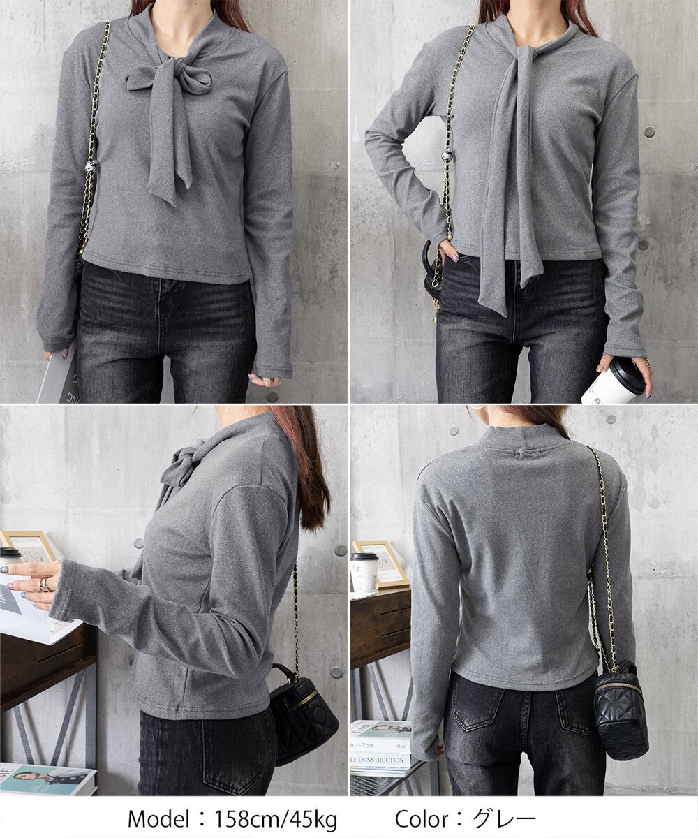 女性らしさを備えた大人のリボンタイ付き長袖カットソー。