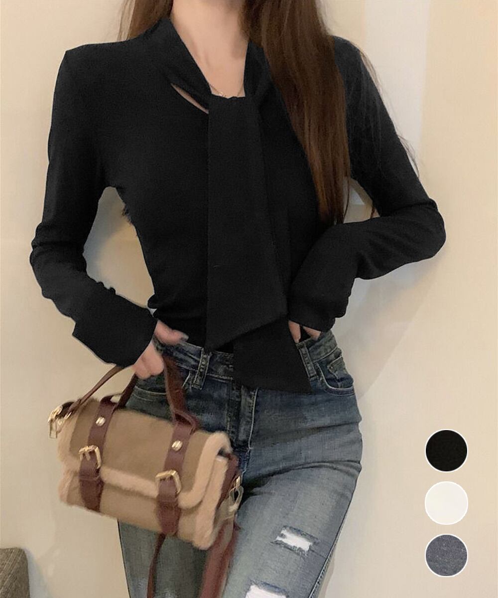 レディース 大人可愛い ボウタイカットソー スリムフィットタイトtシャツ 長袖無地カットソー 細見え 韓国風インナー秋冬