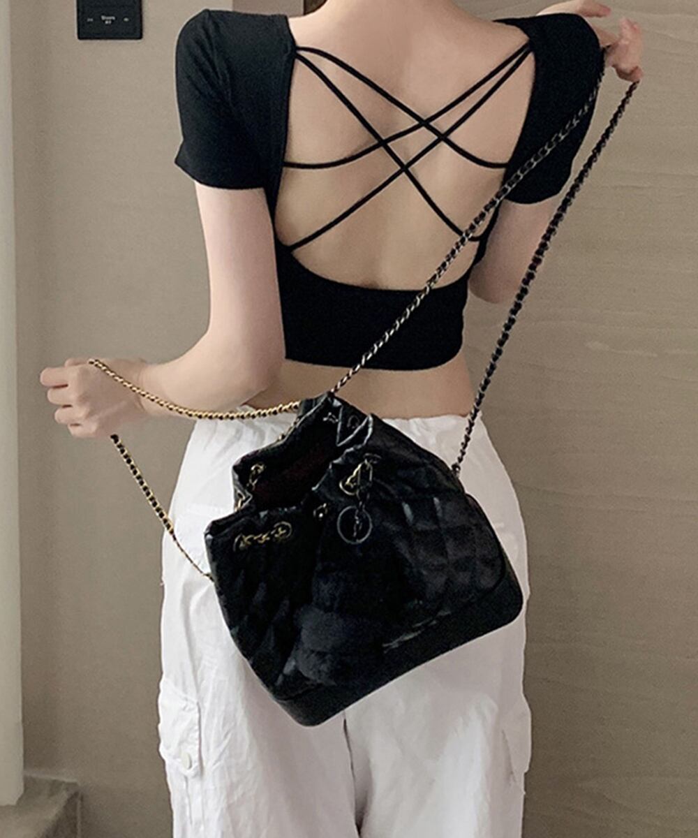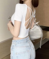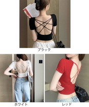 背中のクロスデザインが目を引く、大人可愛いショート丈トップス。