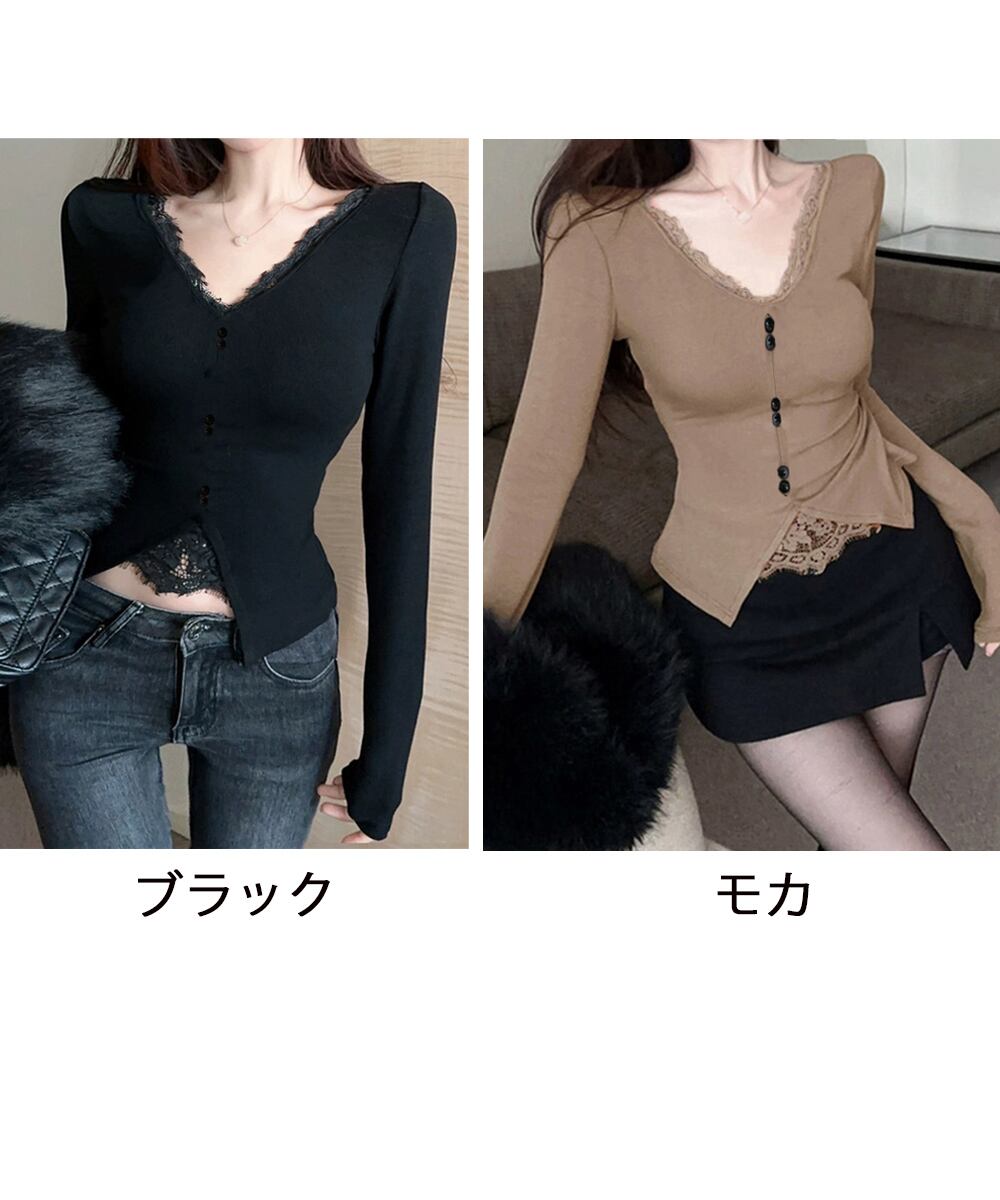 無地重ね着Tシャツ レース付きトップス 秋冬タイトトップス