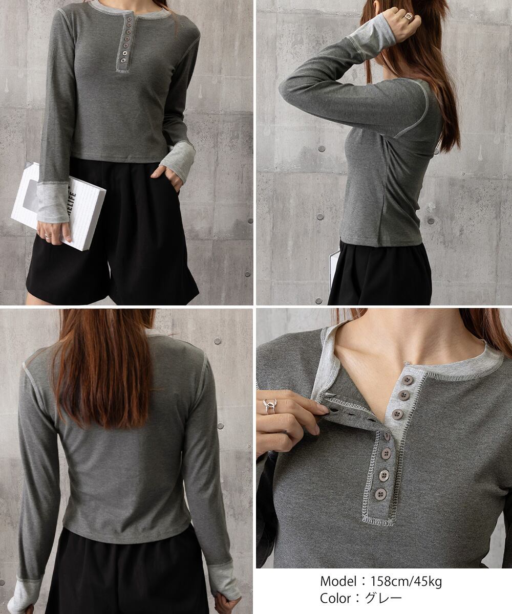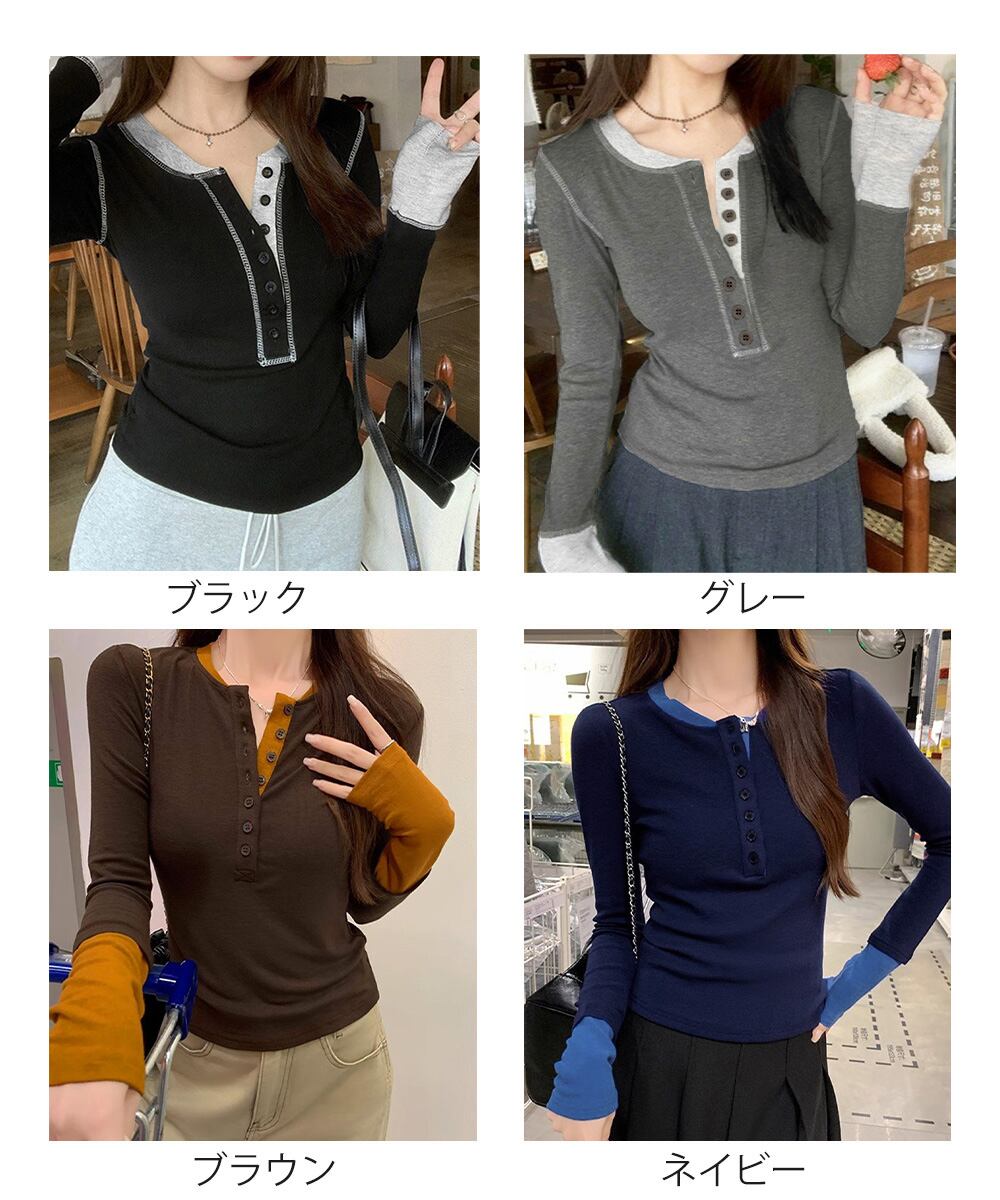 レディース バイカラーヘンリーネックTシャツ レイヤード風リブトップス 長袖タイトtシャツ シンプル細見え着回しトップス
