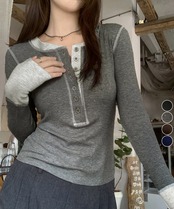 細身カットソー無地 フロントボタン秋服 着やせtシャツ 黒