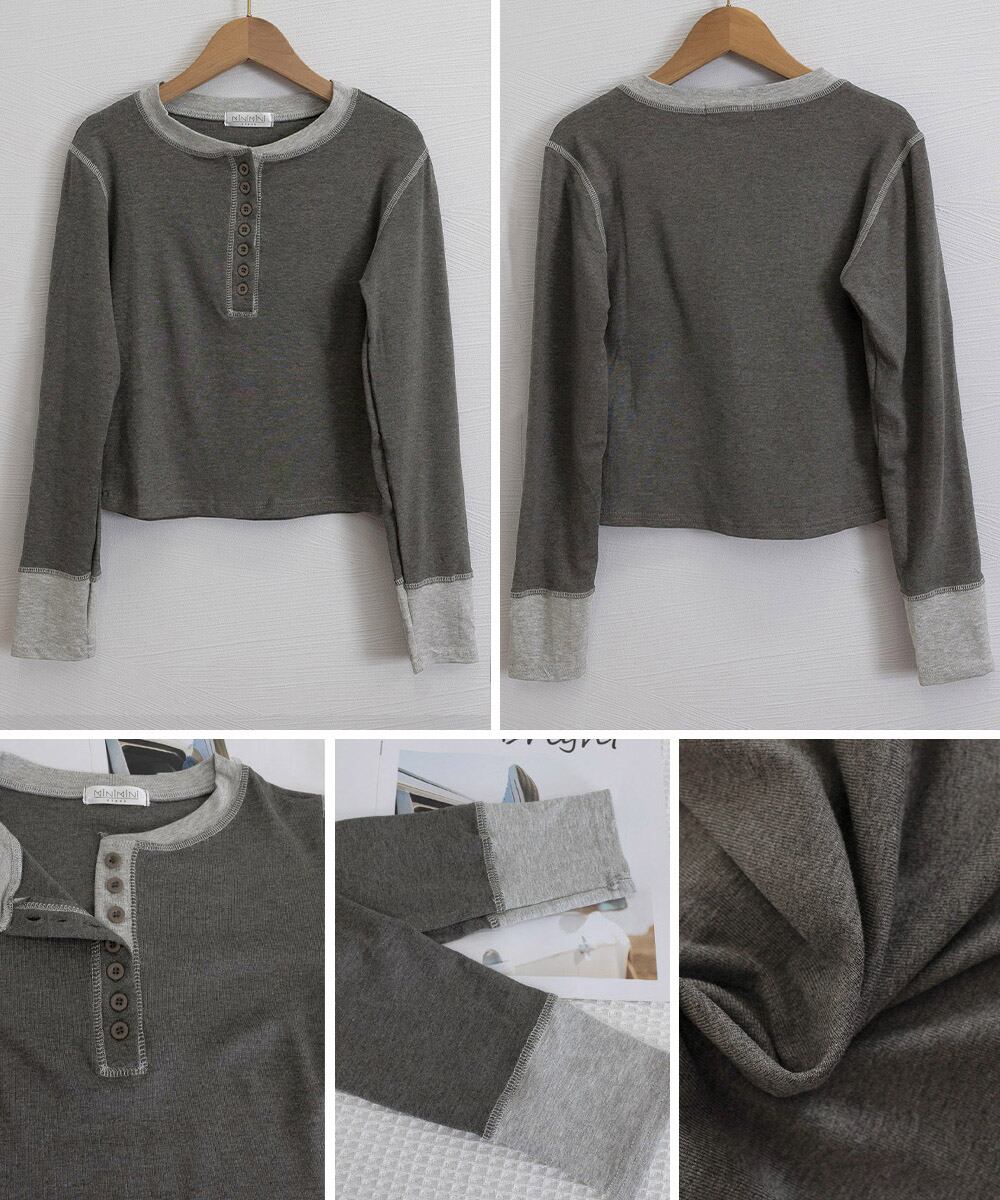 配色のコントラストが映えるリブ編みのヘンリーネックカットソー。