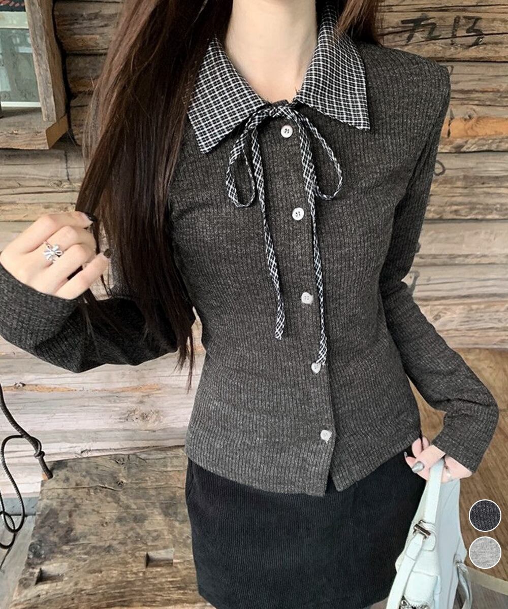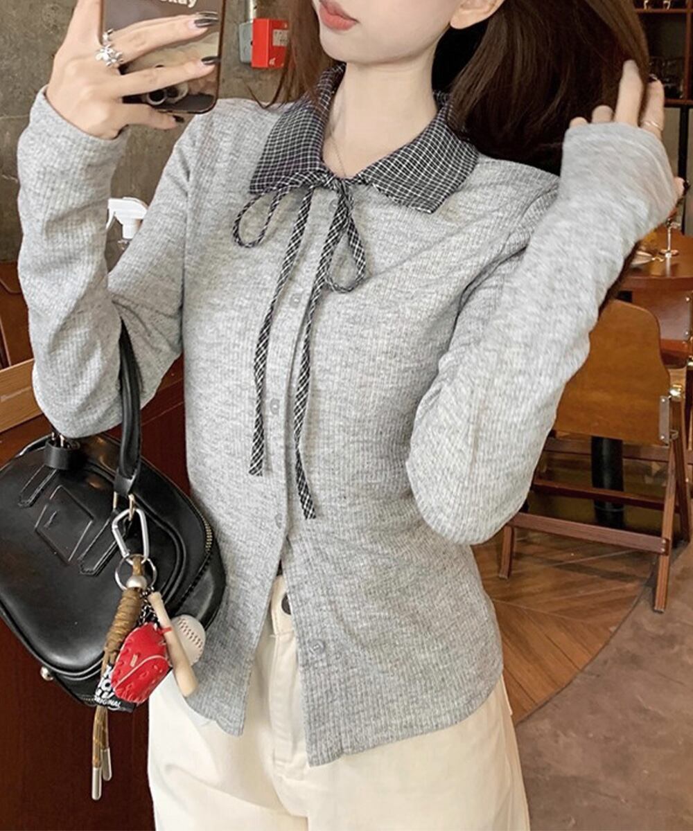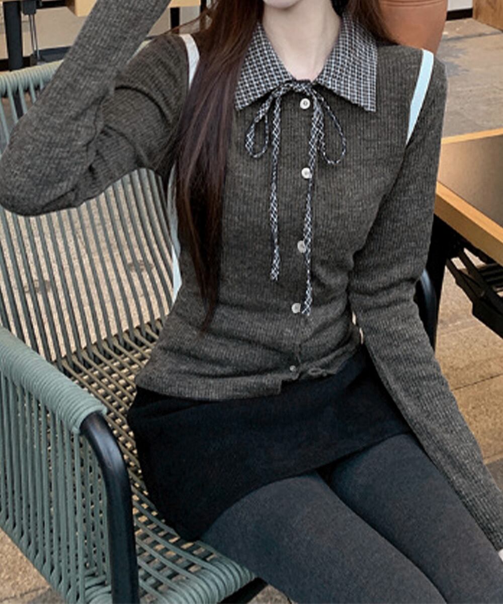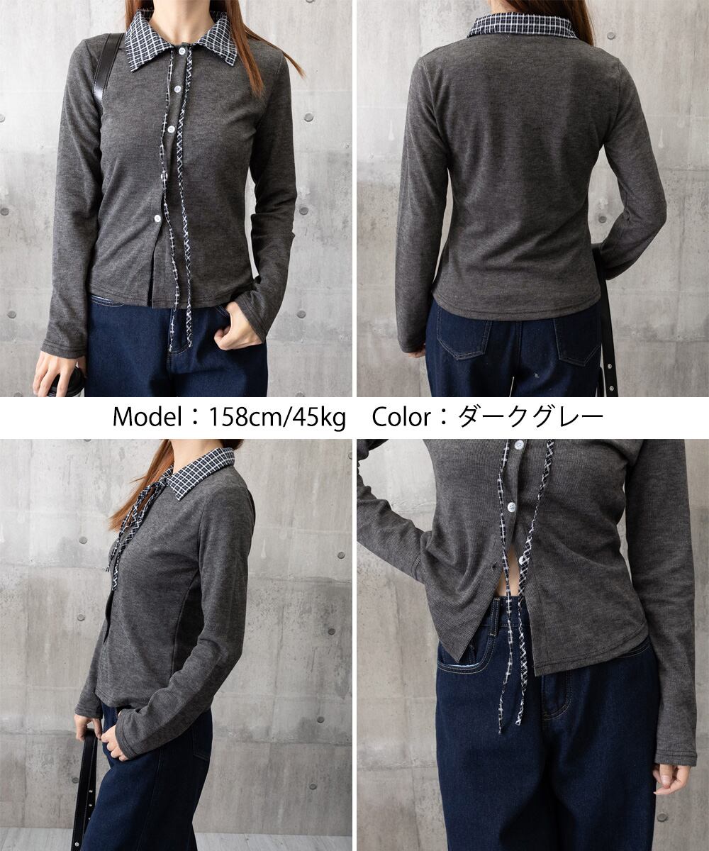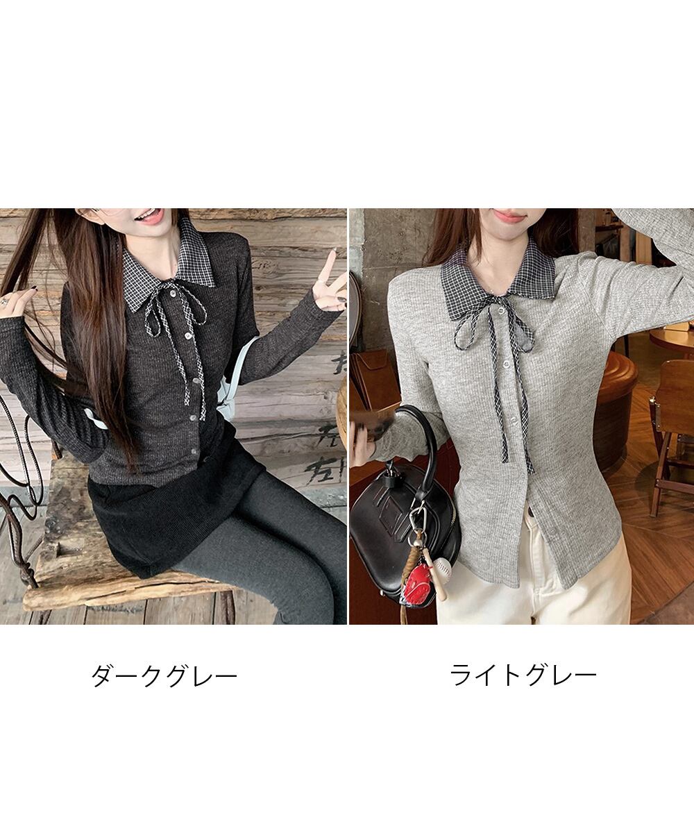 おしゃれ チェック衿 配色ニットカットソー レディース 可愛い レイヤード風 長袖ニットカーデ きれいめ 細見えトップス