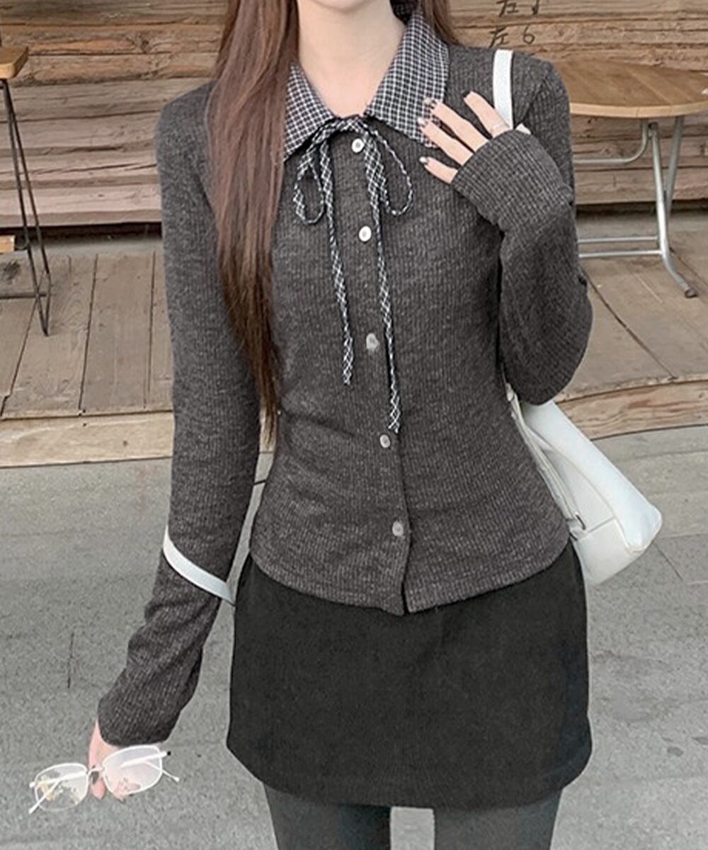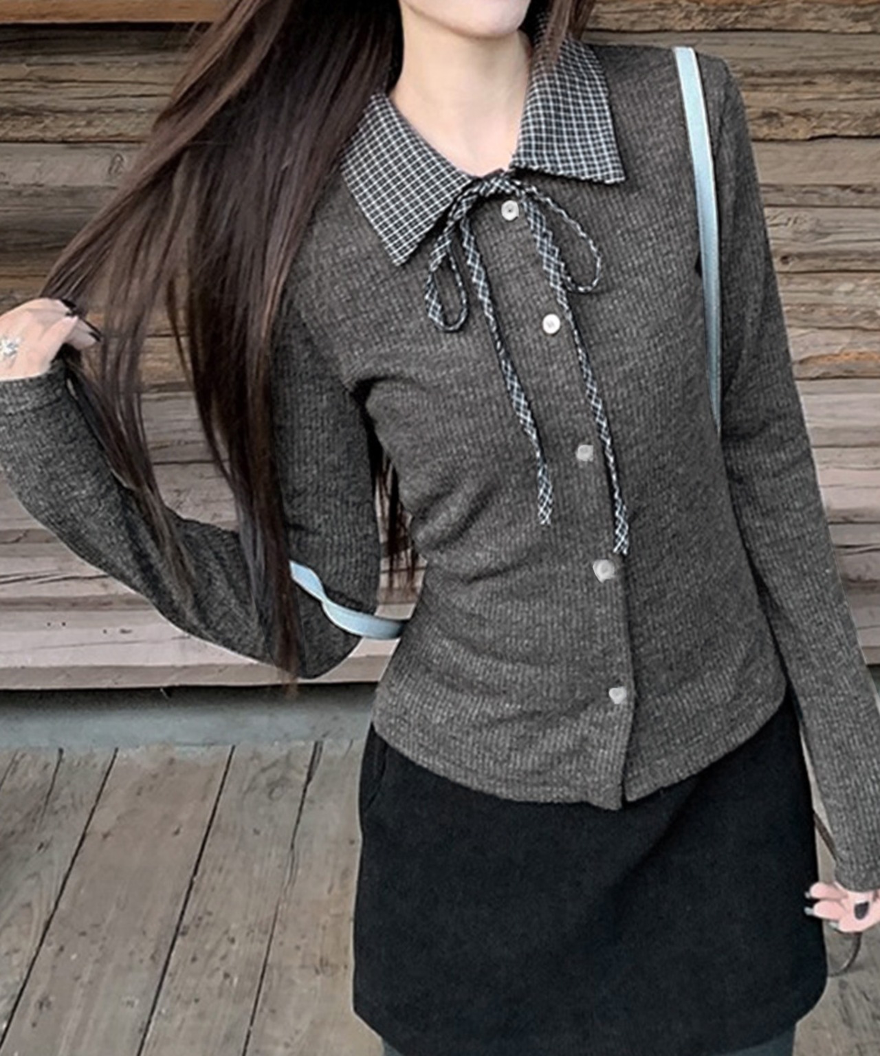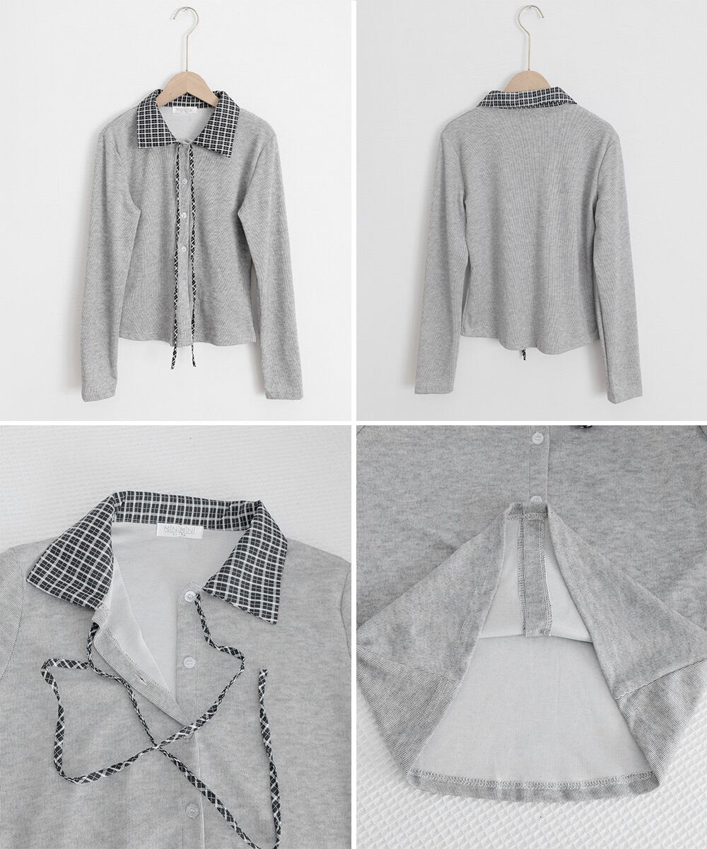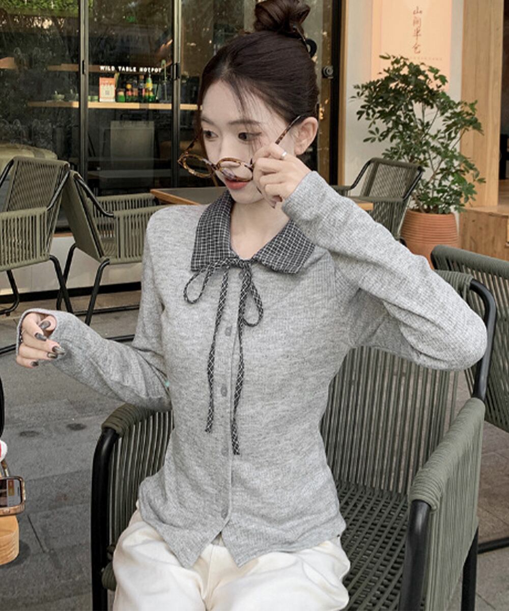 おしゃれ チェック衿 配色ニットカットソー レディース 可愛い レイヤード風 長袖ニットカーデ きれいめ 細見えトップス