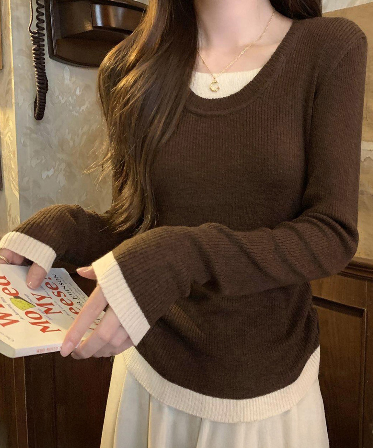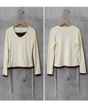 1枚で重ね着風スタイルが完成する、配色デザインの長袖トップス。