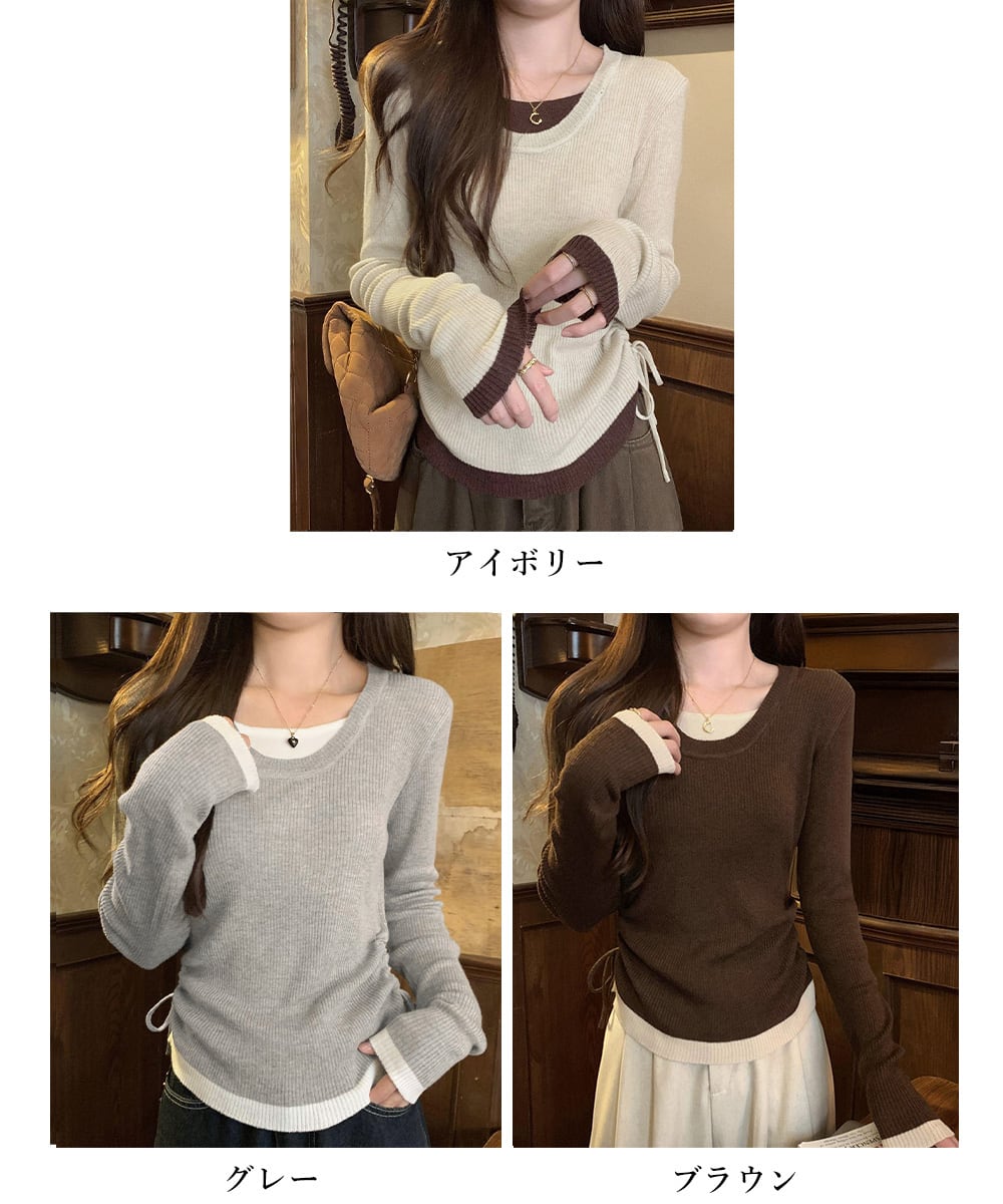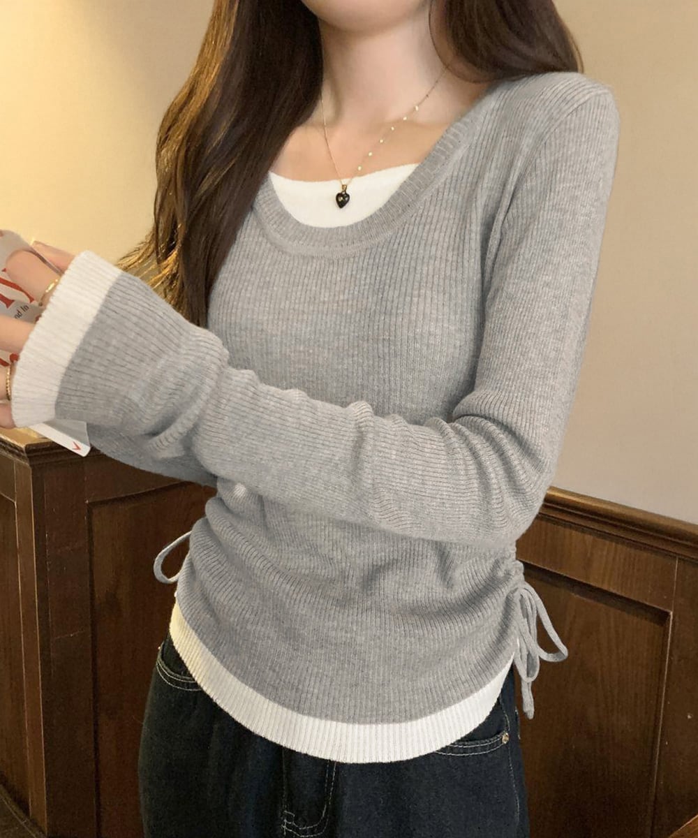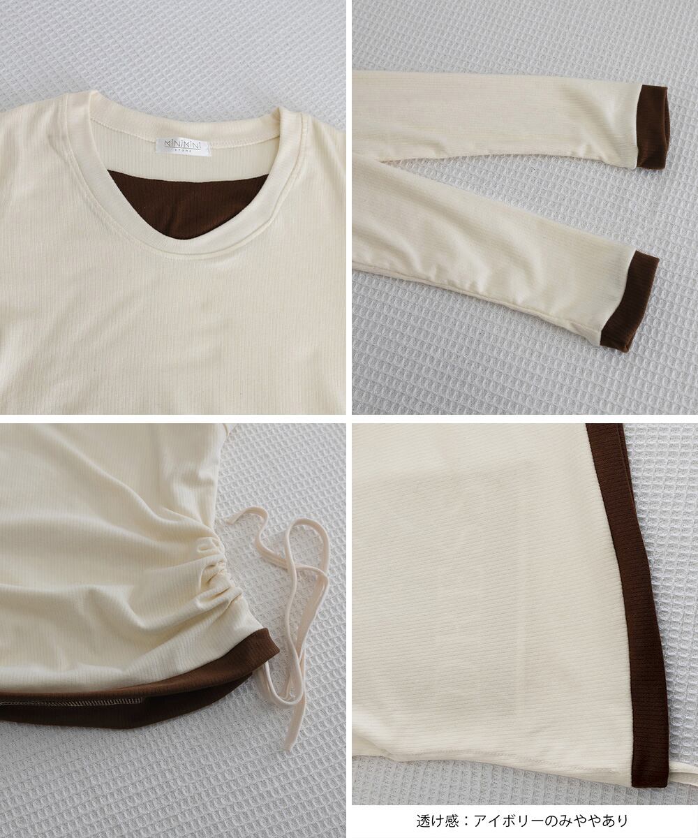 レディース Uネック 重ね着風カットソーサイドギャザー 配色リブトップス 大人カジュアルプルオーバー両側ドローストリング