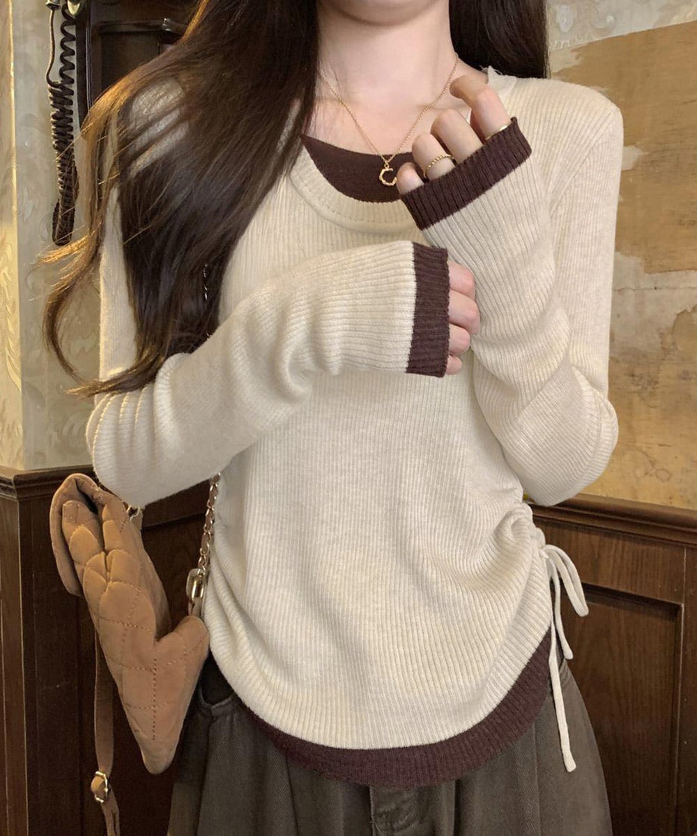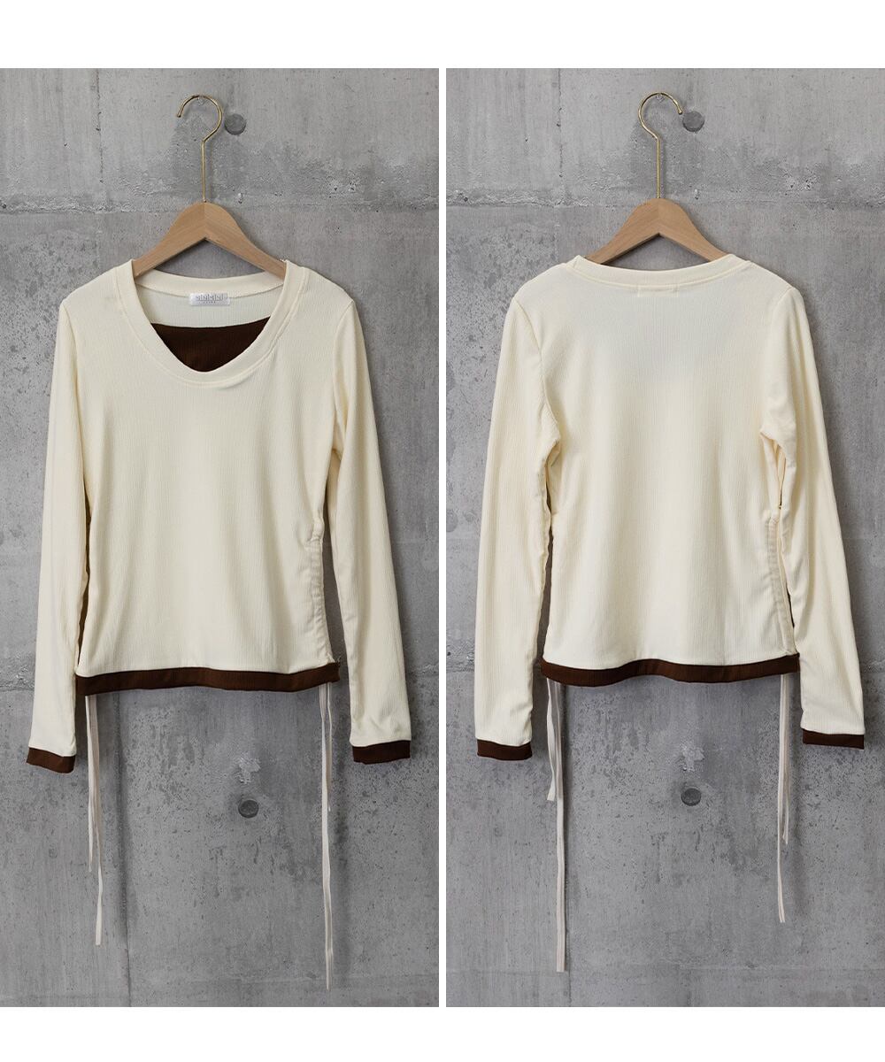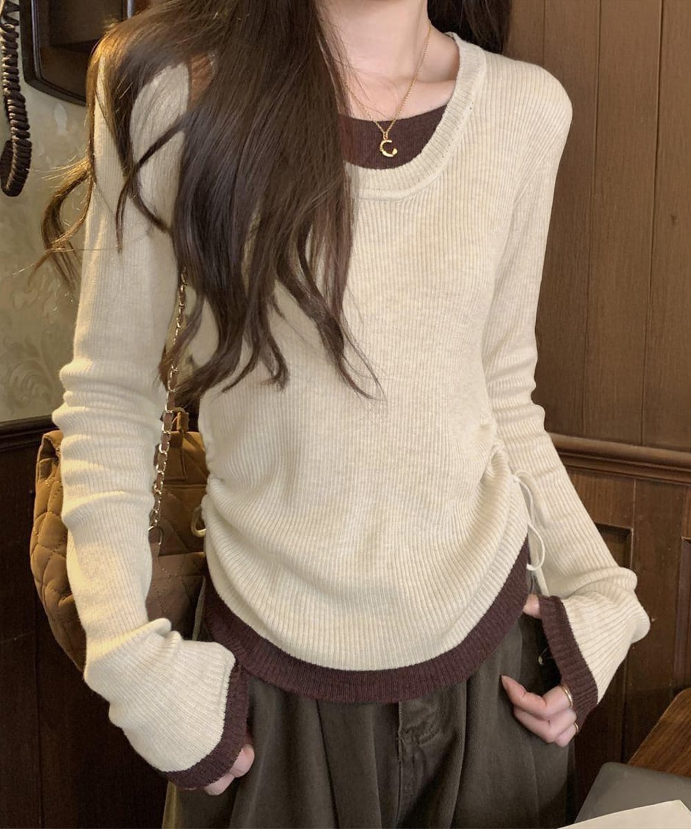 レディース Uネック 重ね着風カットソーサイドギャザー 配色リブトップス 大人カジュアルプルオーバー両側ドローストリング