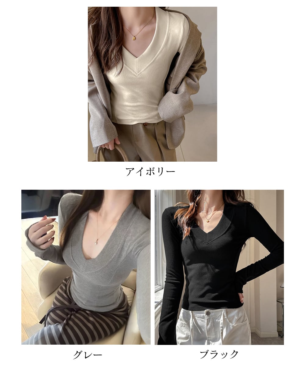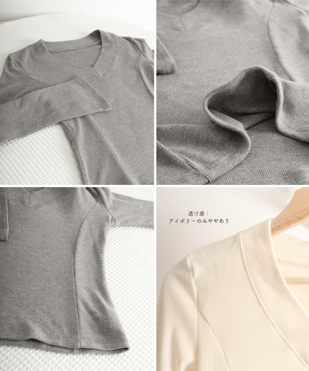 女性らしいVネックデザインがデコルテをきれいに見せる長袖インナー。