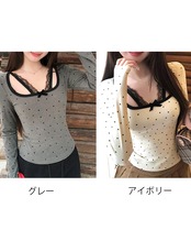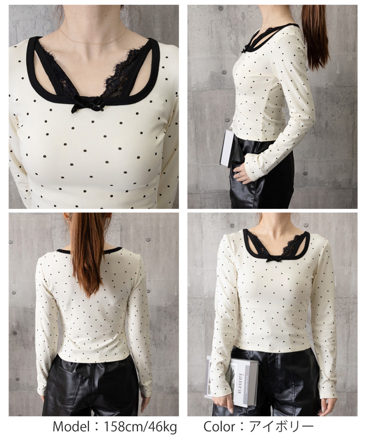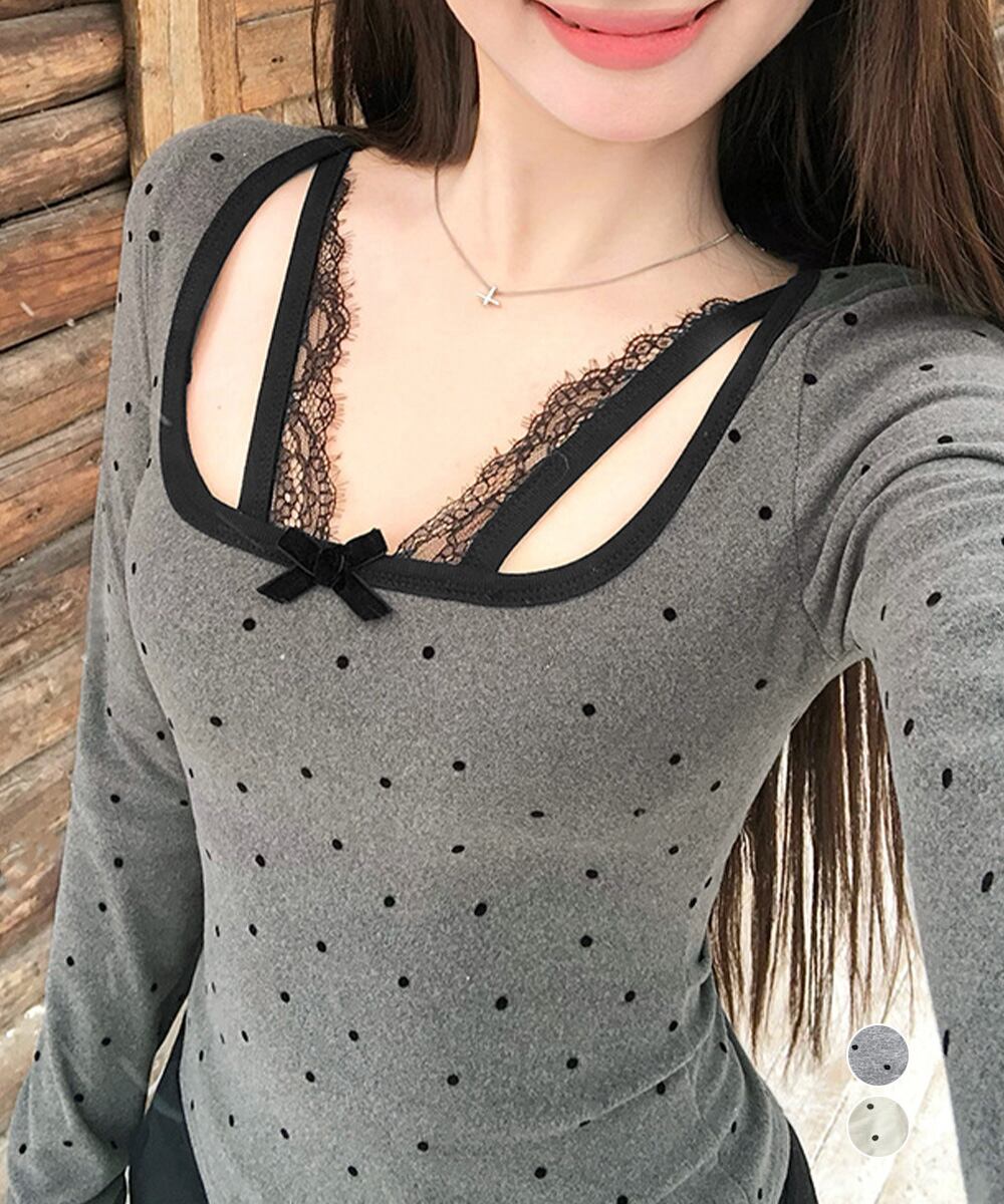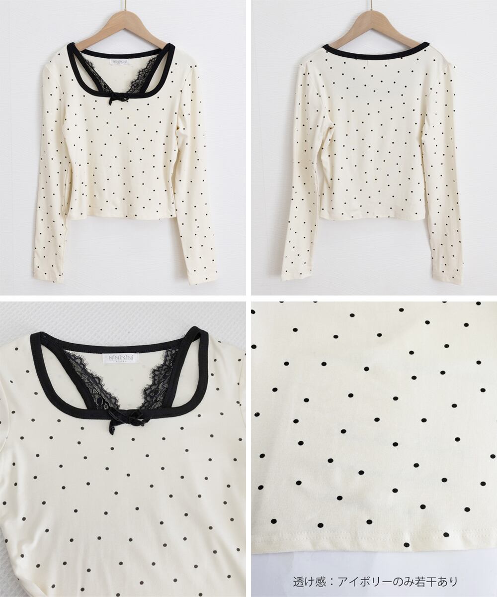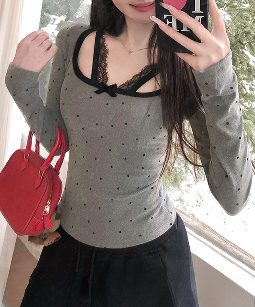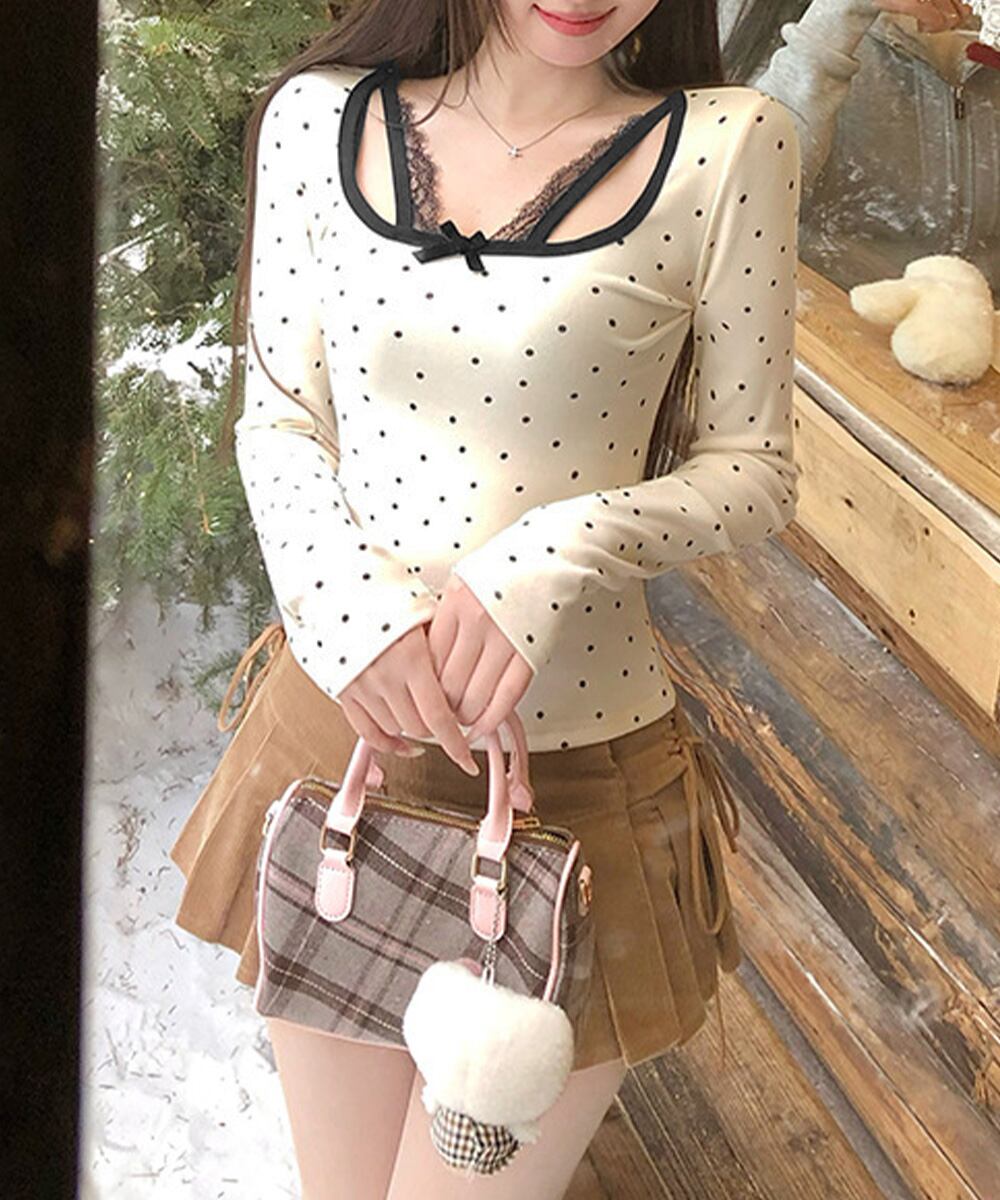 ドット柄×胸元レース×リボンのトリプルデザインで、簡単におしゃれ見え。