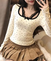 胸元レース切替トップス レディース パイピング リボントップス おしゃれ細身Tシャツカジュアルインナートップス 重ね着風