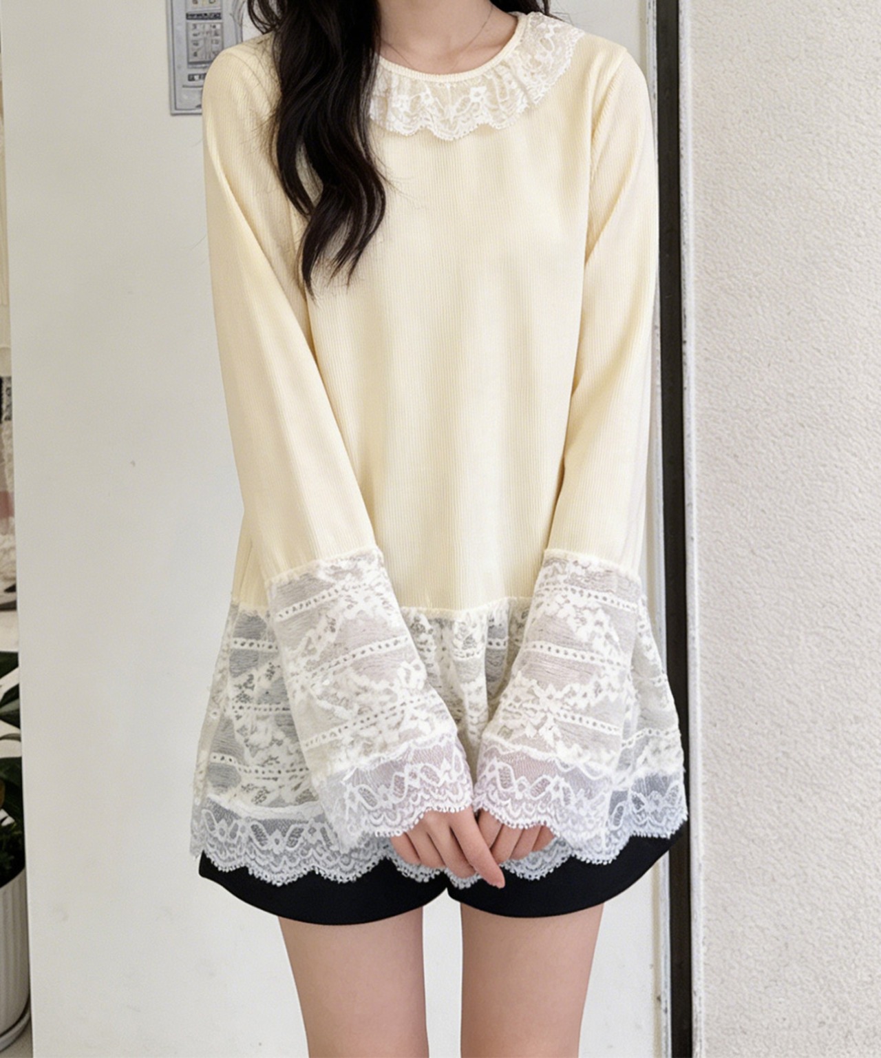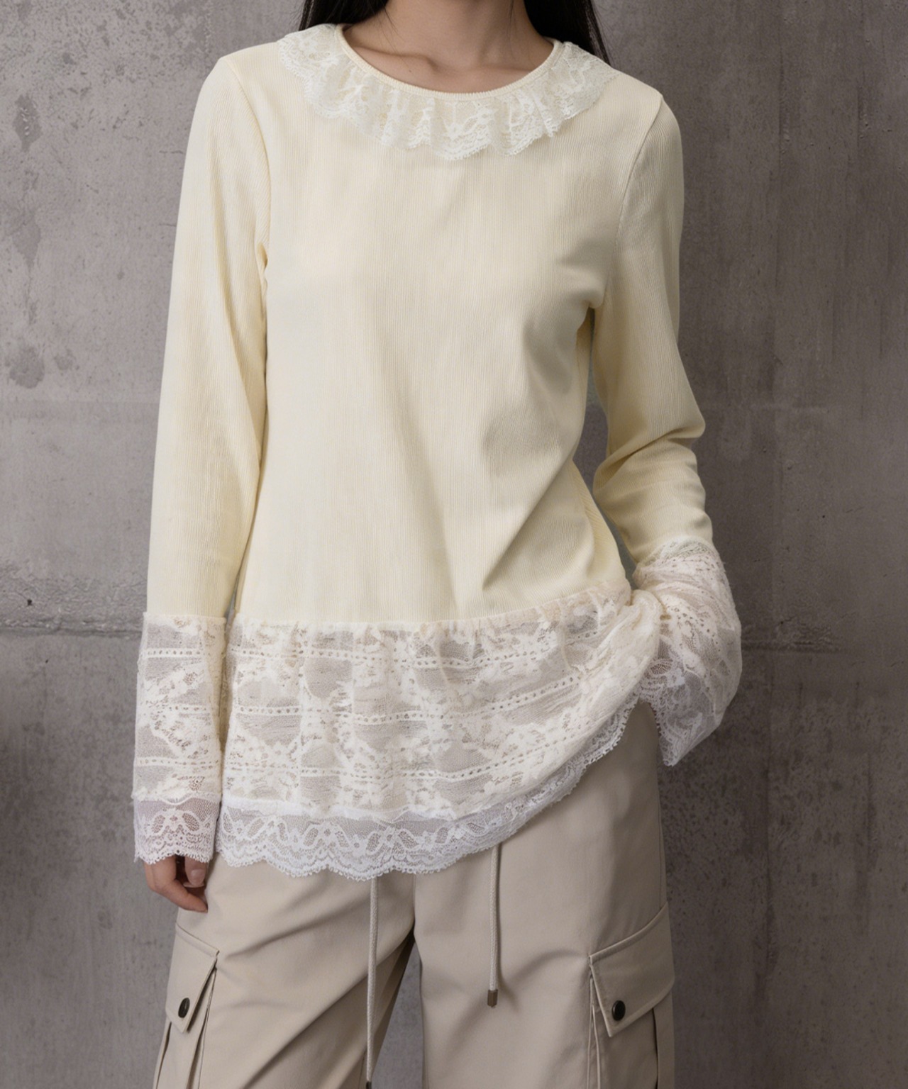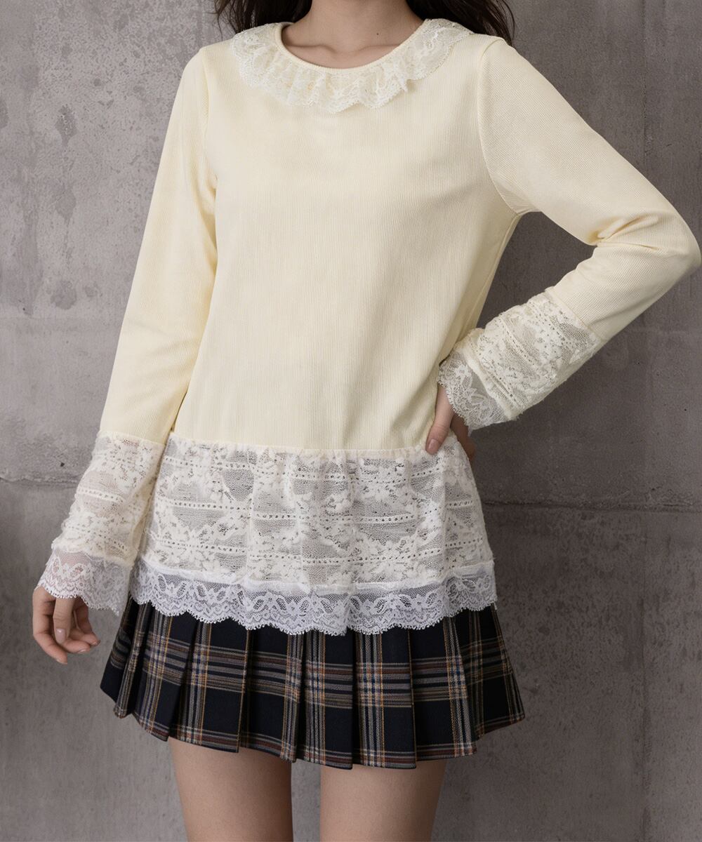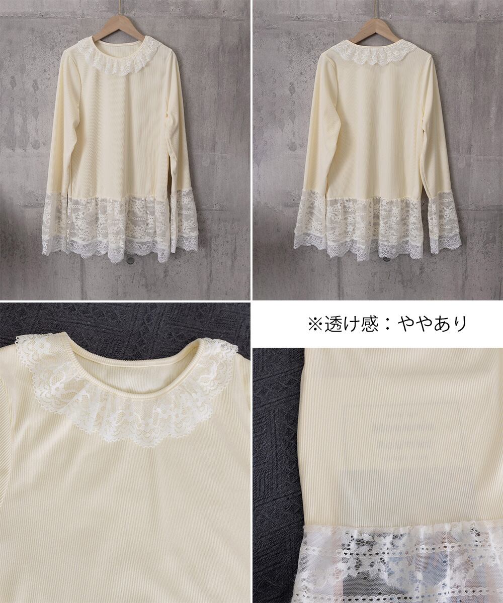 襟元・袖口・裾にレースをあしらった、フェミニンなロングTシャツ。