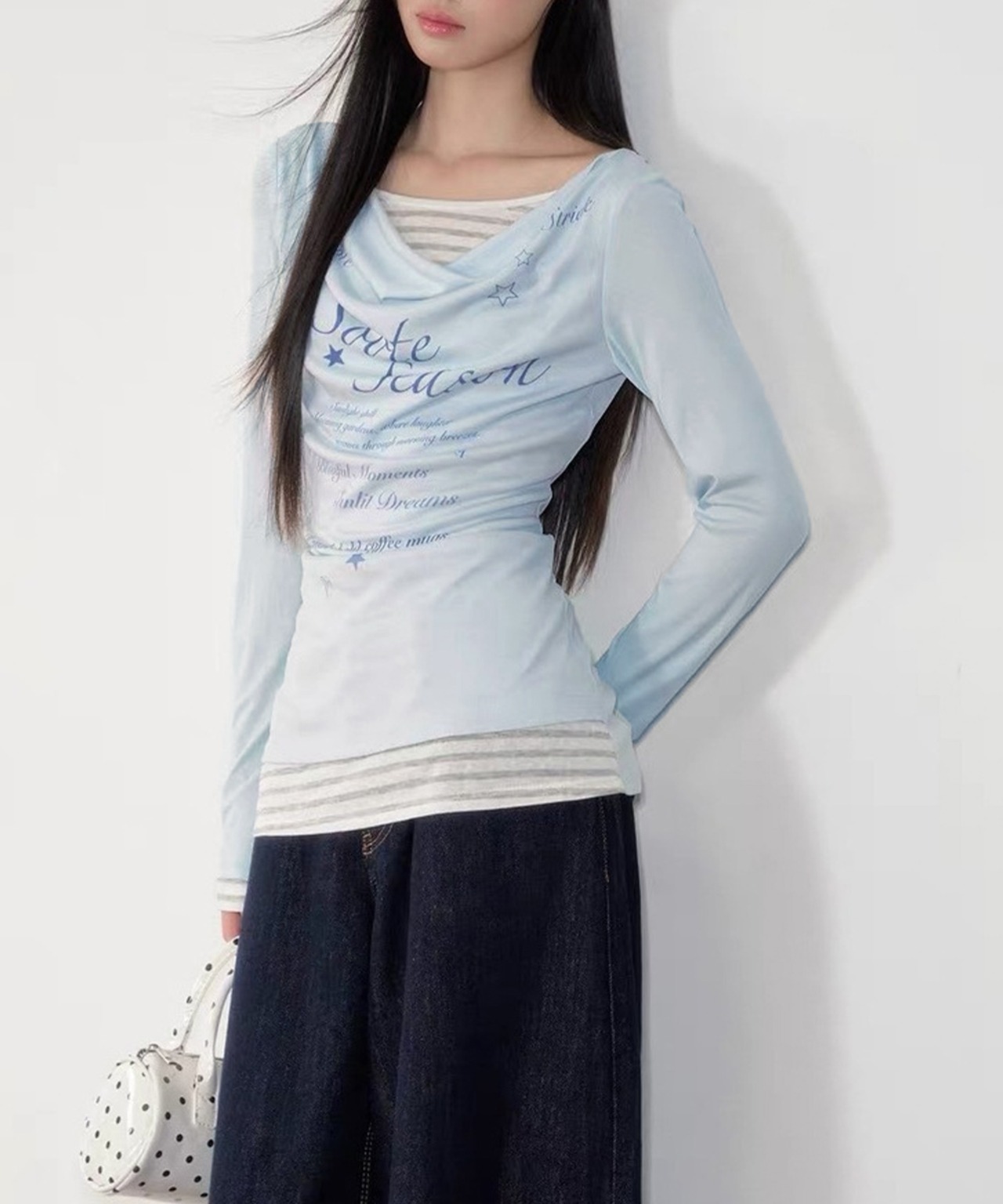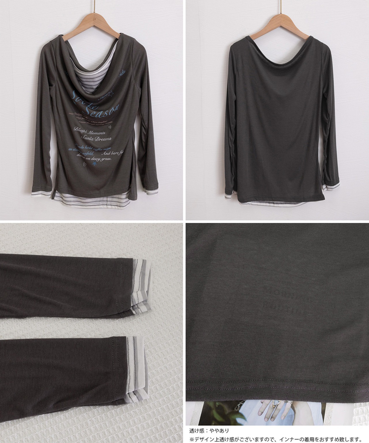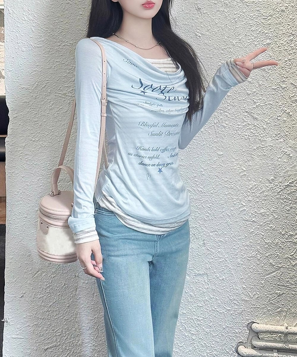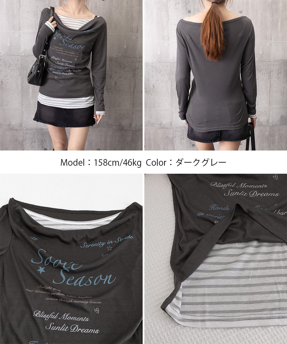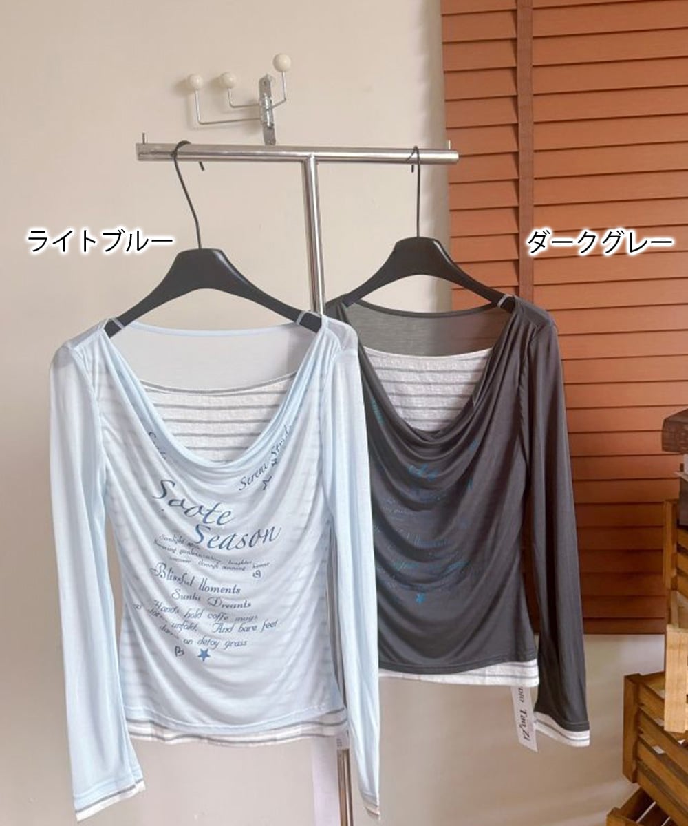 ドレープネックにレタリングデザインを施した、シアーロングTシャツとボーダーインナーのフェイクレイヤードトップス。