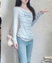 レディースカウルネックロンT重ね着風 細身Tシャツ長袖 シアーロングtシャツ薄手プルオーバー韓国風レタリングT Y2K風
