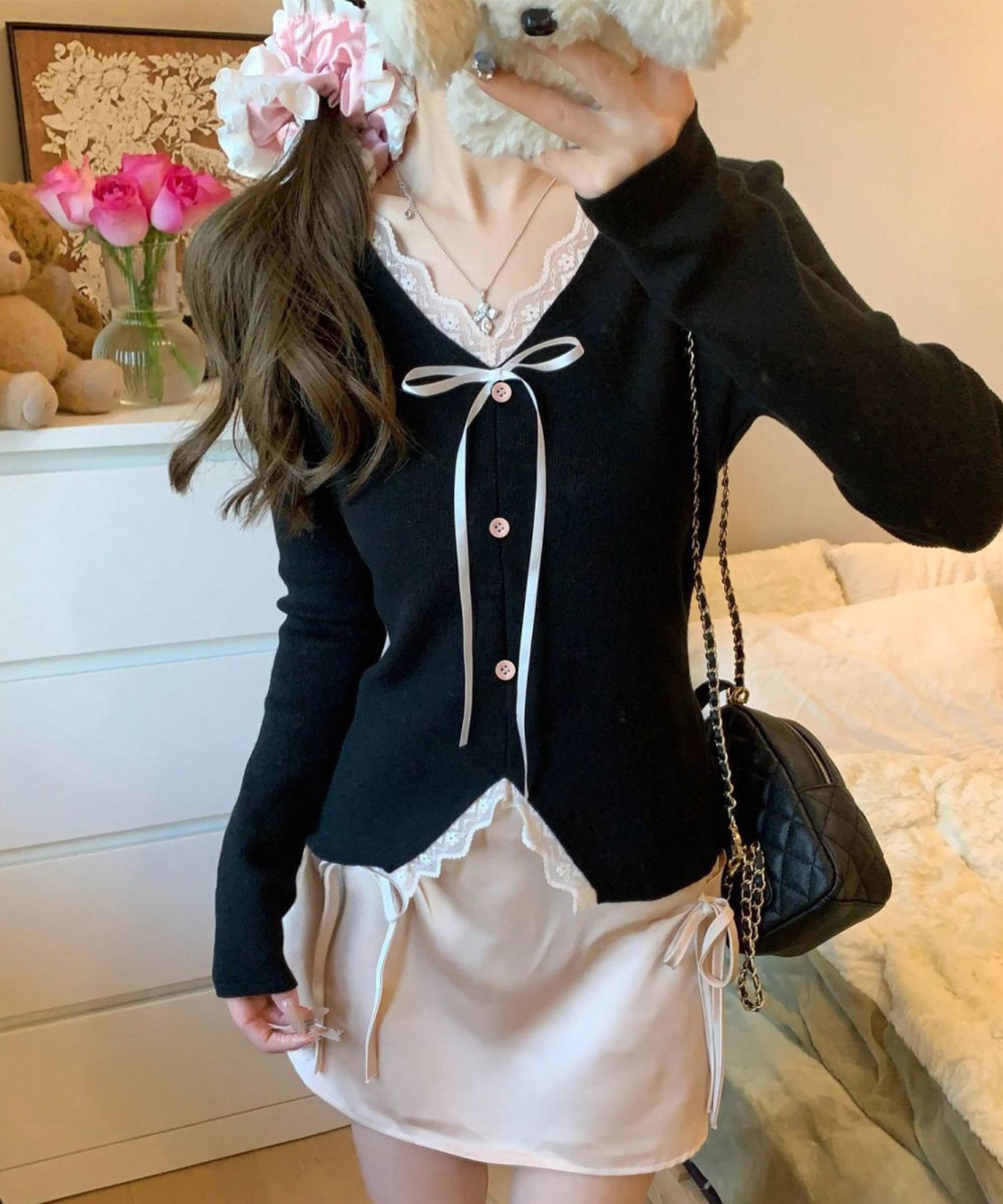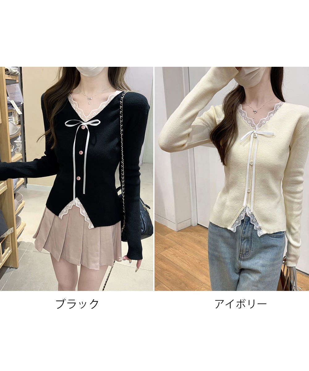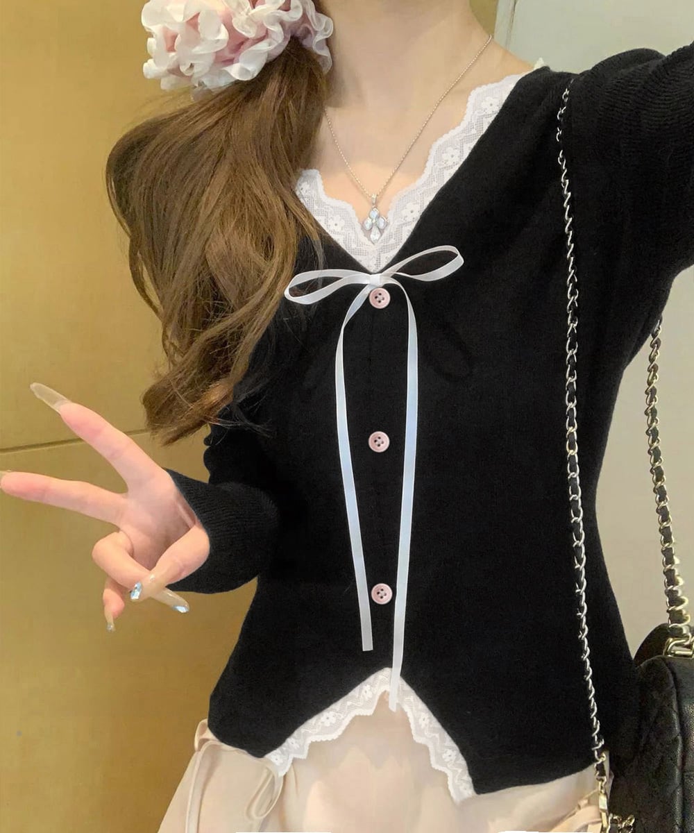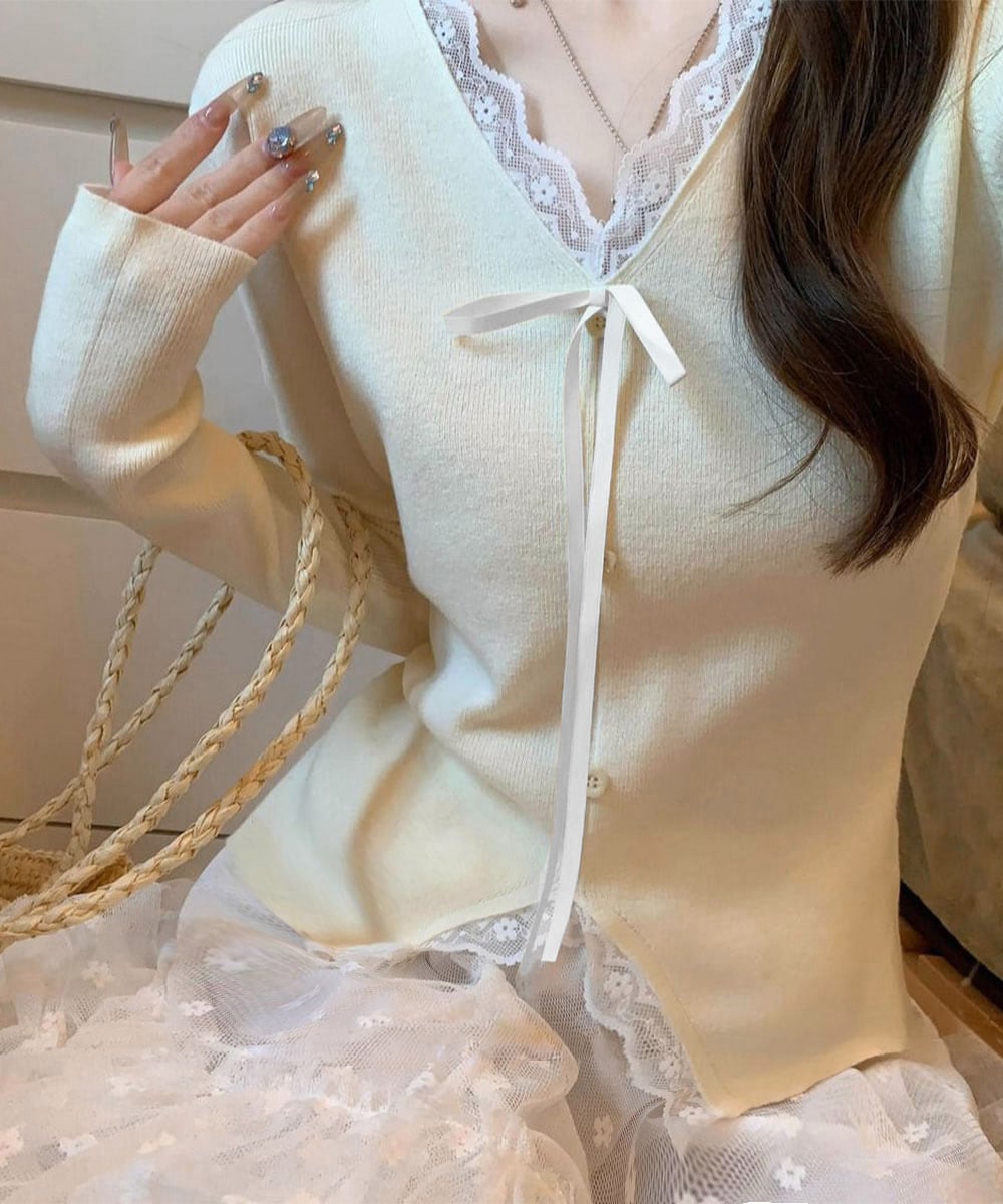 Vネックにあしらったレースとリボンが、上品な甘さをプラス。