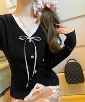 リボンニットトップスレース切り替え 長袖