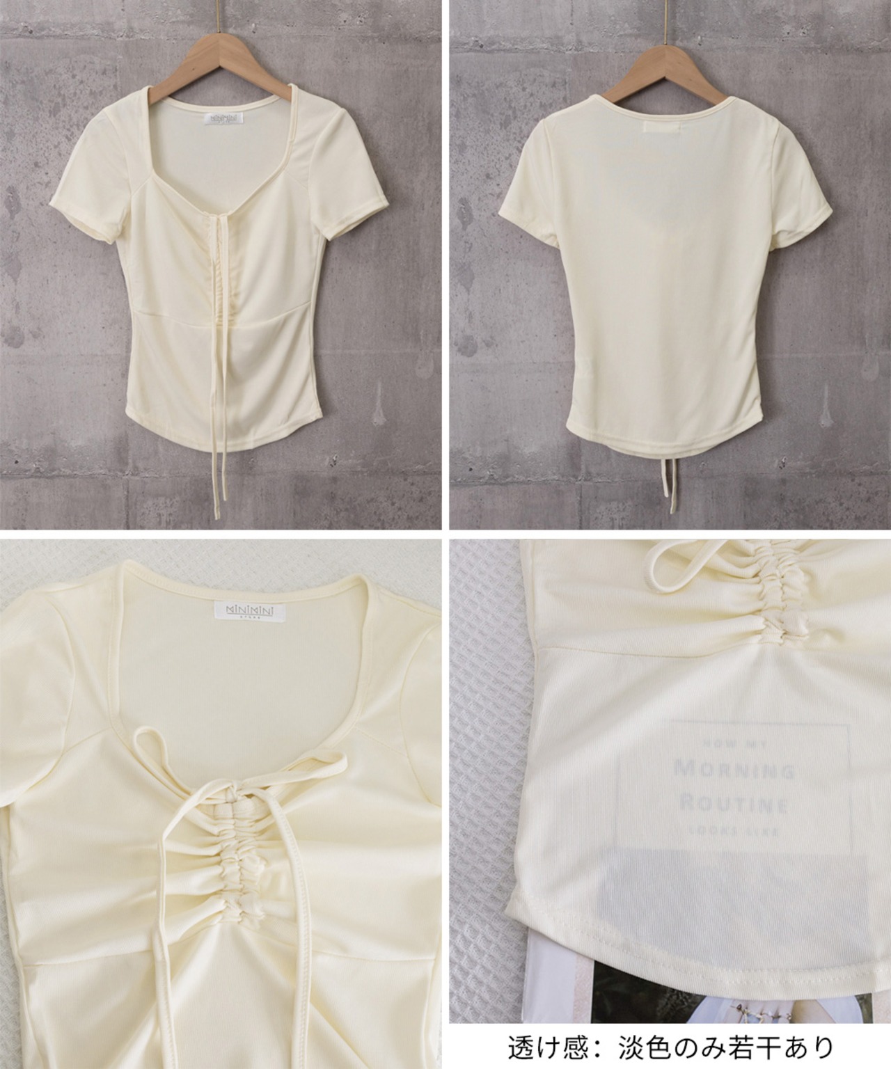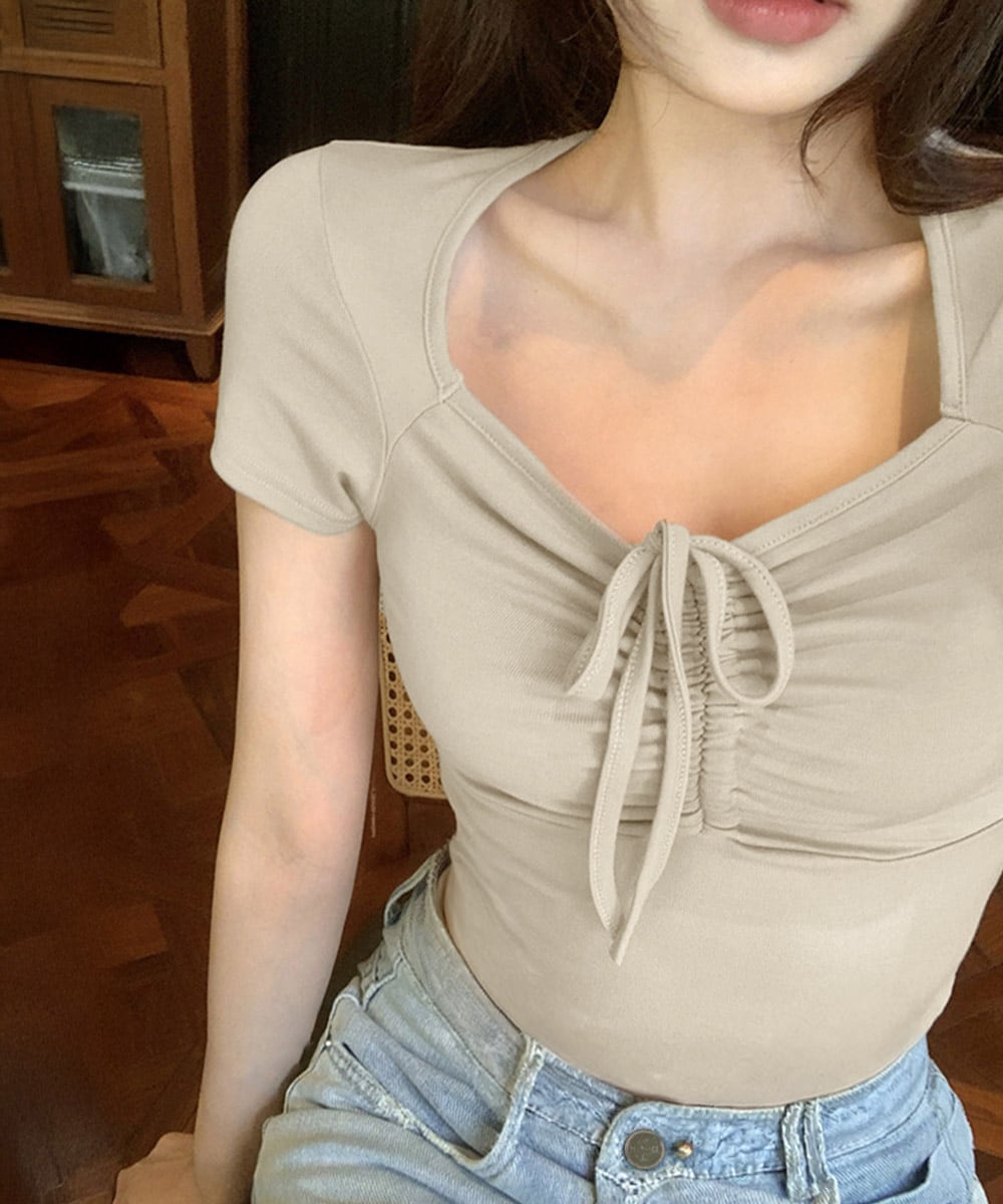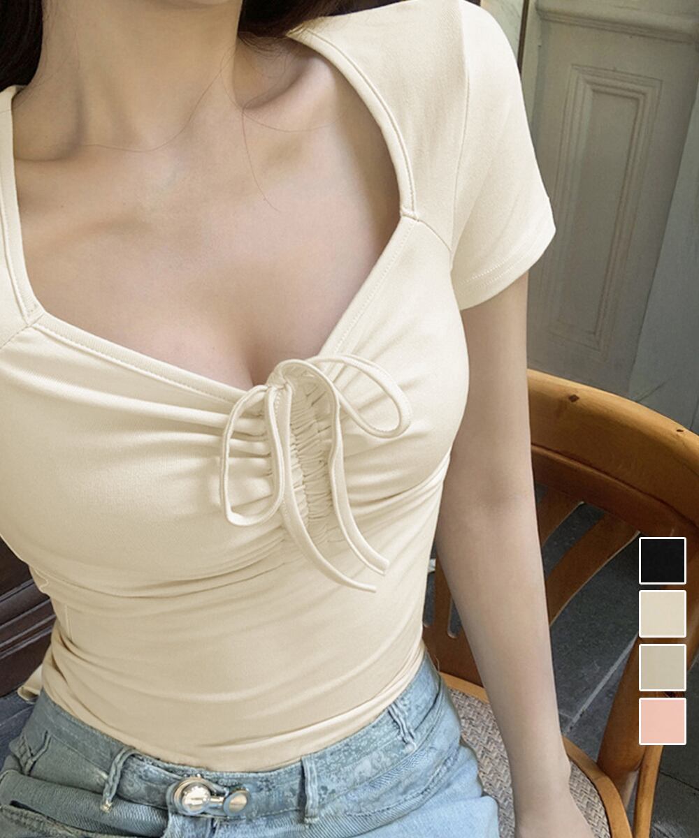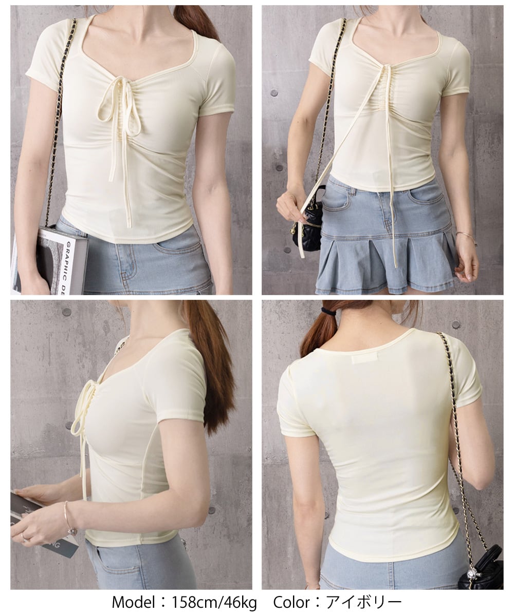 スクエアネック×ドローストリングのレディース半袖Tシャツ。
