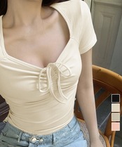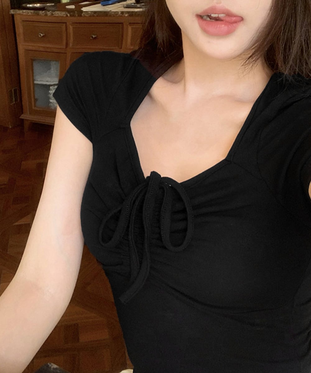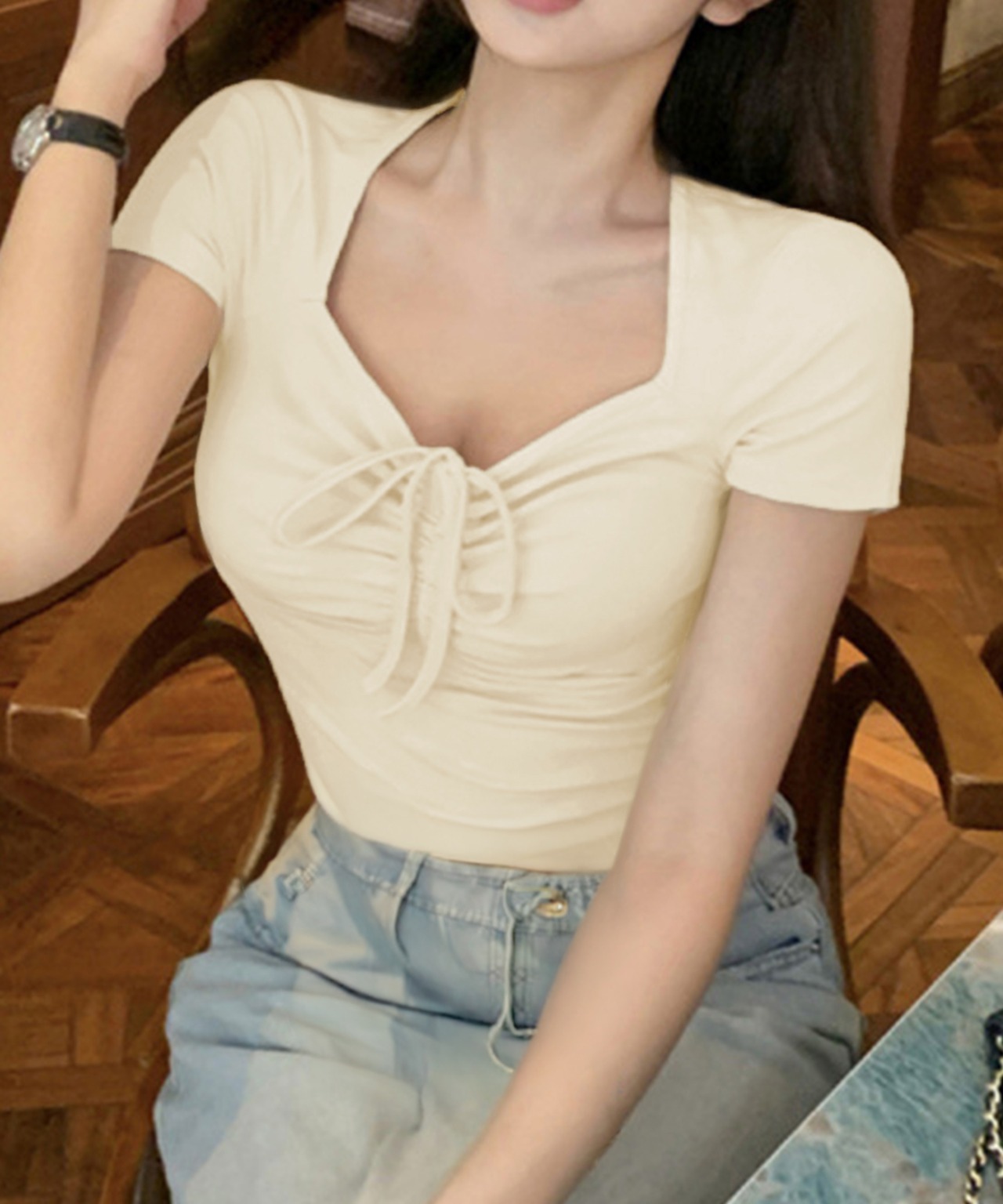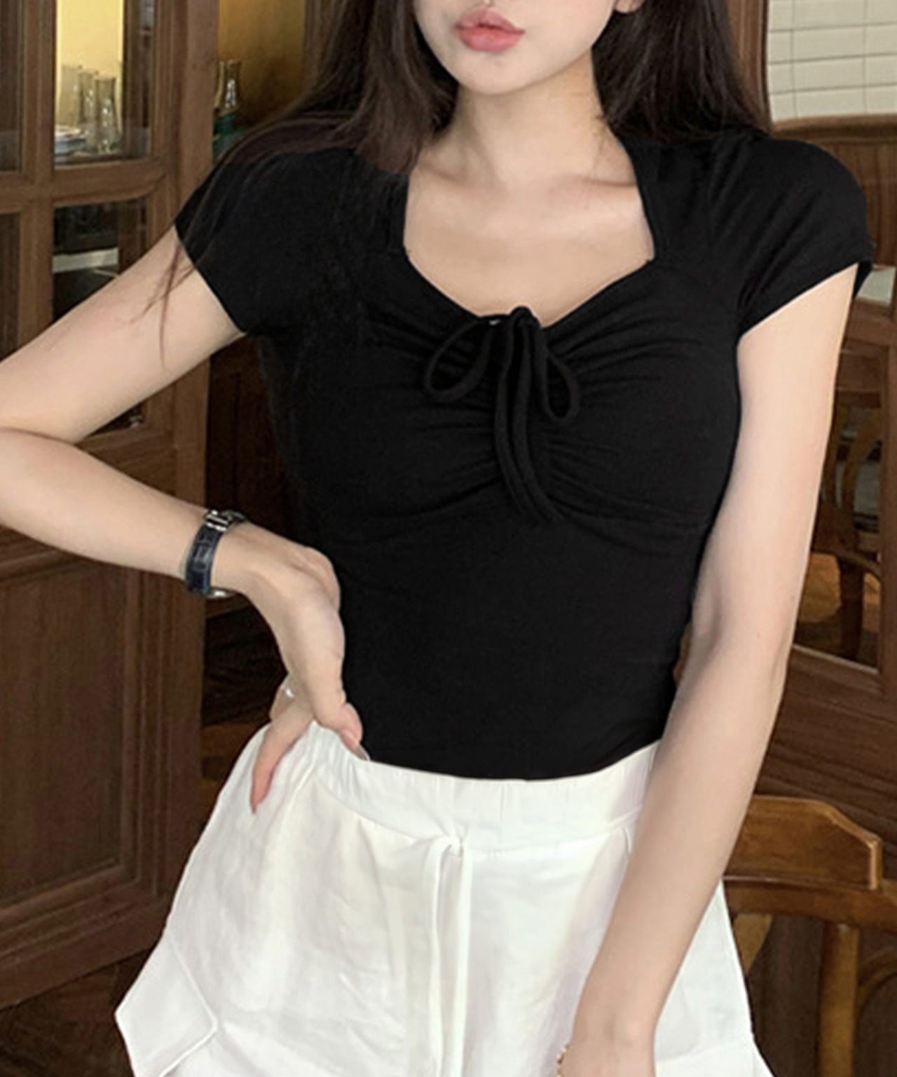 スクエアネック×ドローストリングのレディース半袖Tシャツ。