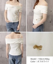 オフショル×華奢ストラップが、デコルテをすっきりきれいに見せる。