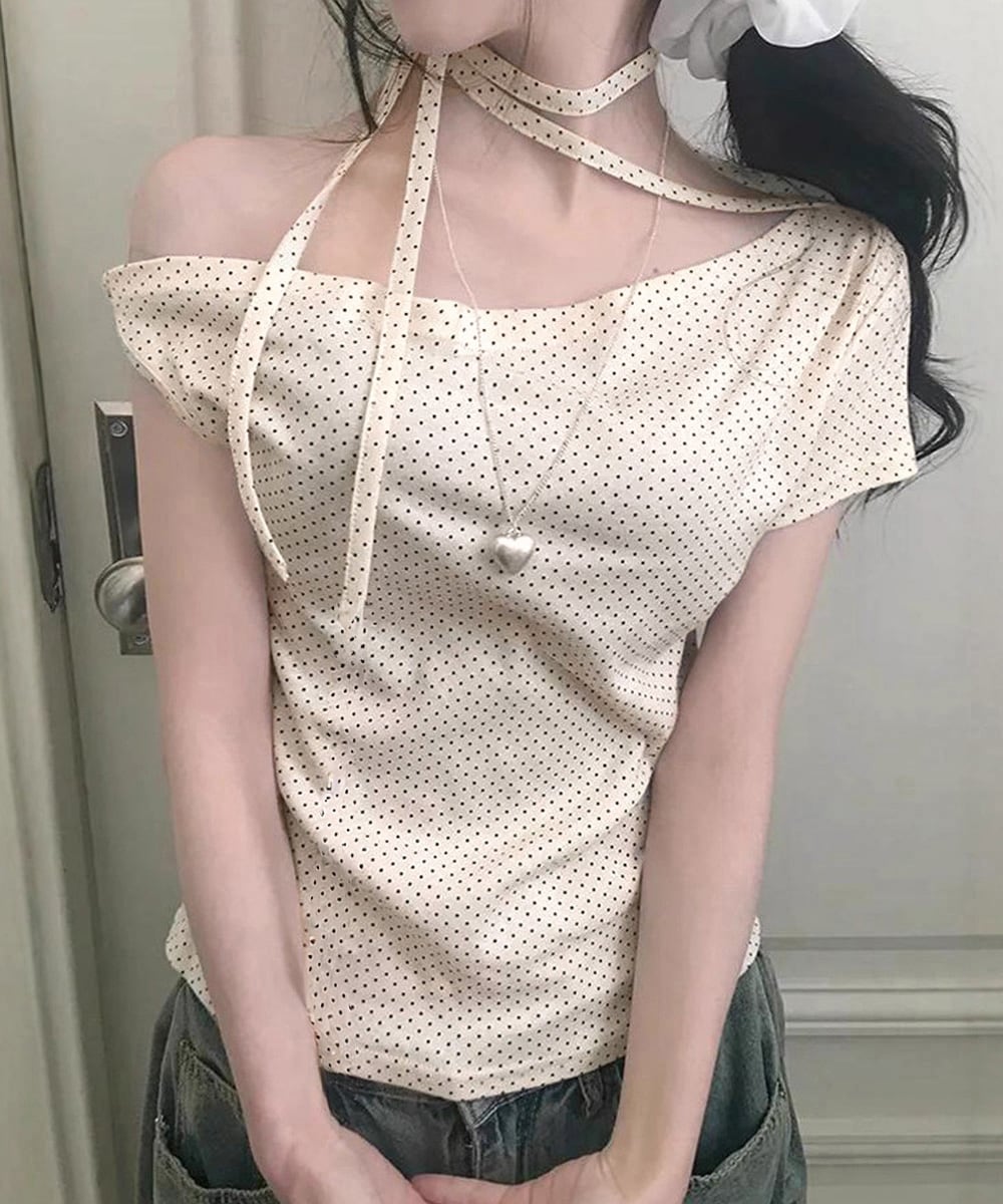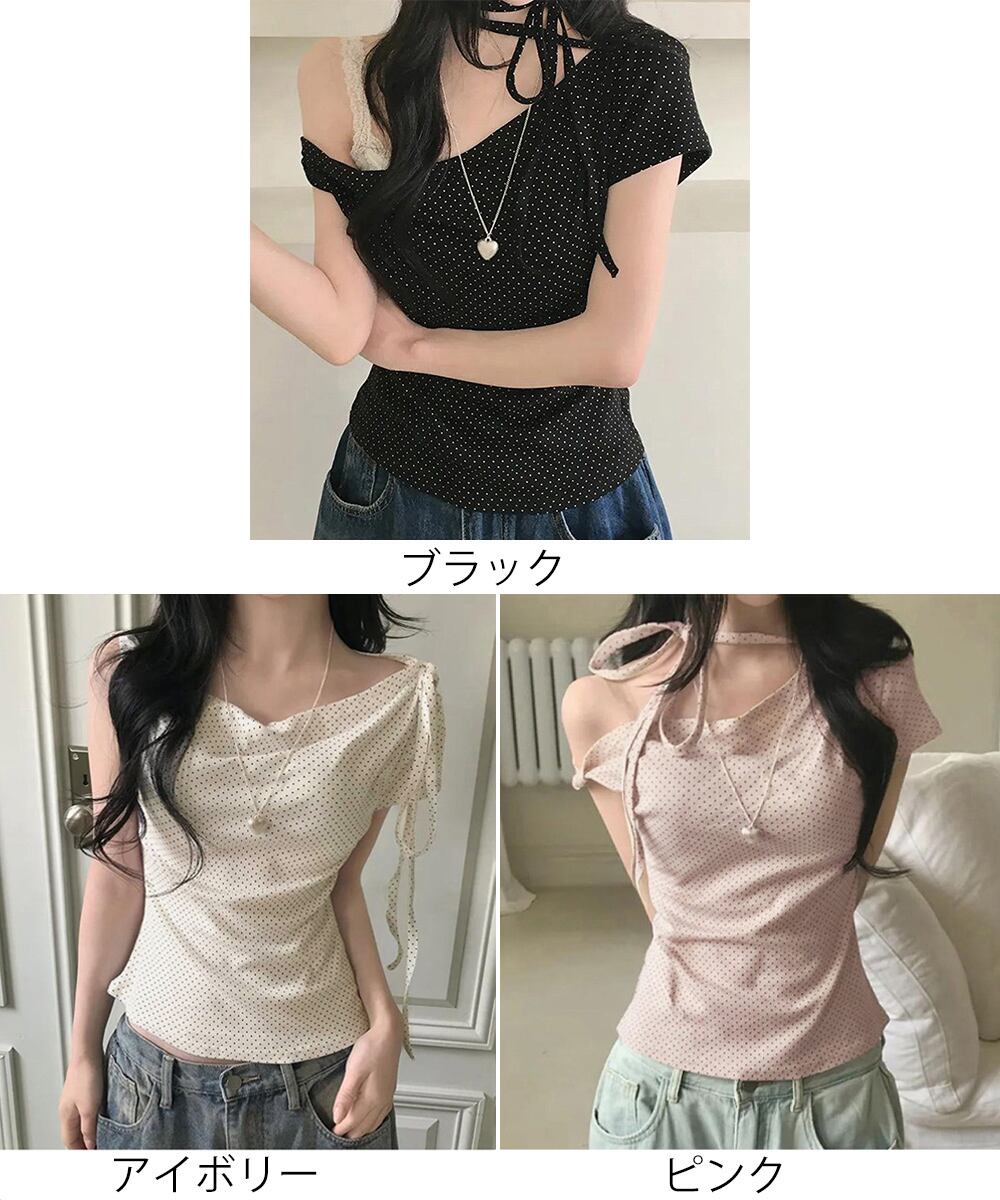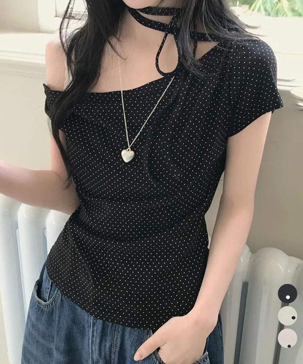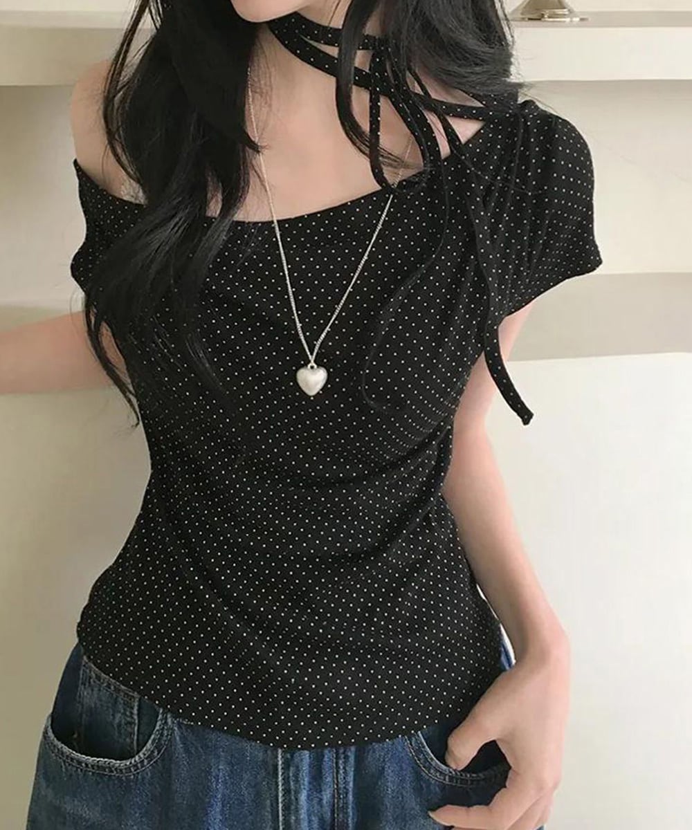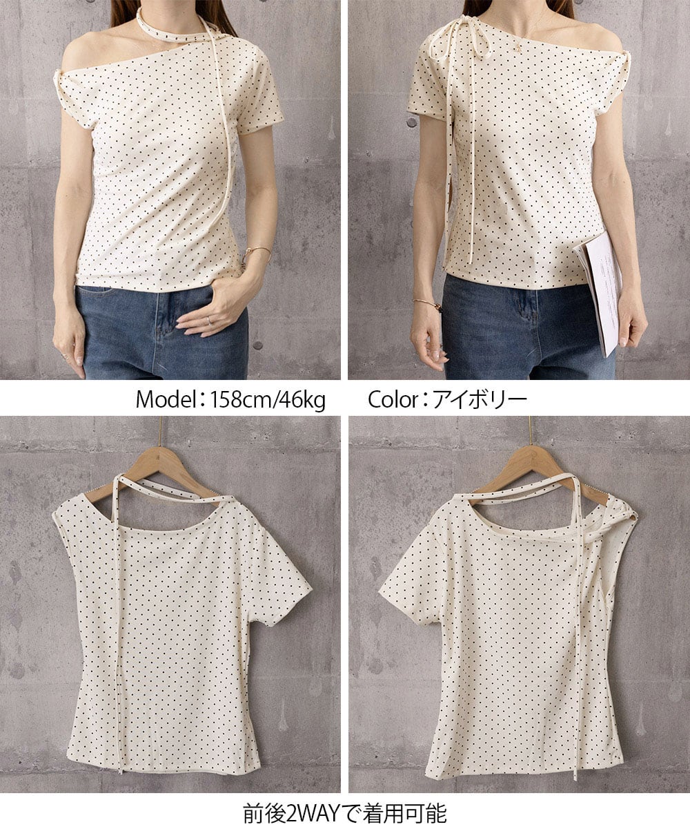水玉柄が映える、オフショルダー×リボンデザインのレディース半袖Tシャツ。
